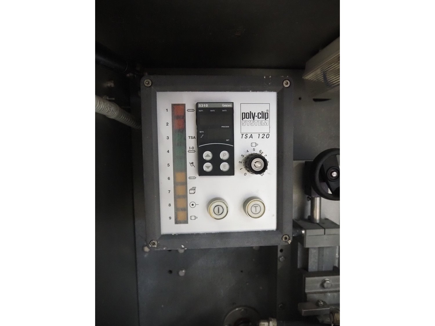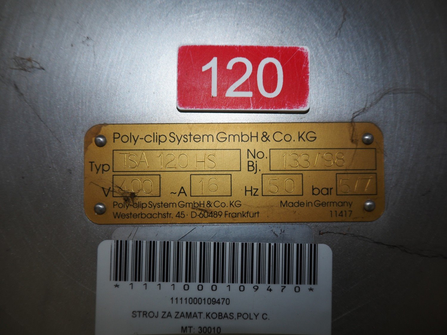 Poly-clip System GmbH & Co. KG automatic clipping and sealing machine, type: TSA 120 HS, number: 133, year of construction: 1998, 400 V, 50 Hz, 16 A, air pressure: 5/7 bar, dimensions: 1400 mm x 980 mm x 1660 mm. Kavel locatie: Looyenbeemd 11, 5652 BH Eindhoven, Nederland