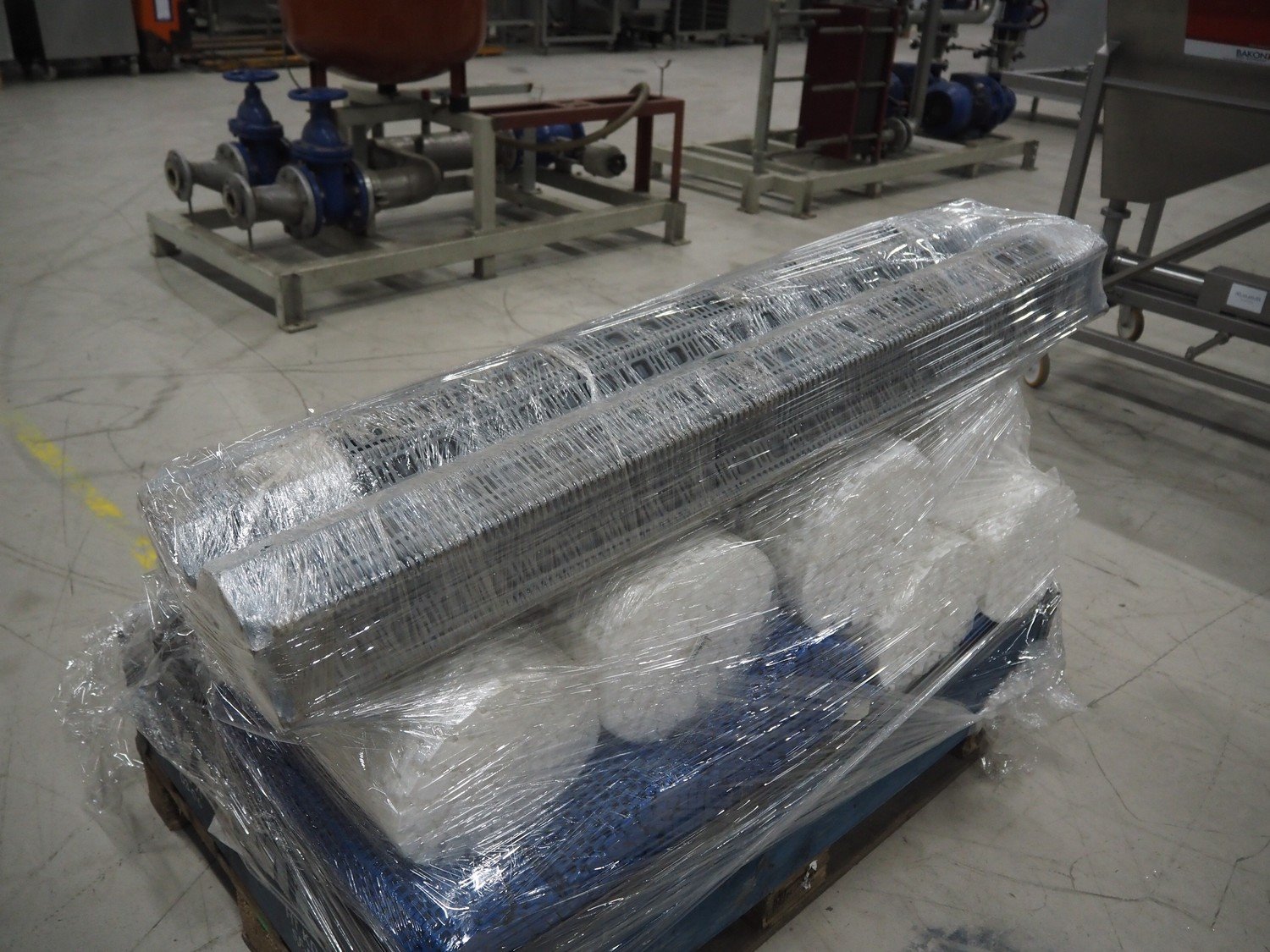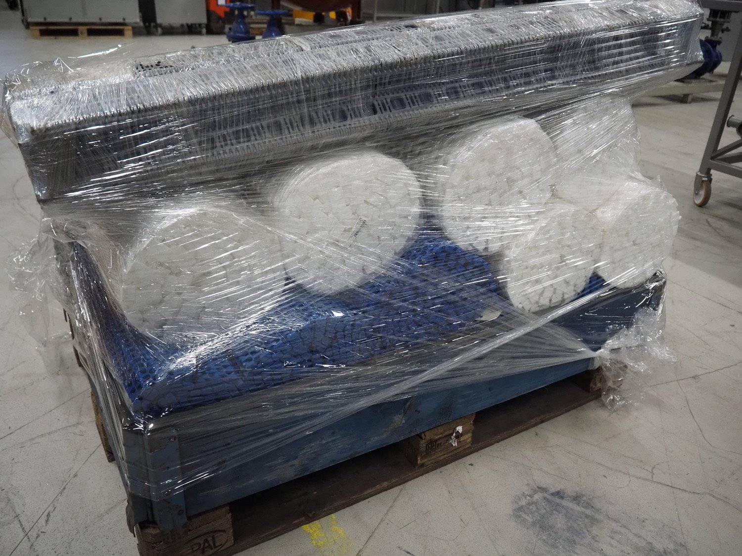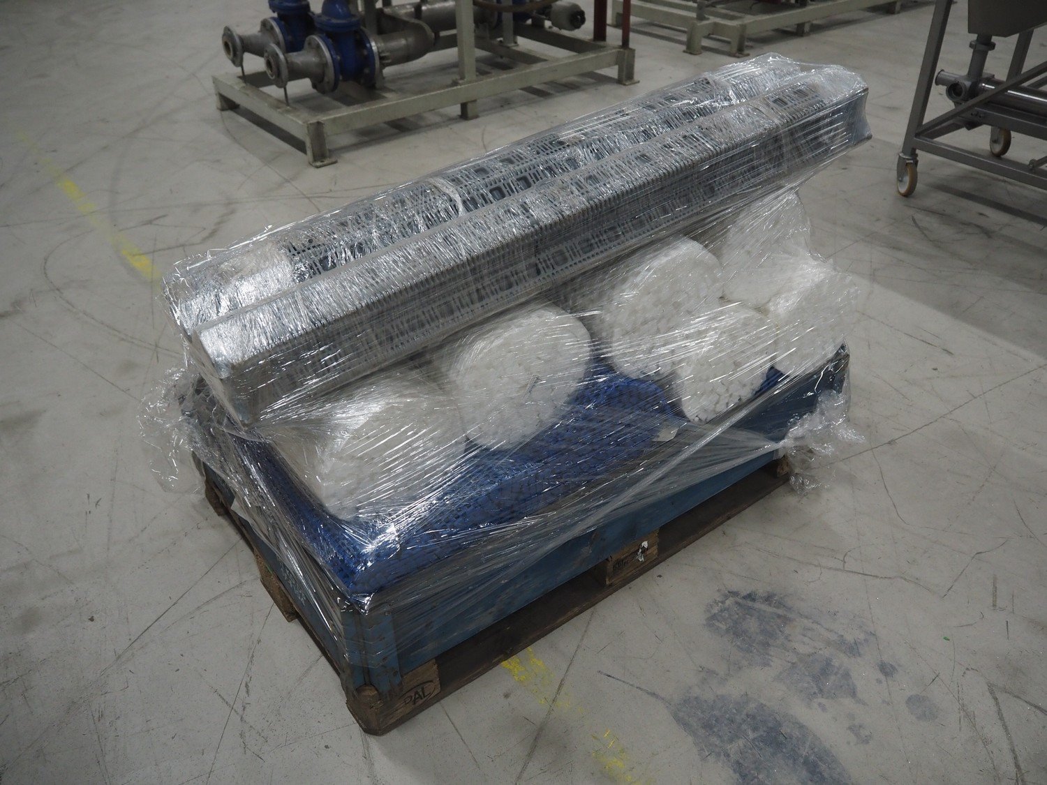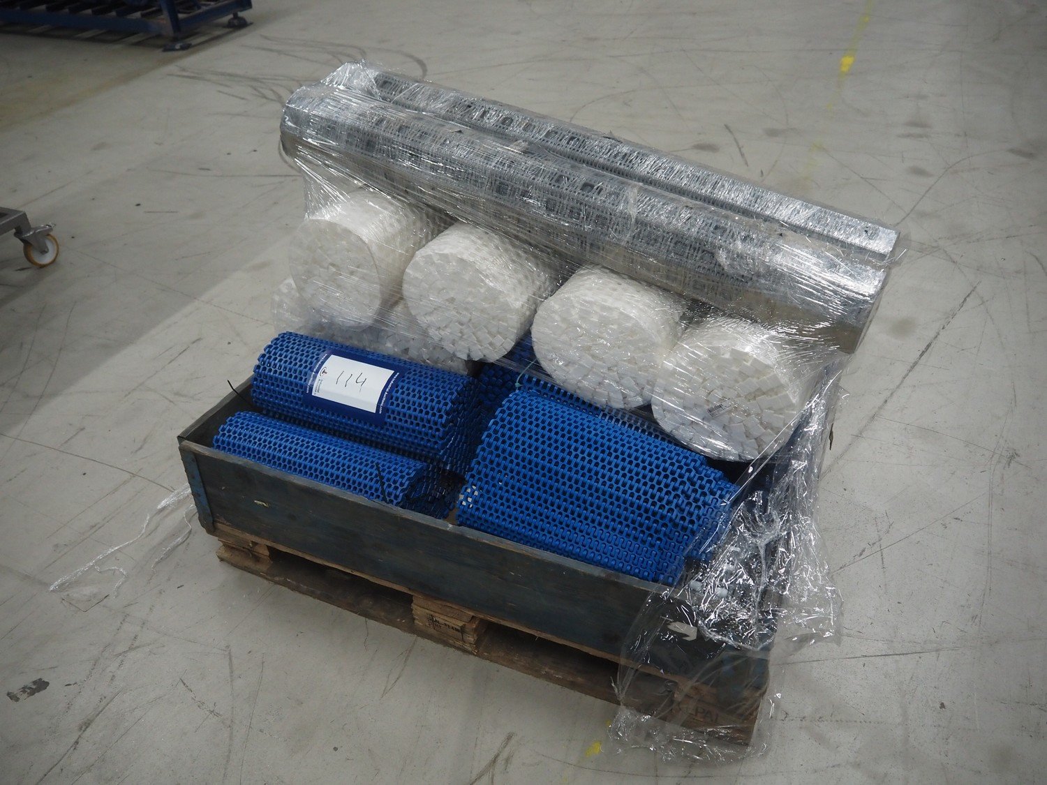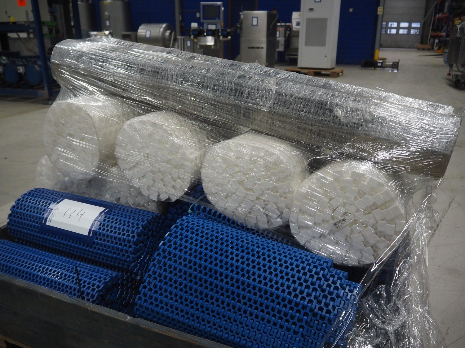 Pallet with various plastic mesh belts, belt width: 360 mm / 450 mm / 460 mm / 1200 mm, total dimensions: 1200 mm x 800 mm x 1200 mm. Kavel locatie: Looyenbeemd 11, 5652 BH Eindhoven, Nederland
