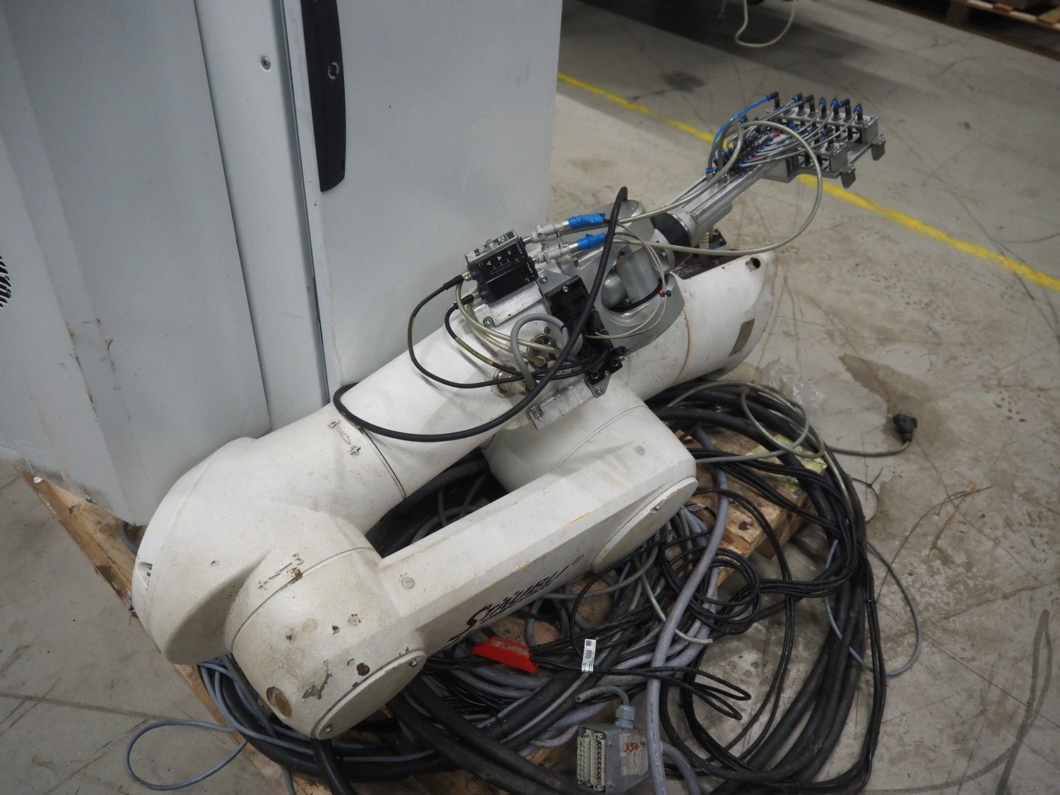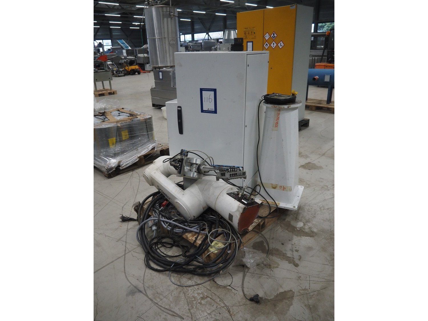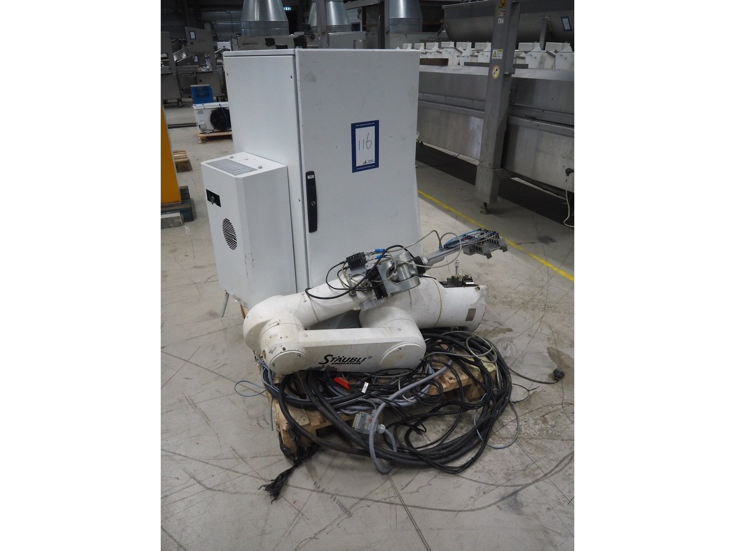 Stäubli / AP Artaplast AB robot, type: TX90 L, number: F04/502EA1/A/01, weight: 113 kg, capacity: 5 kg, dimensions robot arm: 1100 mm x 450 mm x 500 mm, dimensions switch cabinet: 700 mm x 500 mm x 1500 mm. Kavel locatie: Looyenbeemd 11, 5652 BH Eindhoven, Nederland