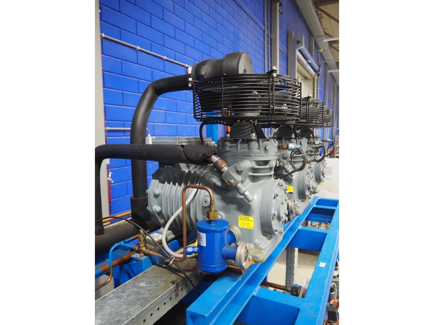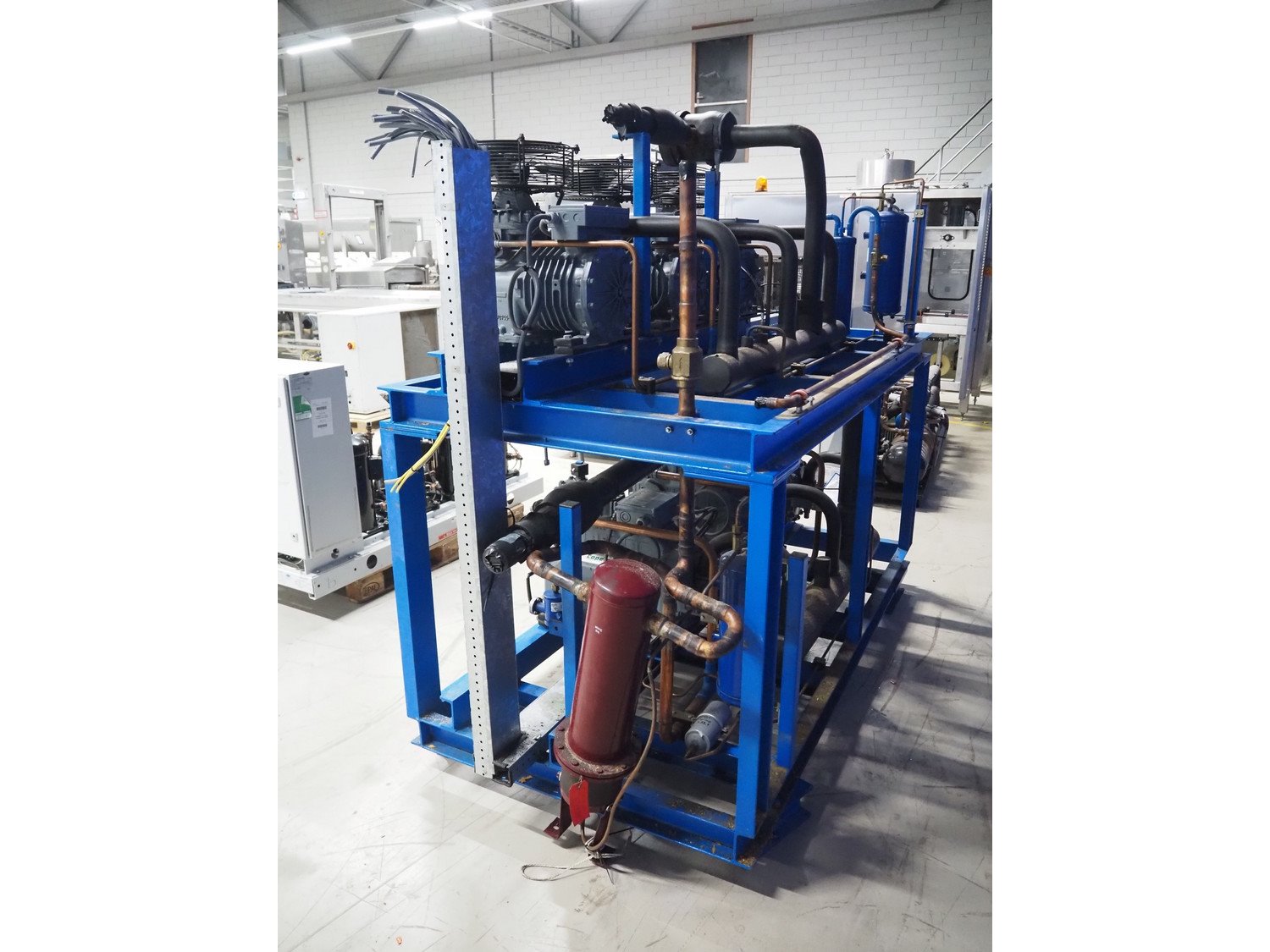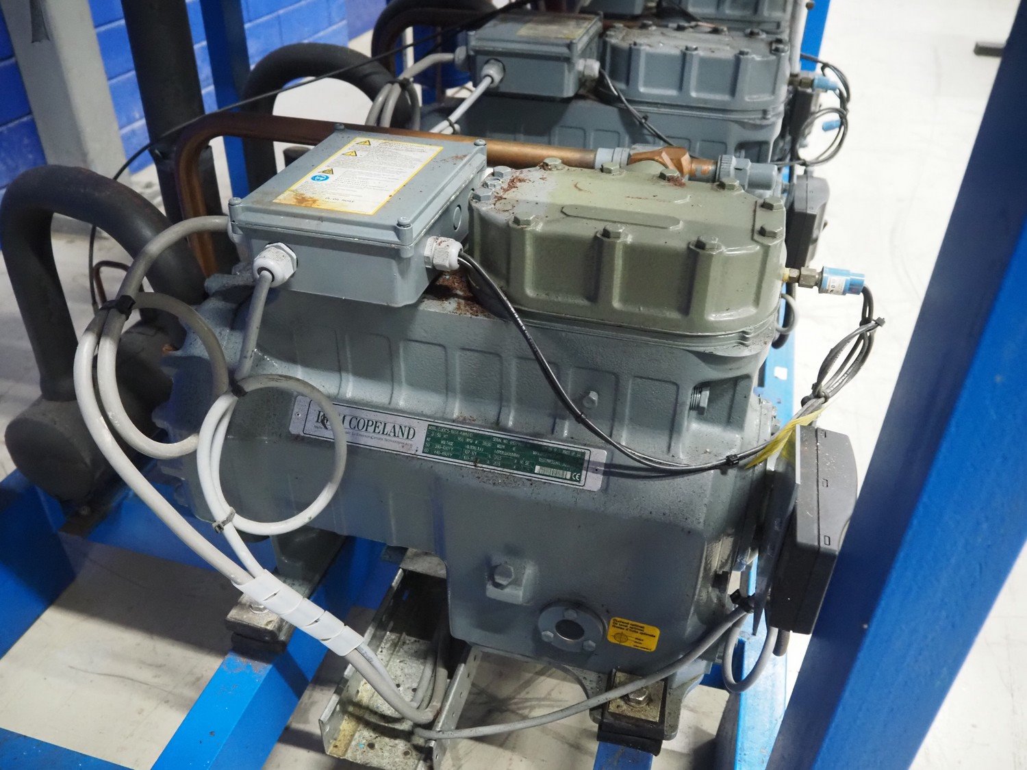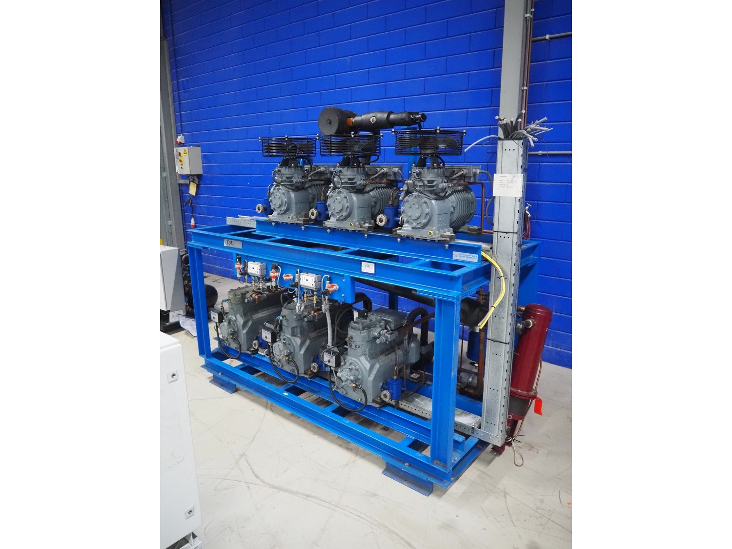 DMW Copeland compressor rack with 6 cooling compressors, compressor type: (1x) D3DC5-1000X-AWM/D, capacity: 38 m³ per hour, (1x) D3DC4-100X-AWM/D, capacity: 38 m³ per hour, (1x) D3DA5-75XH-AWM/D, capacity: 32.20 m³ per hour, (3x) DLSGP-40X-EWL, capacity: 22.50 m³ per hour, dimensions: 2400 mm x 1150 mm x 2000 mm. Kavel locatie: Looyenbeemd 11, 5652 BH Eindhoven, Nederland