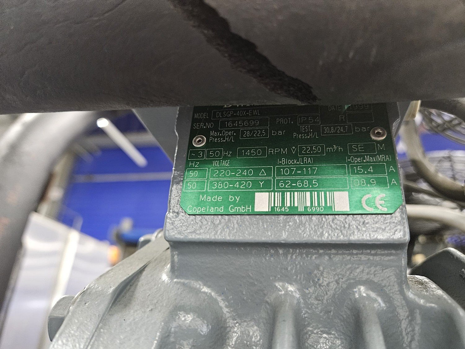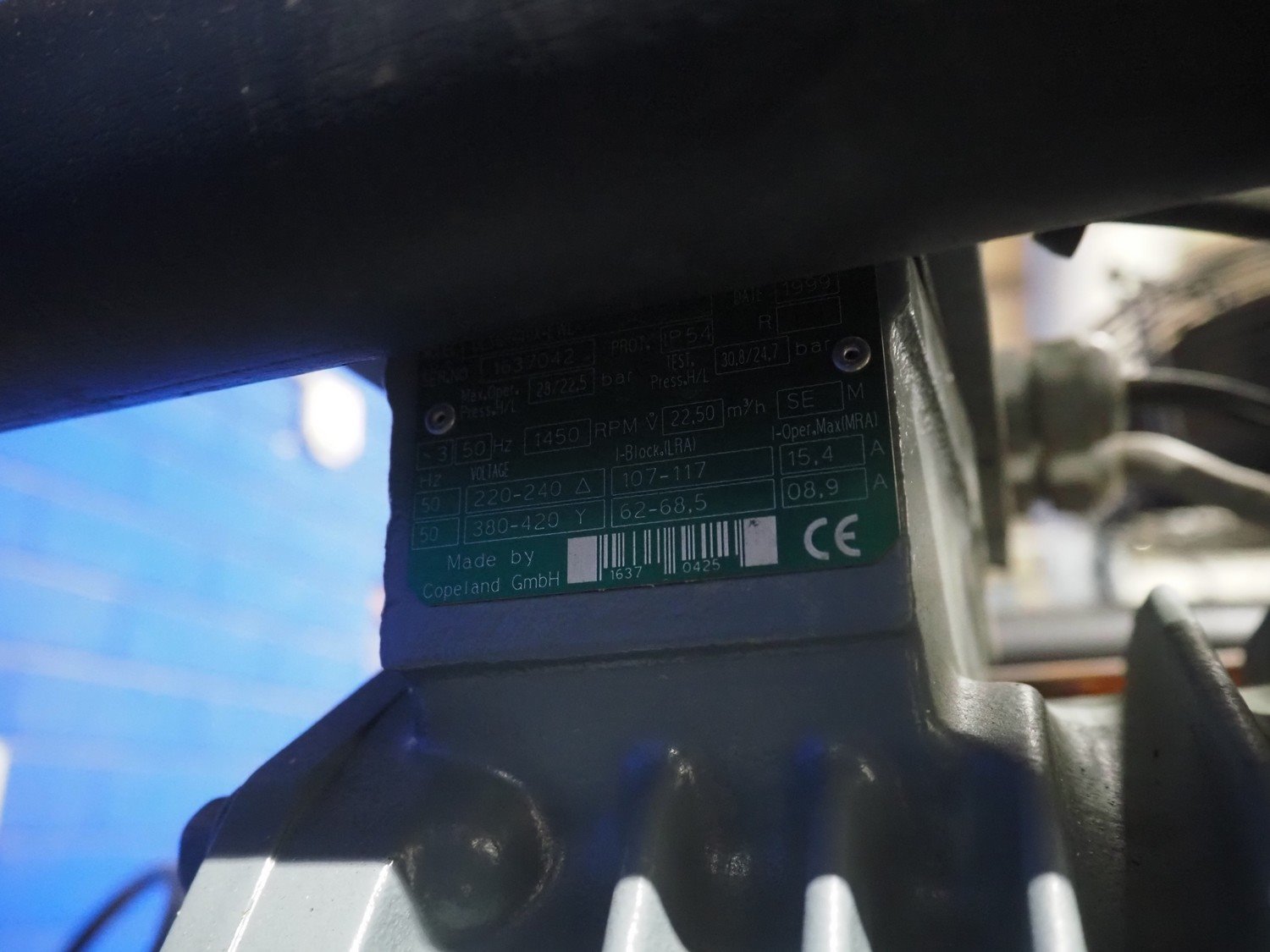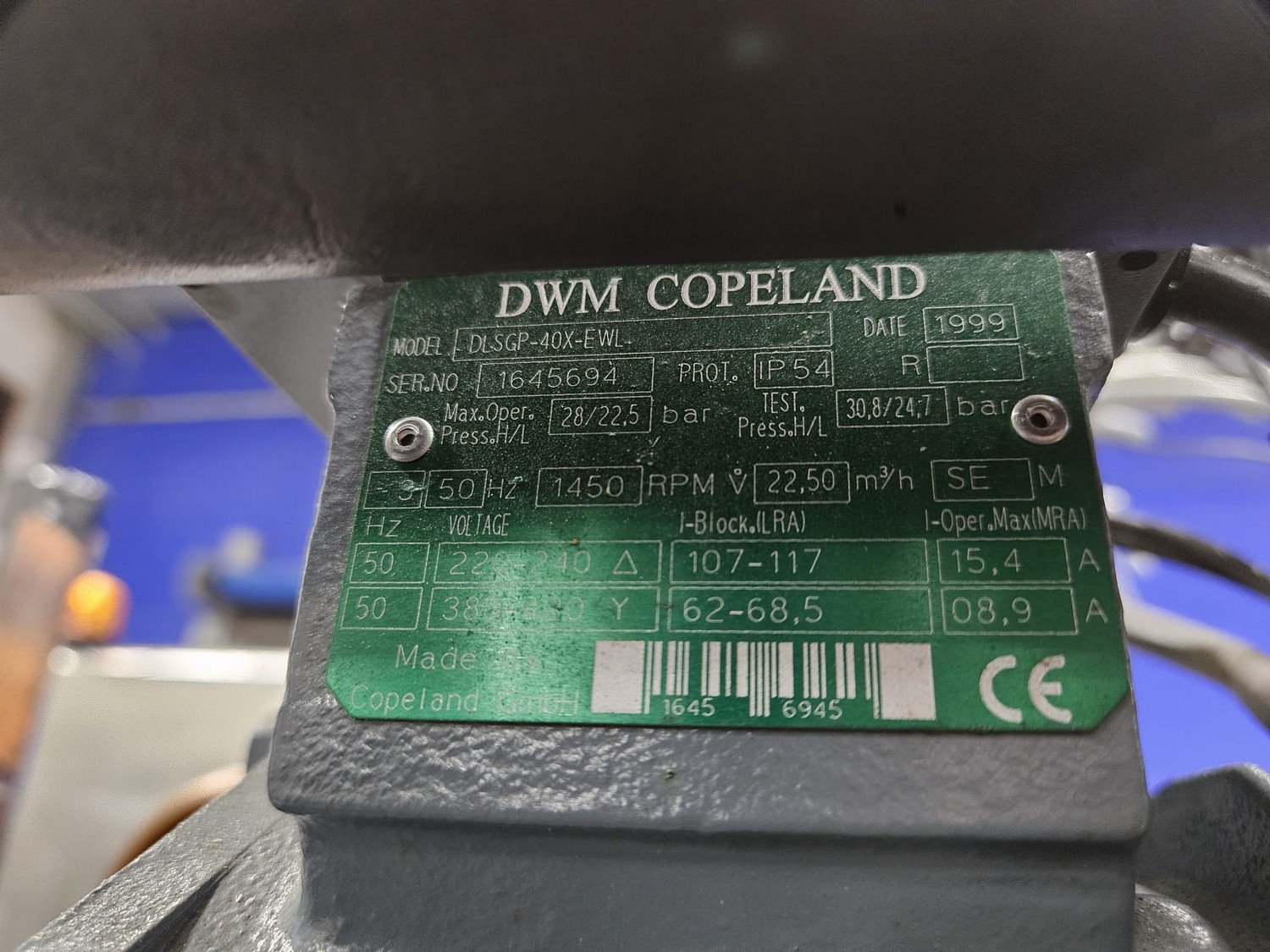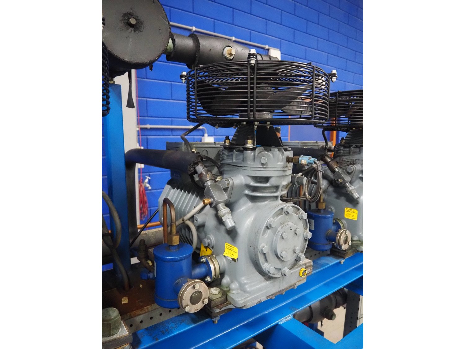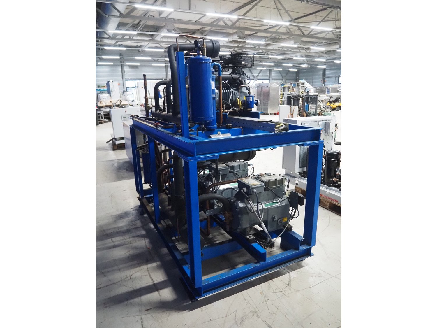 DMW Copeland compressor rack with 6 cooling compressors, compressor type: (1x) D3DC5-1000X-AWM/D, capacity: 38 m³ per hour, (1x) D3DC4-100X-AWM/D, capacity: 38 m³ per hour, (1x) D3DA5-75XH-AWM/D, capacity: 32.20 m³ per hour, (3x) DLSGP-40X-EWL, capacity: 22.50 m³ per hour, dimensions: 2400 mm x 1150 mm x 2000 mm. Kavel locatie: Looyenbeemd 11, 5652 BH Eindhoven, Nederland