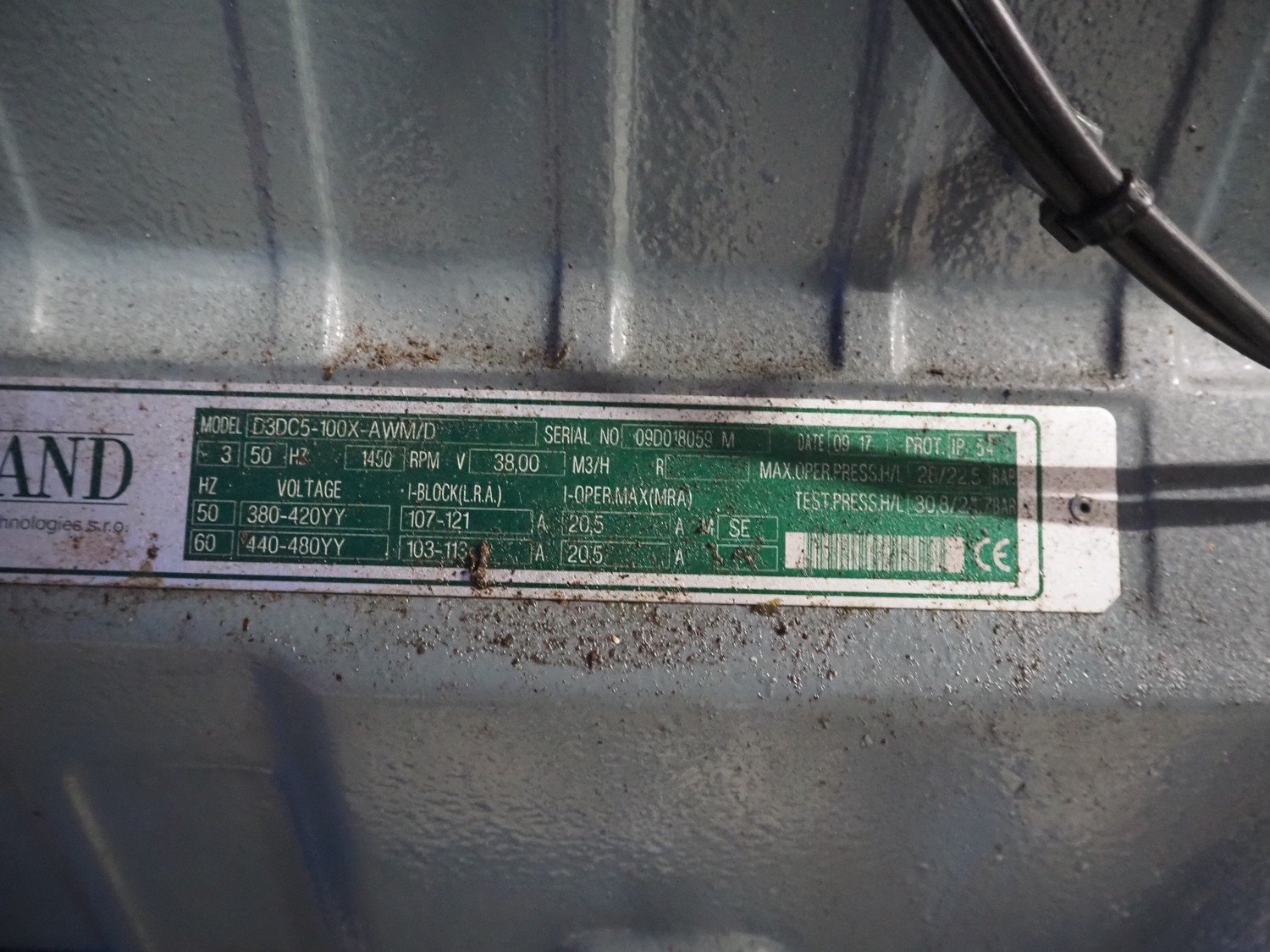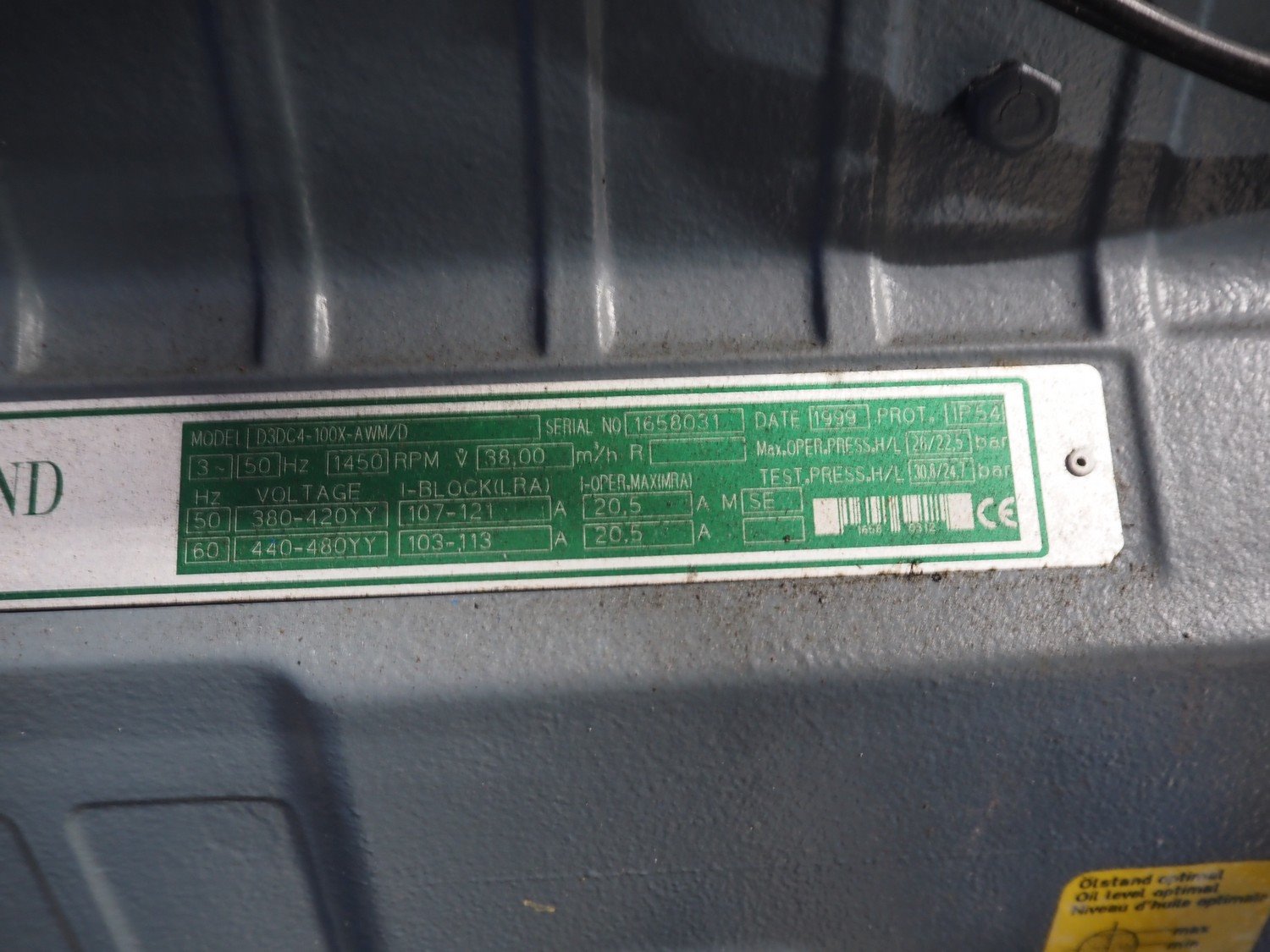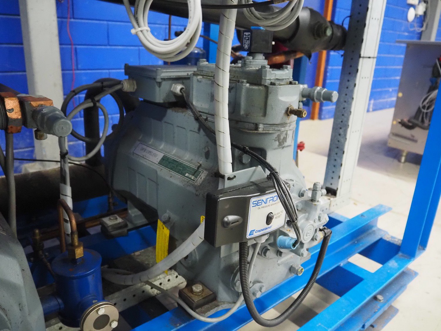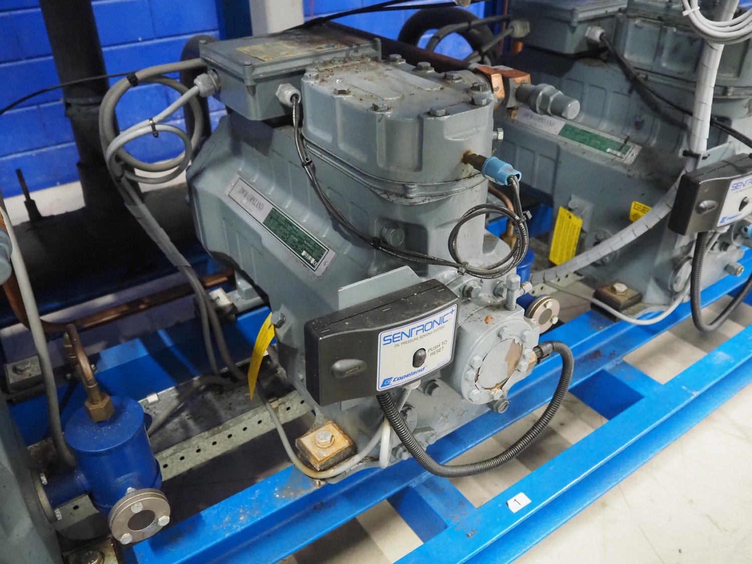 DMW Copeland compressor rack with 6 cooling compressors, compressor type: (1x) D3DC5-1000X-AWM/D, capacity: 38 m³ per hour, (1x) D3DC4-100X-AWM/D, capacity: 38 m³ per hour, (1x) D3DA5-75XH-AWM/D, capacity: 32.20 m³ per hour, (3x) DLSGP-40X-EWL, capacity: 22.50 m³ per hour, dimensions: 2400 mm x 1150 mm x 2000 mm. Kavel locatie: Looyenbeemd 11, 5652 BH Eindhoven, Nederland
