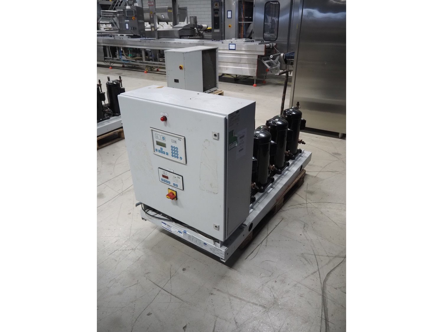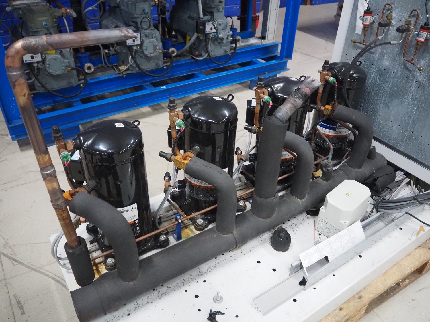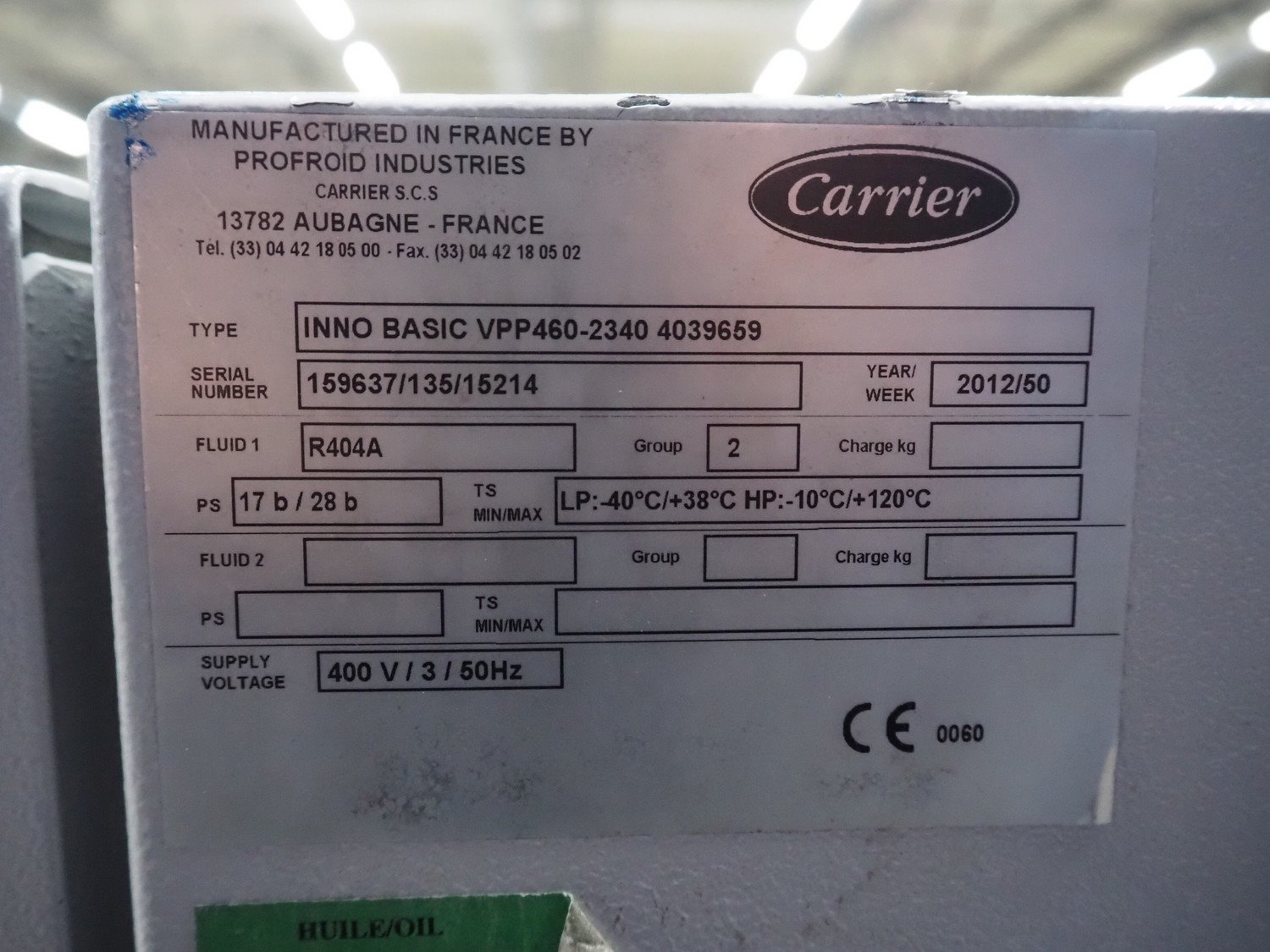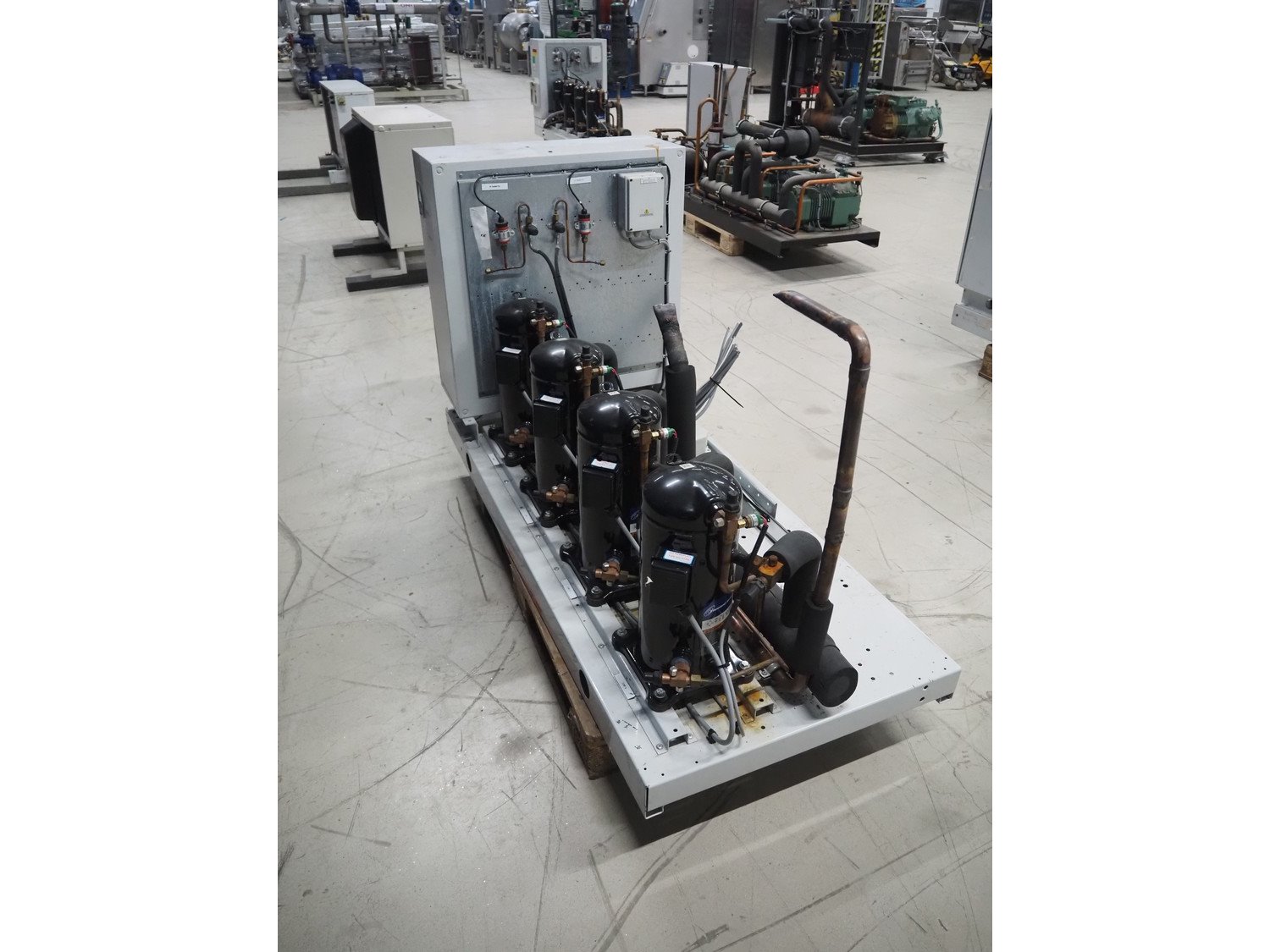 Carrier compressor rack with 4 Copeland scroll cooling compressors, compressor rack type: INNO BASIC VPP460-2340 4039659, serial number: 159637/135/15214, year of construction: 2012, 400 V, 3 Ph, 50 Hz, refrigerant: R404A, Copeland scroll compressor type: (4x) ZB38KCE-TFD-551, capacity: 14.41/17.34 m³ per hour, dimensions: 1700 mm x 800 mm x 1000 mm. Kavel locatie: Looyenbeemd 11, 5652 BH Eindhoven, Nederland