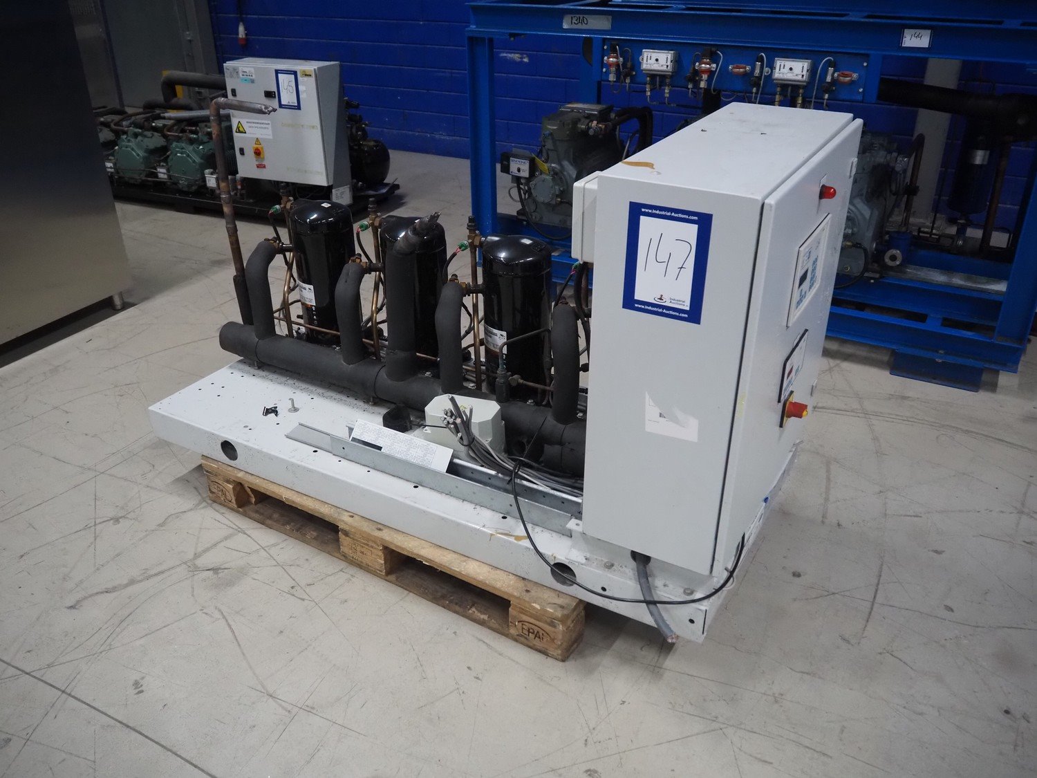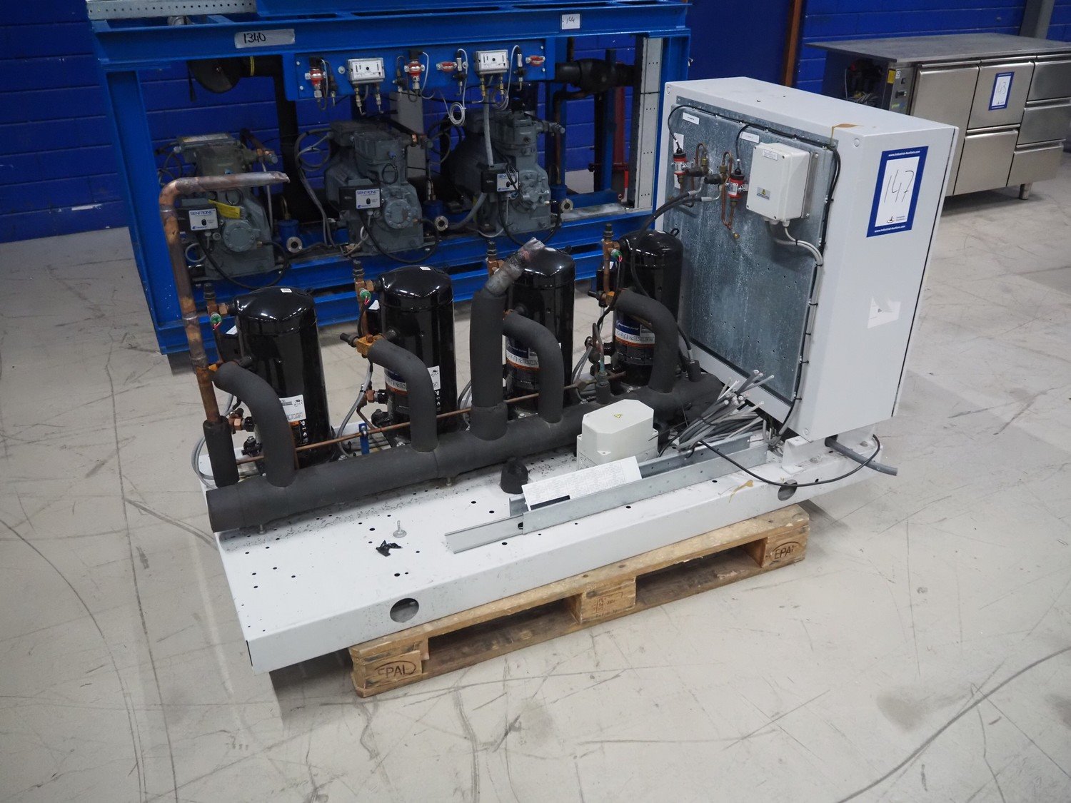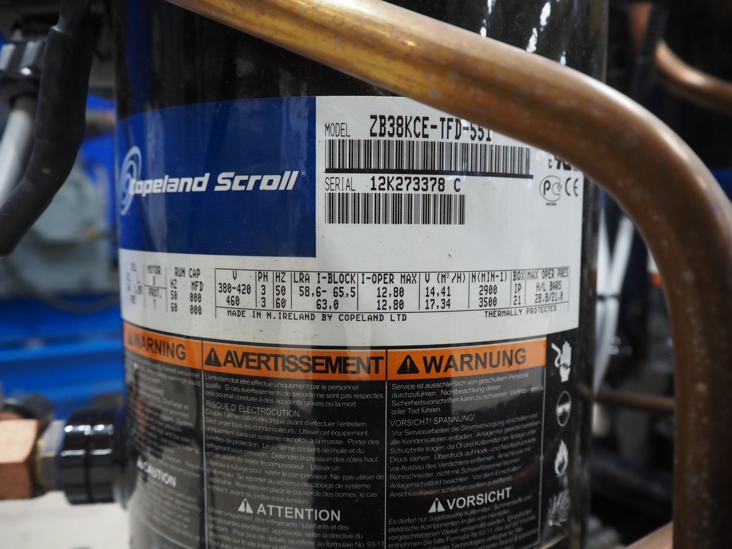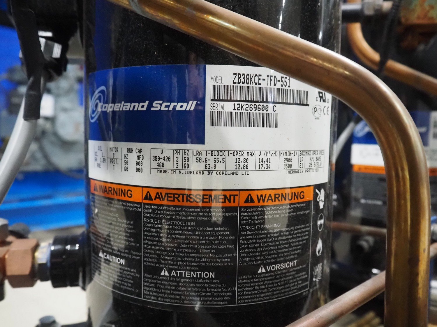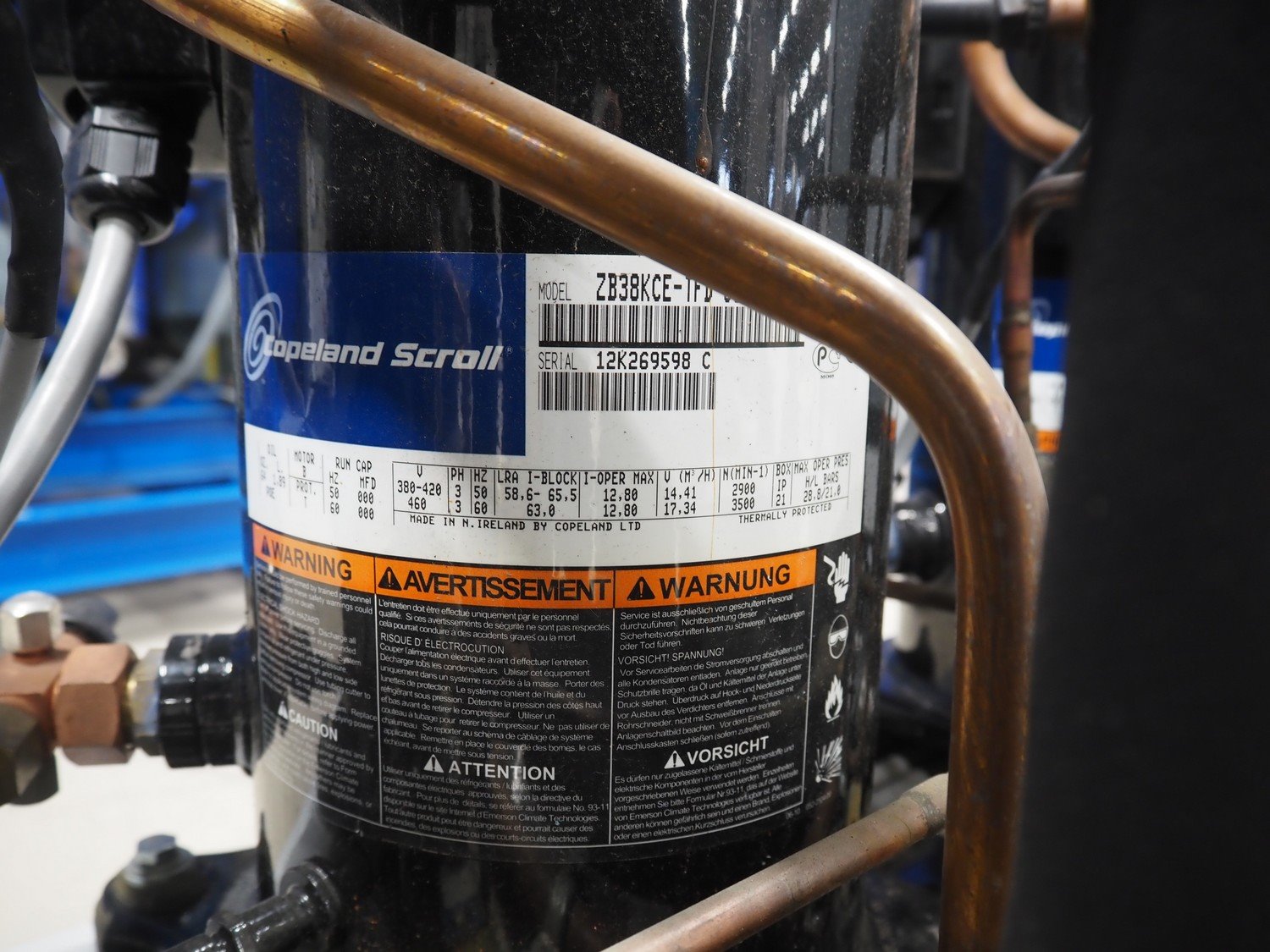 Carrier compressor rack with 4 Copeland scroll cooling compressors, compressor rack type: INNO BASIC VPP460-2340 4039659, serial number: 159637/135/15214, year of construction: 2012, 400 V, 3 Ph, 50 Hz, refrigerant: R404A, Copeland scroll compressor type: (4x) ZB38KCE-TFD-551, capacity: 14.41/17.34 m³ per hour, dimensions: 1700 mm x 800 mm x 1000 mm. Kavel locatie: Looyenbeemd 11, 5652 BH Eindhoven, Nederland