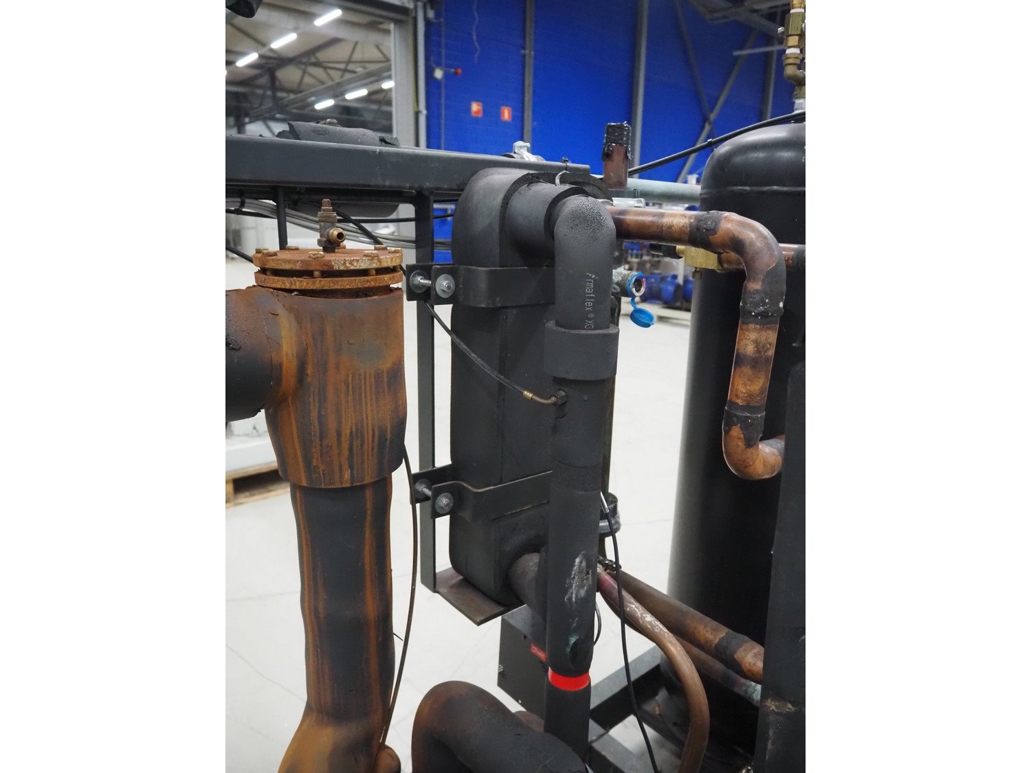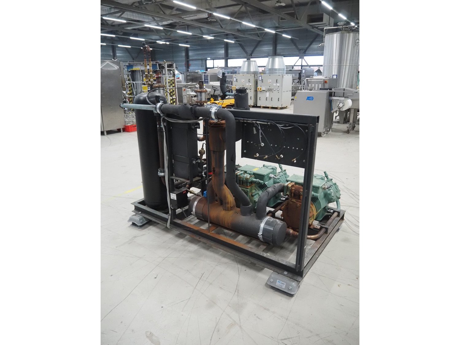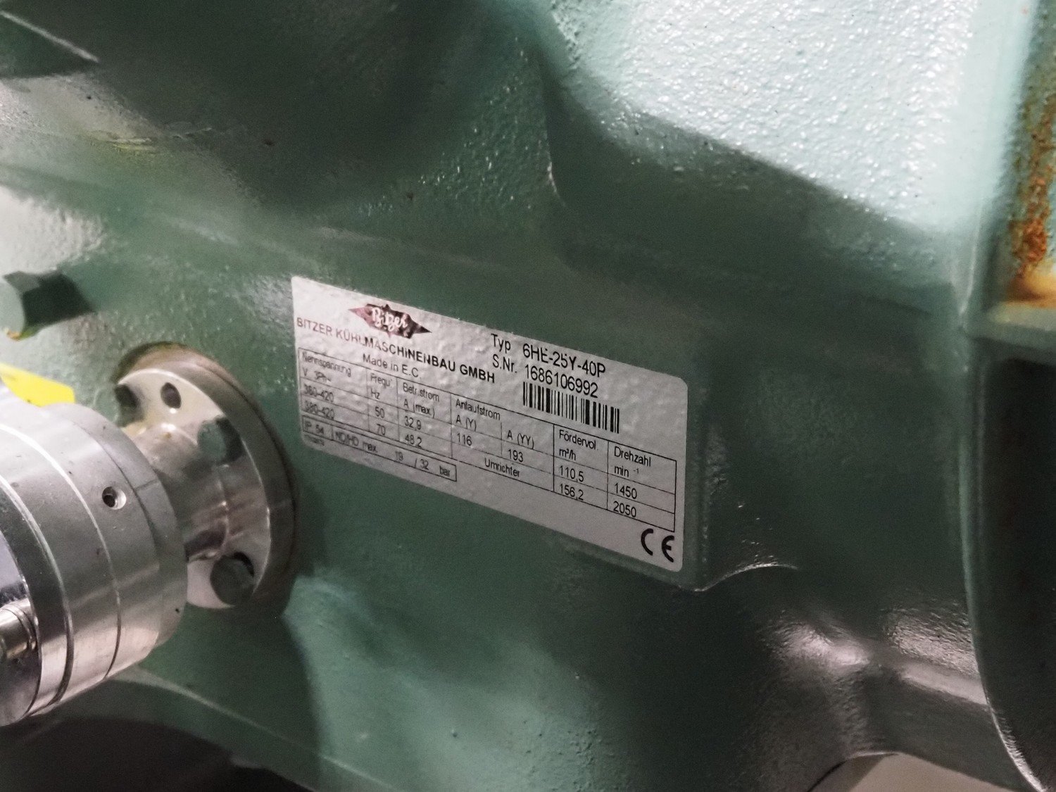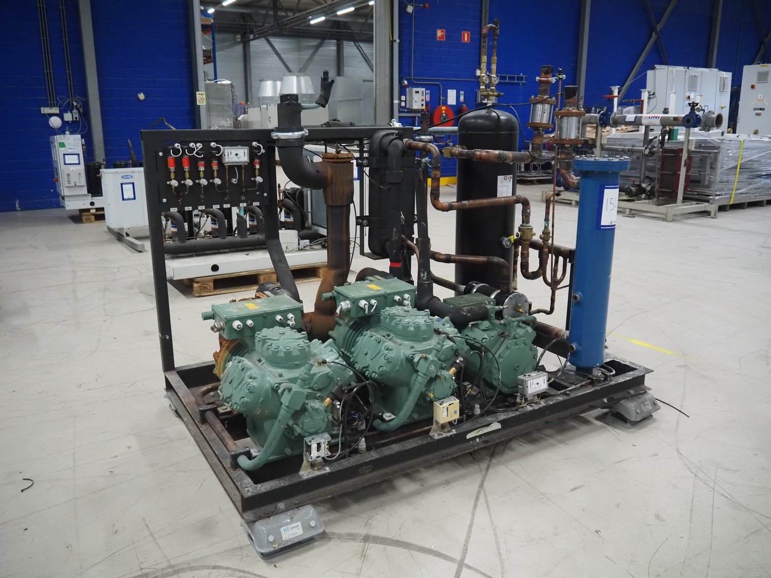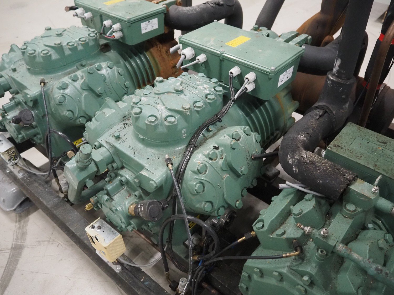 Bitzer Kühlmaschinenbau GmbH compressor rack with 3 cooling compressors, type: (2x) 6HE-25Y-40P, capacity: 110.5/156.2 m³ per hour, (1x) 4EES-6Y-40S, capacity: 22.7/27.4 m³ per hour, dimensions: 2000 mm x 1300 mm x 1850 mm. Kavel locatie: Looyenbeemd 11, 5652 BH Eindhoven, Nederland