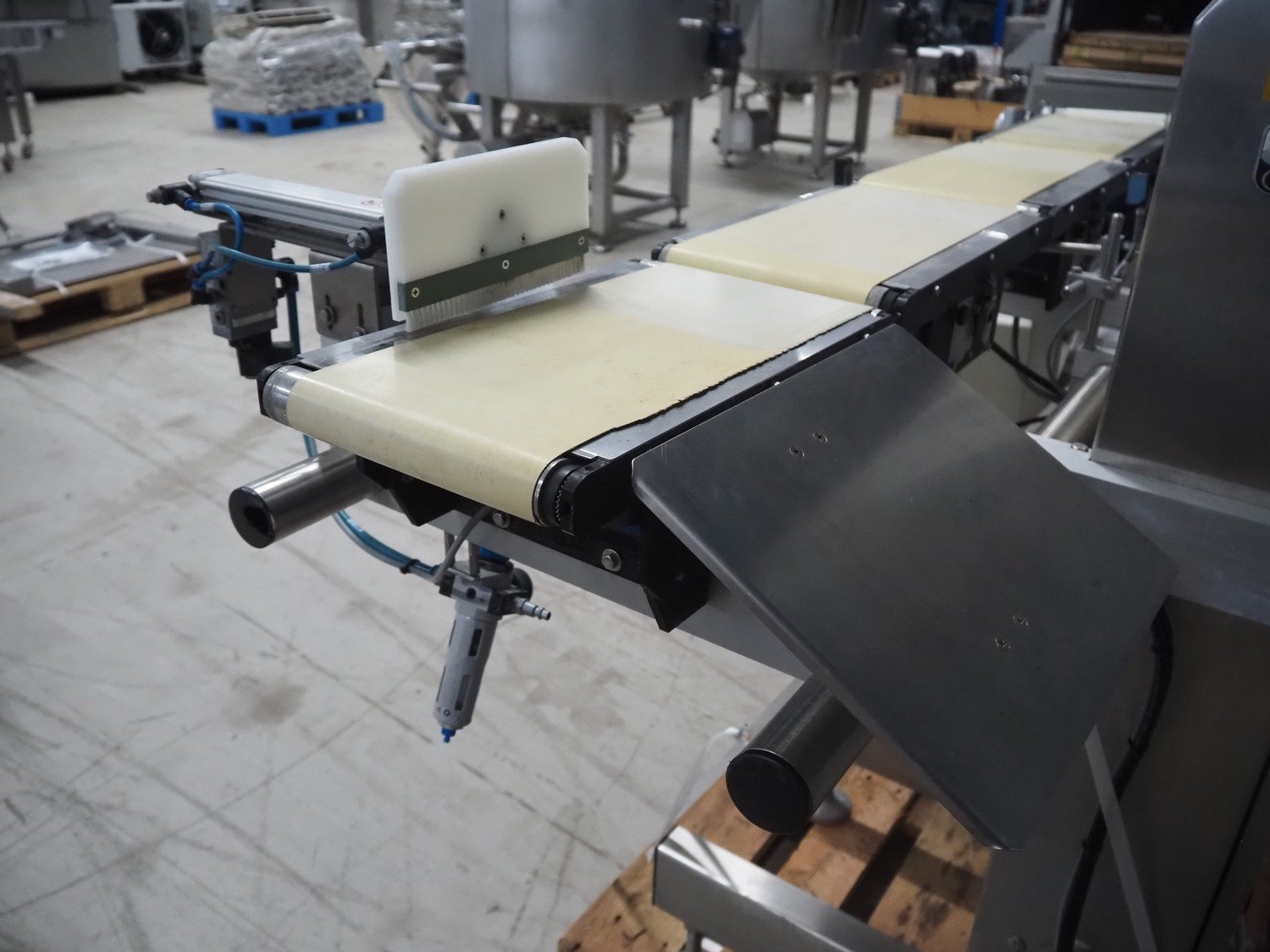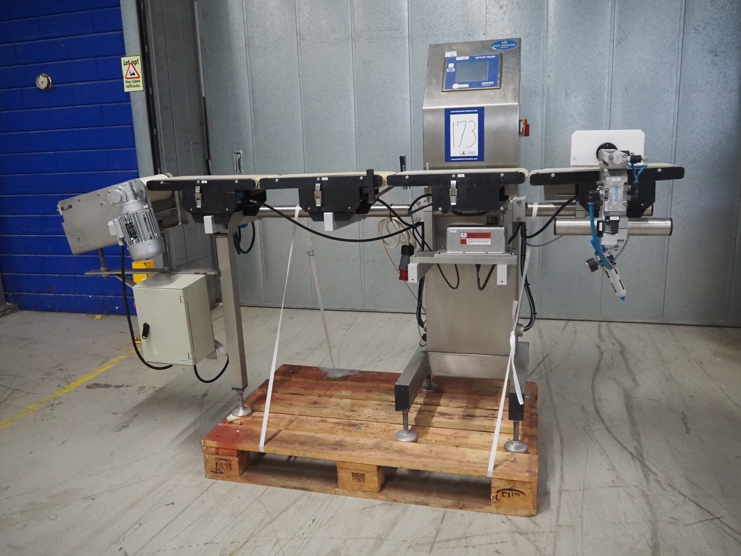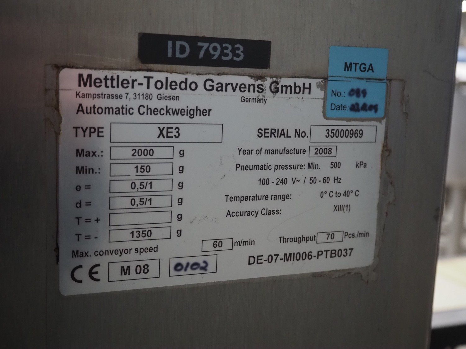 Mettler-Toledo Garvens GmbH checkweigher with rejector, type: XE3, serial number: 35000969, year of construction: 2008, 100/240 V, 1 Ph, 50/60 Hz, maximum capacity: 2000 g, minimum capacity: 150 g, e= 0.5/1 g, d= 0.5/1 g, T=- 1350 g, plastic belts, belt width: 200 mm, total dimensions: 2200 mm x 800 mm x 1450 mm. Kavel locatie: Looyenbeemd 11, 5652 BH Eindhoven, Nederland