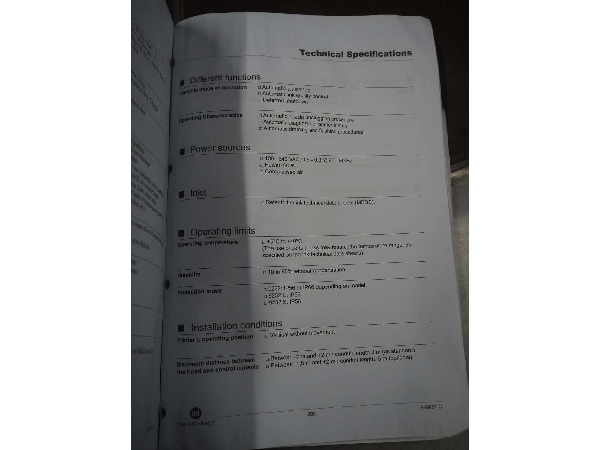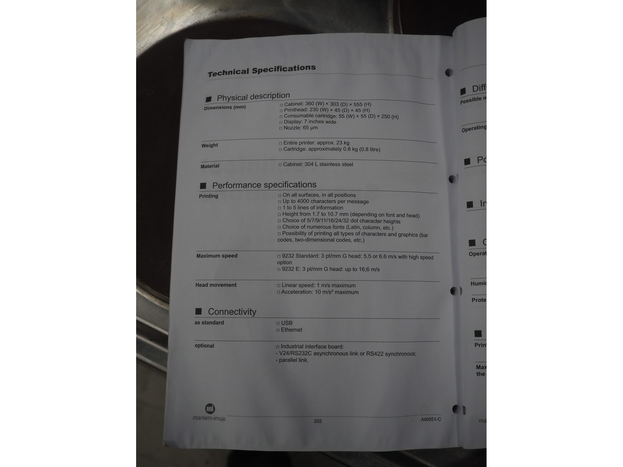 Markem-Imaje Industries inkjet printer, model: 9232, serial number: FR14290101, year of construction: 07/2014, 100/240 V, 1 Ph, 50/60 Hz, 0.5/0.3 A, dimensions: 360 mm x 330 mm x 550 mm. Kavel locatie: Looyenbeemd 11, 5652 BH Eindhoven, Nederland