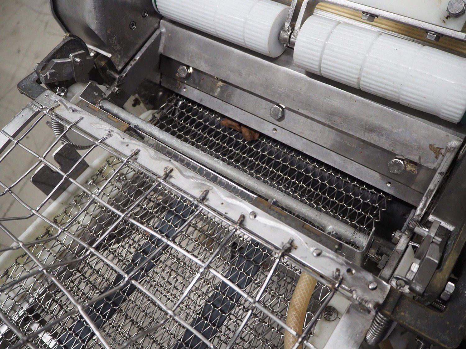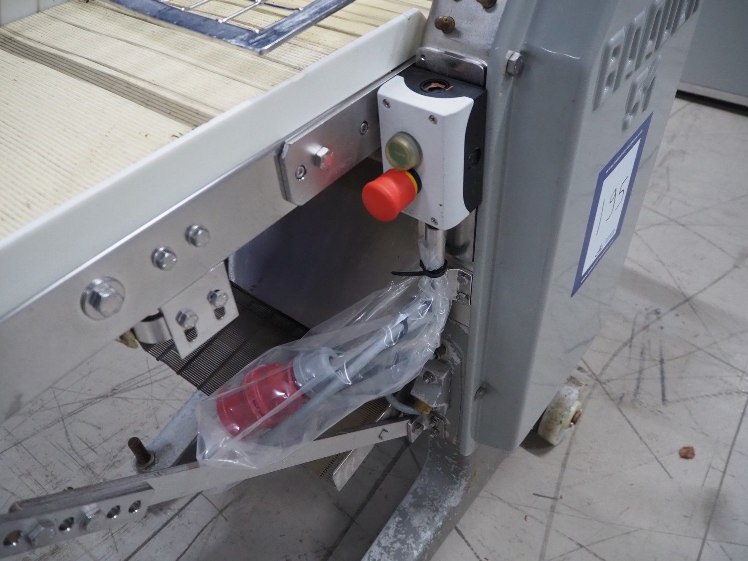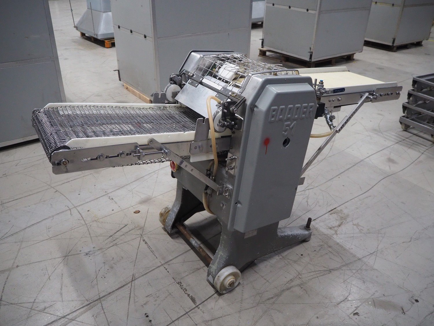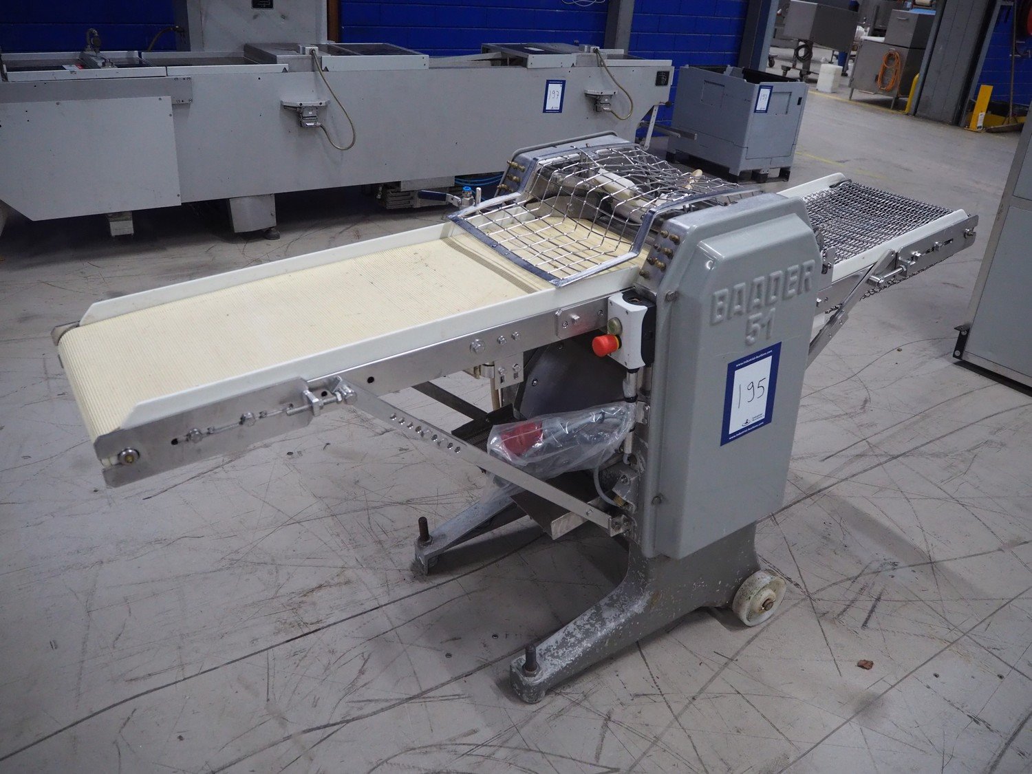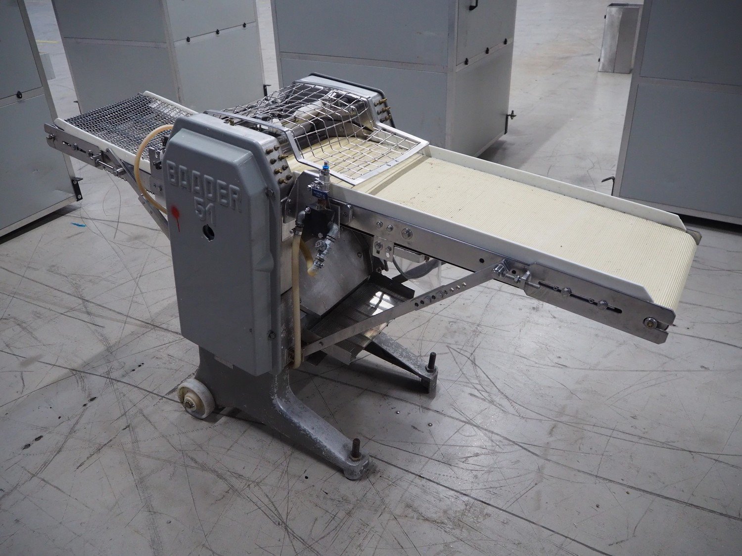 Baader skinning machine, model: 51, plastic belt, belt width: 380 mm, s/s mesh belt, belt width: 365 mm, working width: 405 mm, total dimensions: 2200 mm x 750 mm x 1100 mm. Kavel locatie: Looyenbeemd 11, 5652 BH Eindhoven, Nederland
