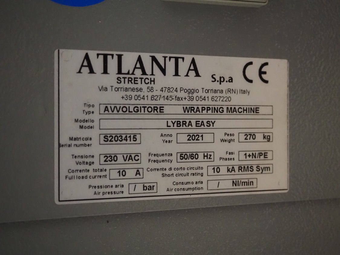 Atlanta S.p.a pallet wrapper, model: LYBRA EASY, type: AVVOLGITORE WRAPPING MACHINE, serial number: S203415, year of construction: 2021, 230 V, 1 Ph, 50/60 Hz, 10 A, weight: 270 kg, maximum film width: 520, wrapping arm length: 1100 mm, total dimensions: 1940 mm x 720 mm x 3000 mm. Kavel locatie: Looyenbeemd 11, 5652 BH Eindhoven, Nederland