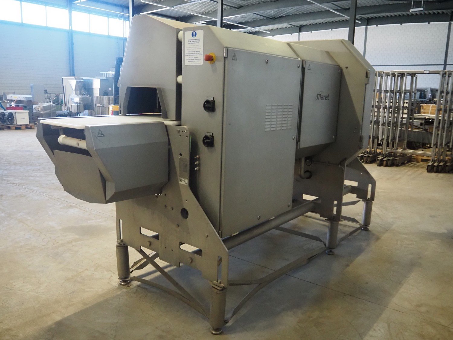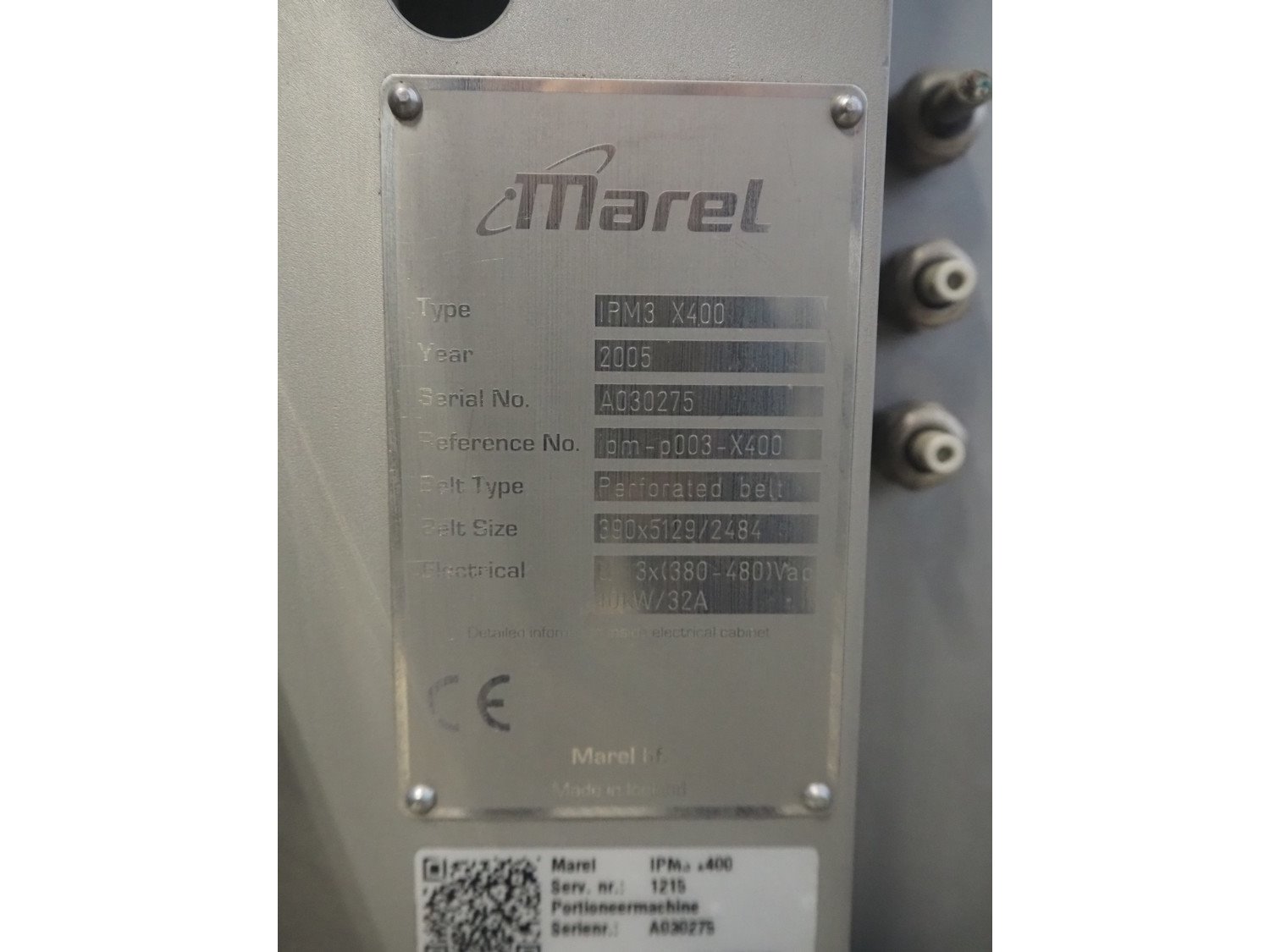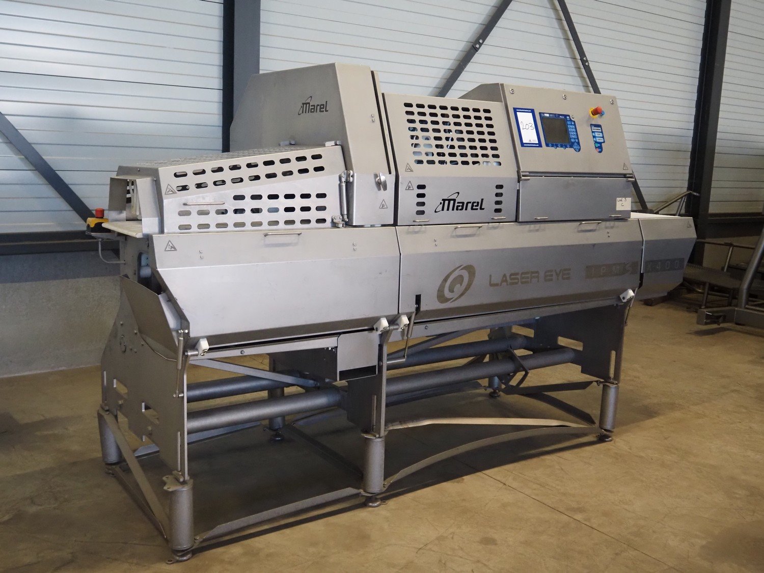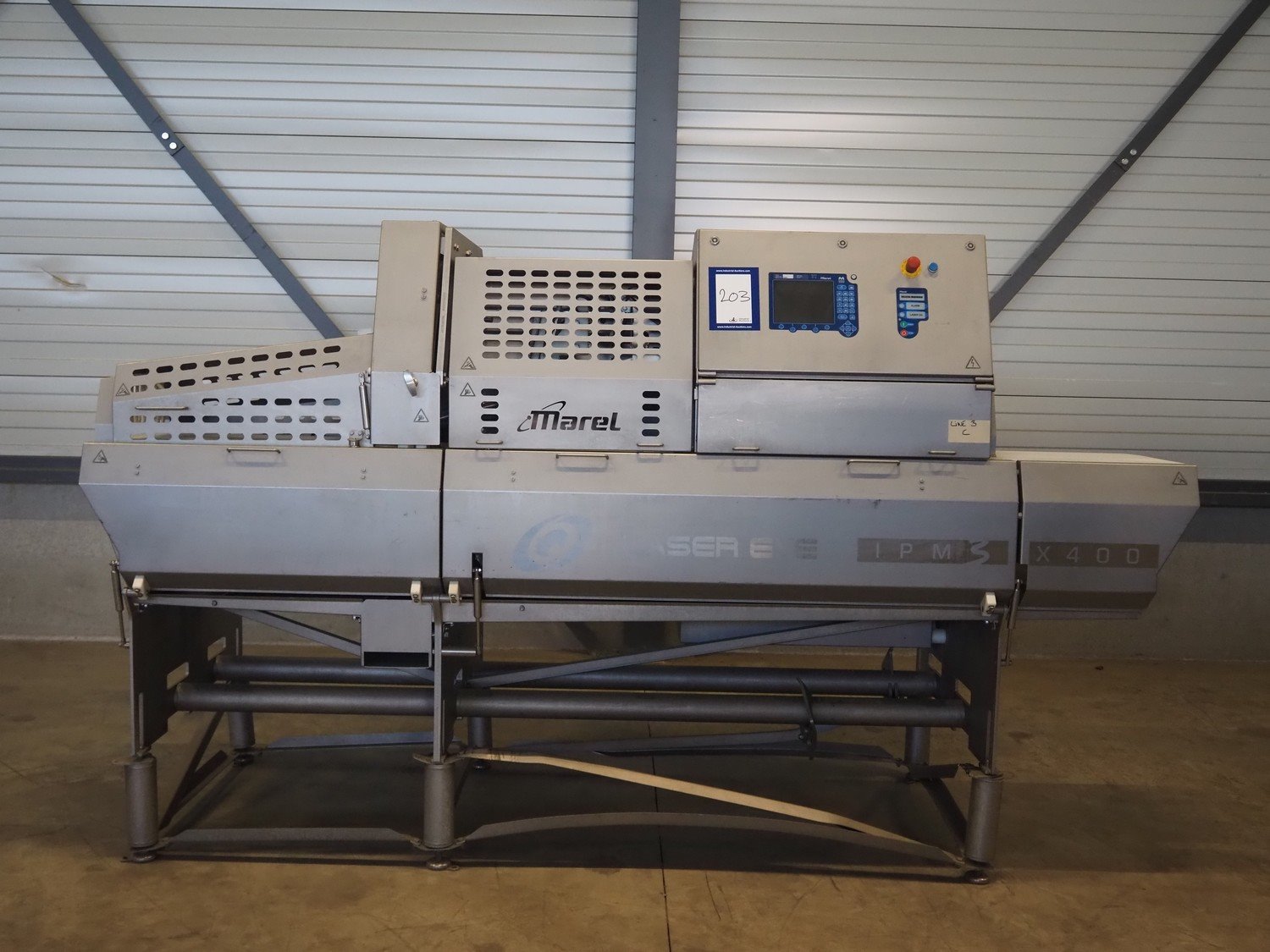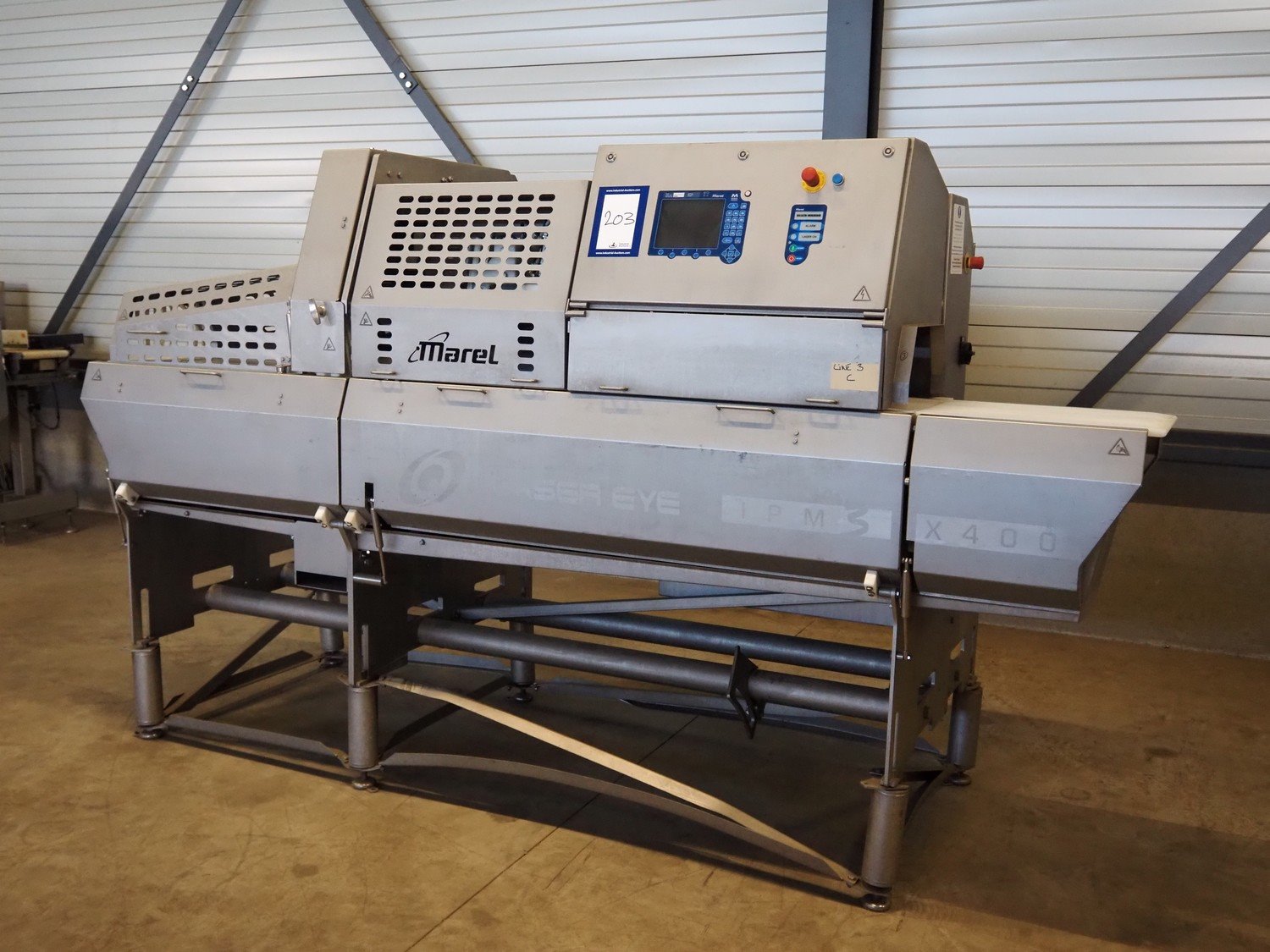 Marel portion cutter, type: IPM3 X400, model: Laser Eye, serial number: A030275, year of construction: 2005, 380-480 V, 3 Ph, 32 A, 10 kW, approximate belt width: 400 mm, total dimensions: 3200 mm x 1050 mm x 1900 mm. Kavel locatie: Looyenbeemd 11, 5652 BH Eindhoven, Nederland
