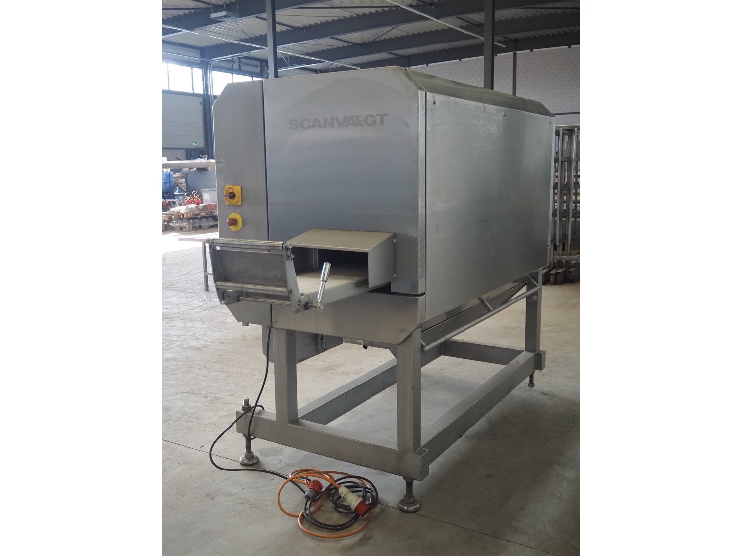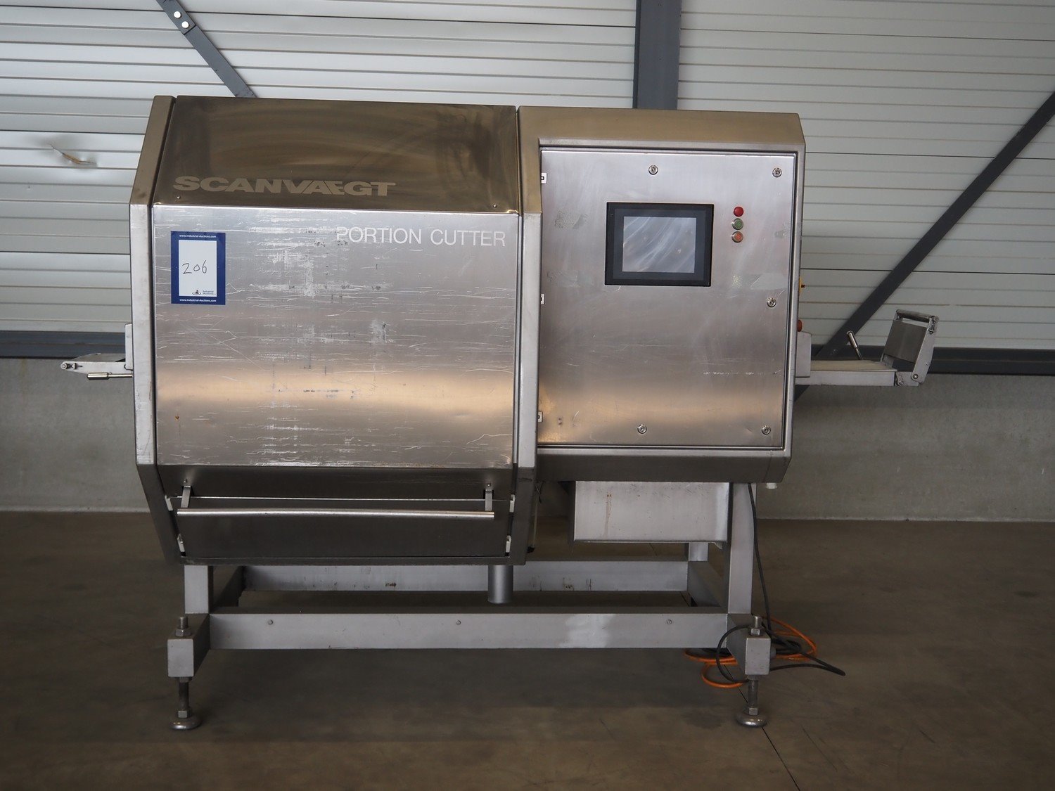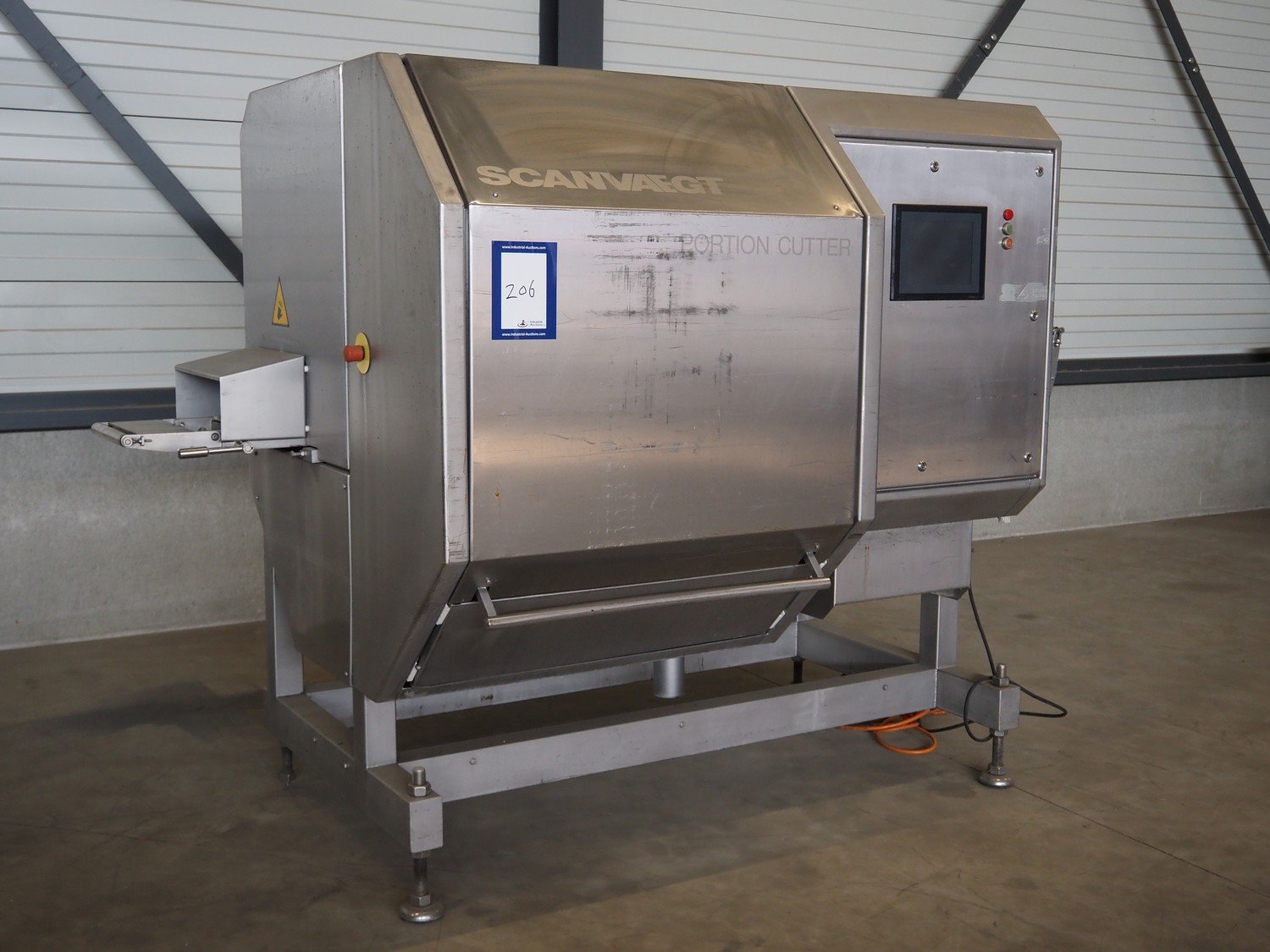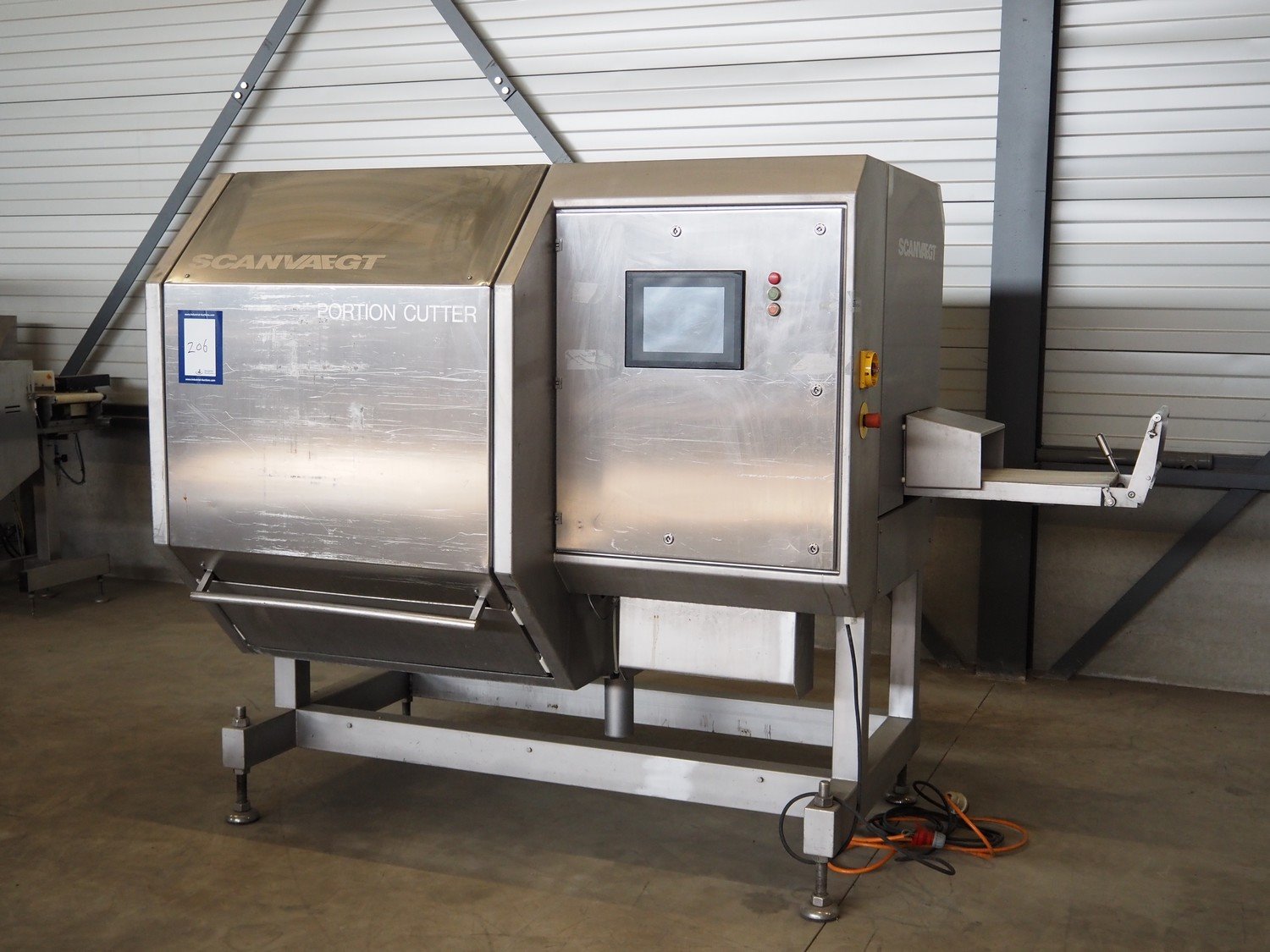 Scanvaegt portion cutter, type: B-35, serial number: 9103.80.0464, year of construction: 2006, 400 V, 3 Ph, 50-60 Hz, 14 A, 6 kW, belt width: 320 mm, knife length: 400 mm, clearance: 330 mm x 110 mm, total dimensions: 3000 mm x 1350 mm x 1900 mm. Without belt. Kavel locatie: Looyenbeemd 11, 5652 BH Eindhoven, Nederland