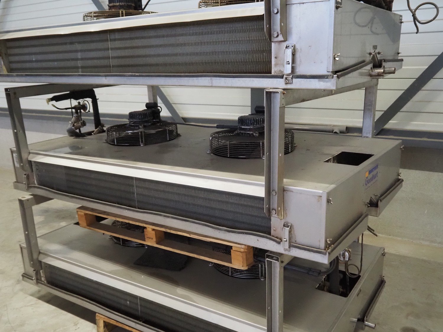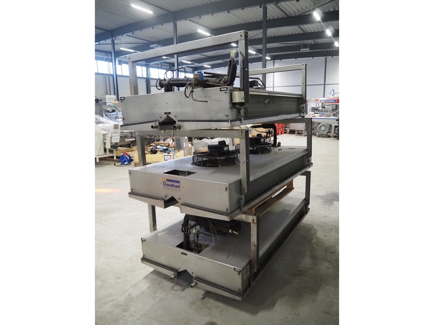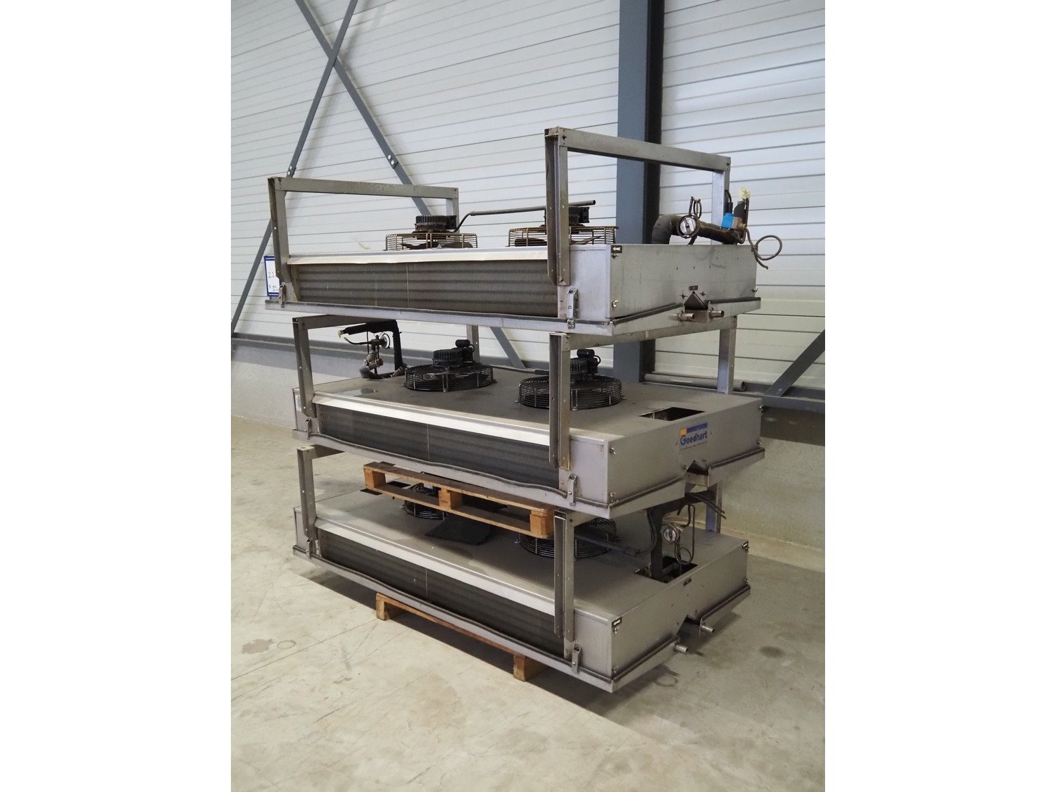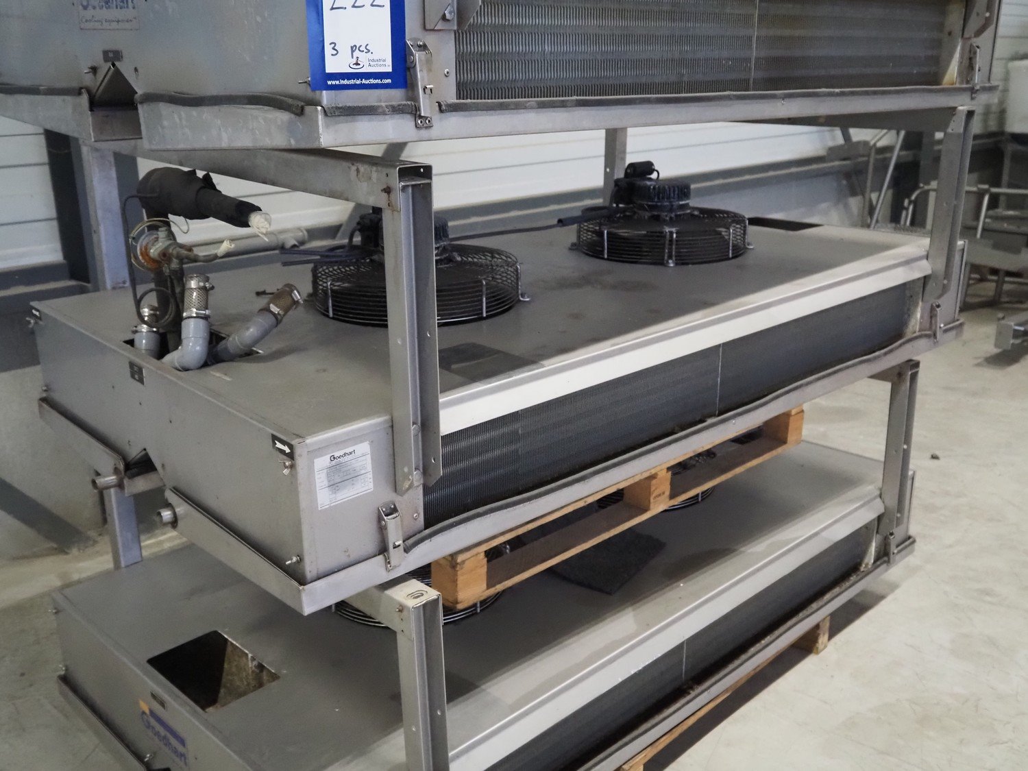 3 Goedhart s/s evaporators, type: PACi 402/4/230, year of construction: 2006, refrigerant: R22, 2 fans, dimensions: (3x) 2100 mm x 1150 mm x 780 mm. Kavel locatie: Looyenbeemd 11, 5652 BH Eindhoven, Nederland