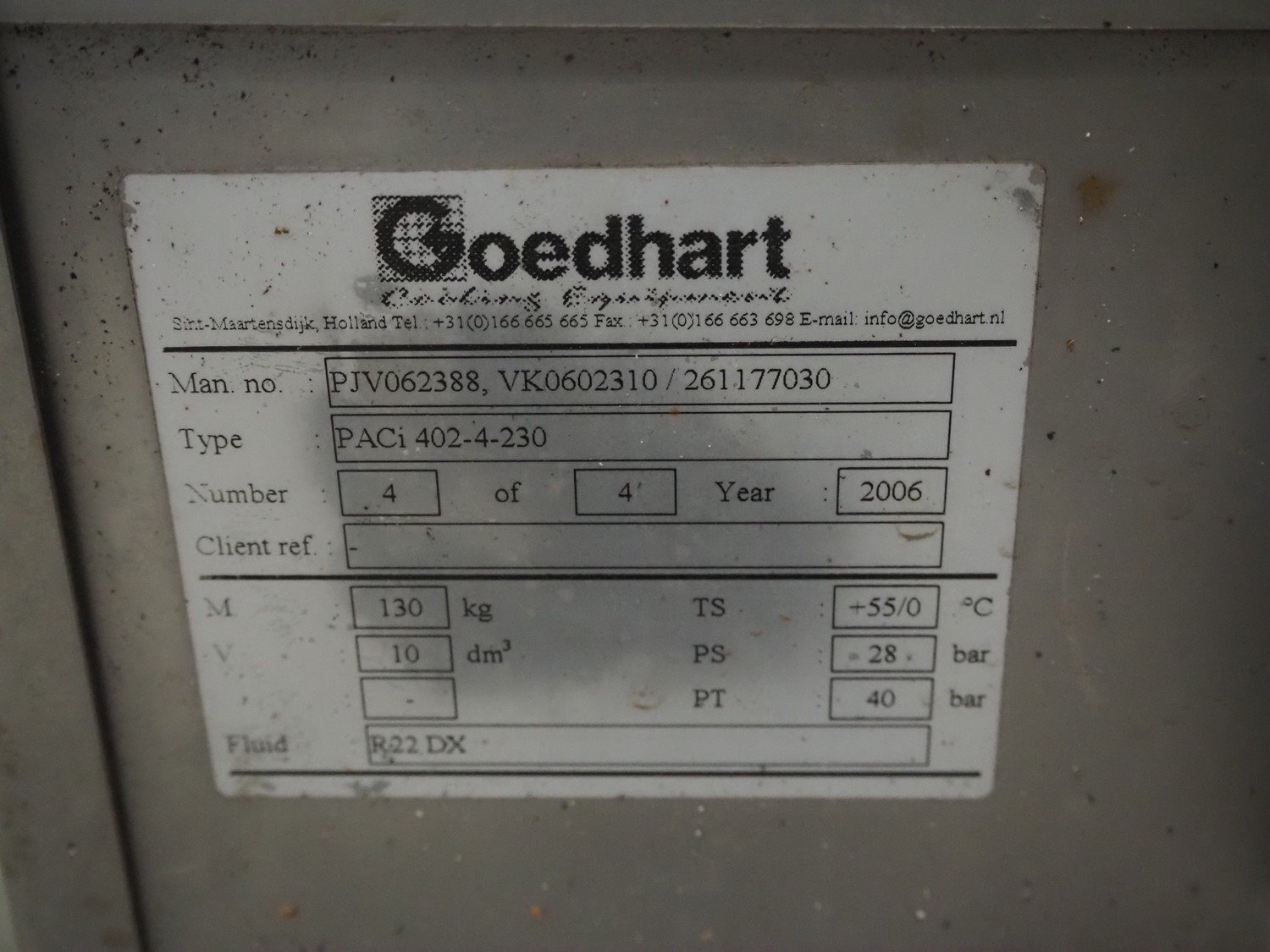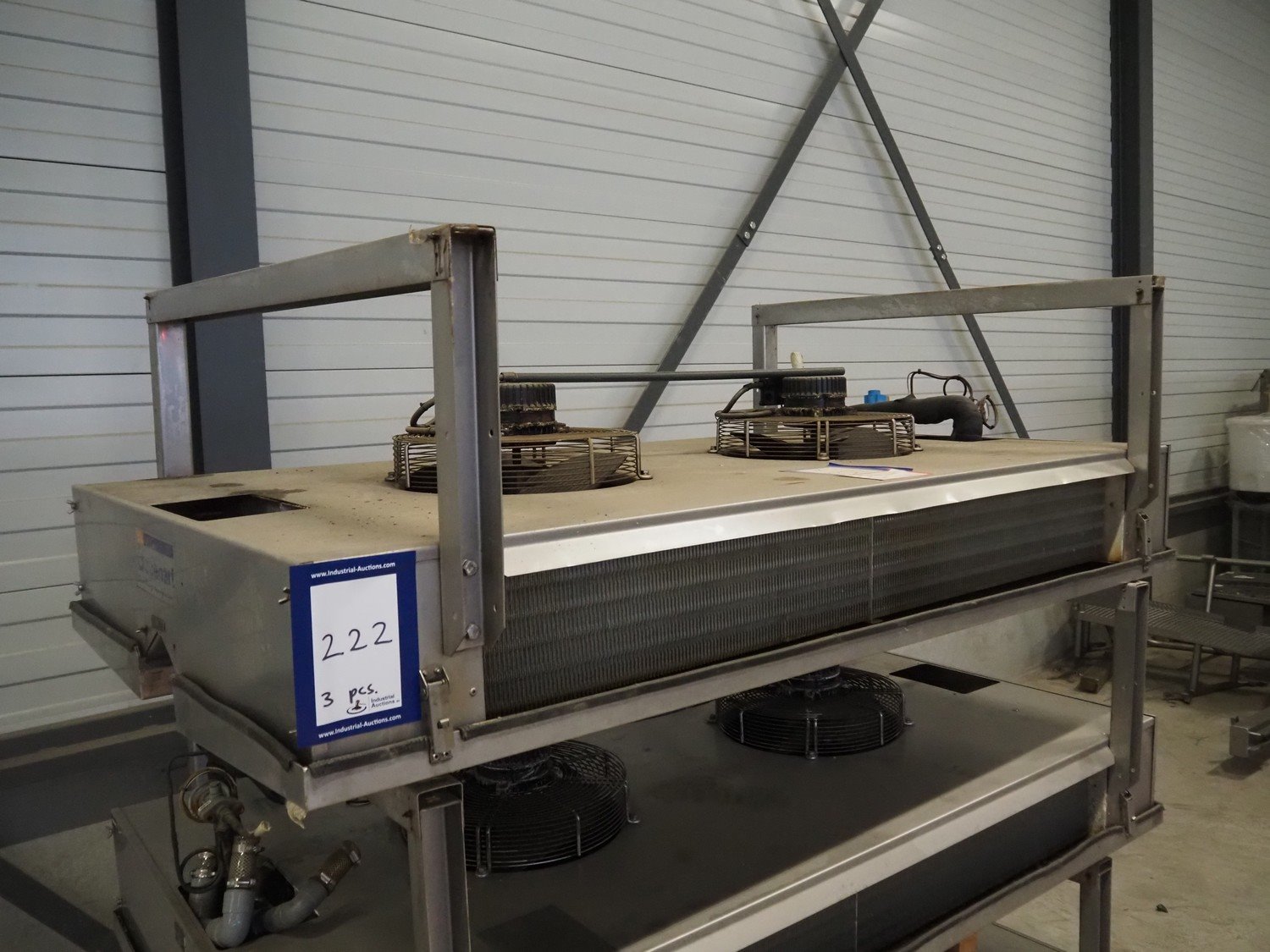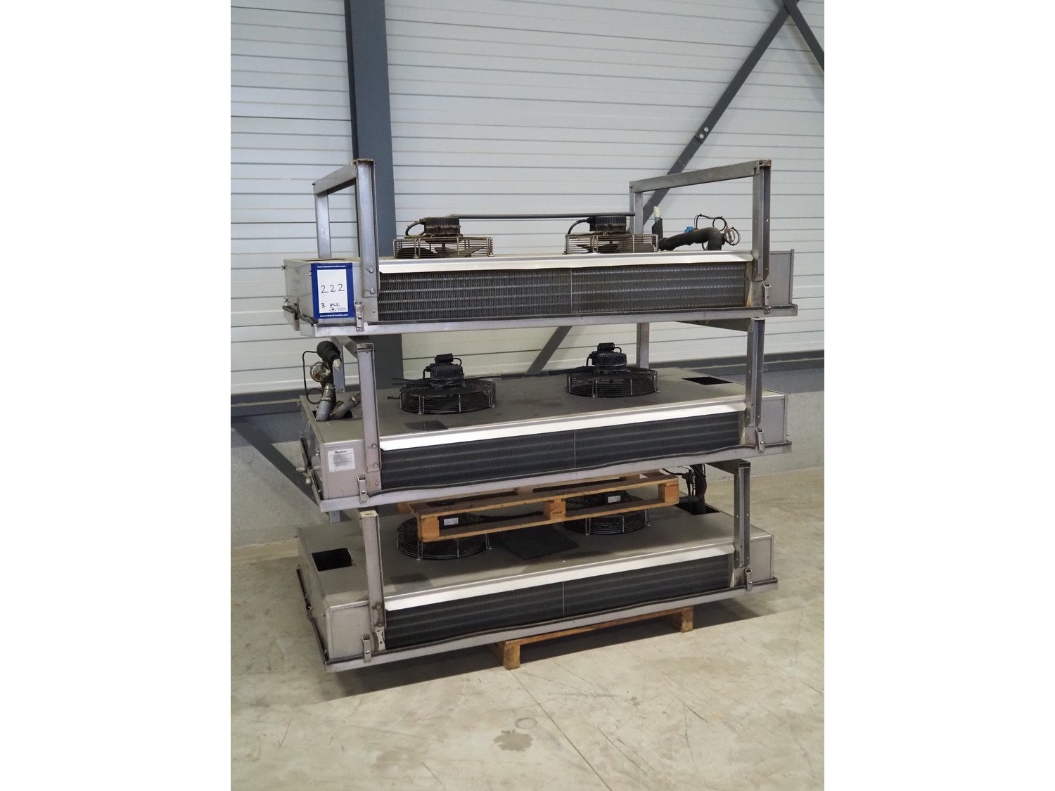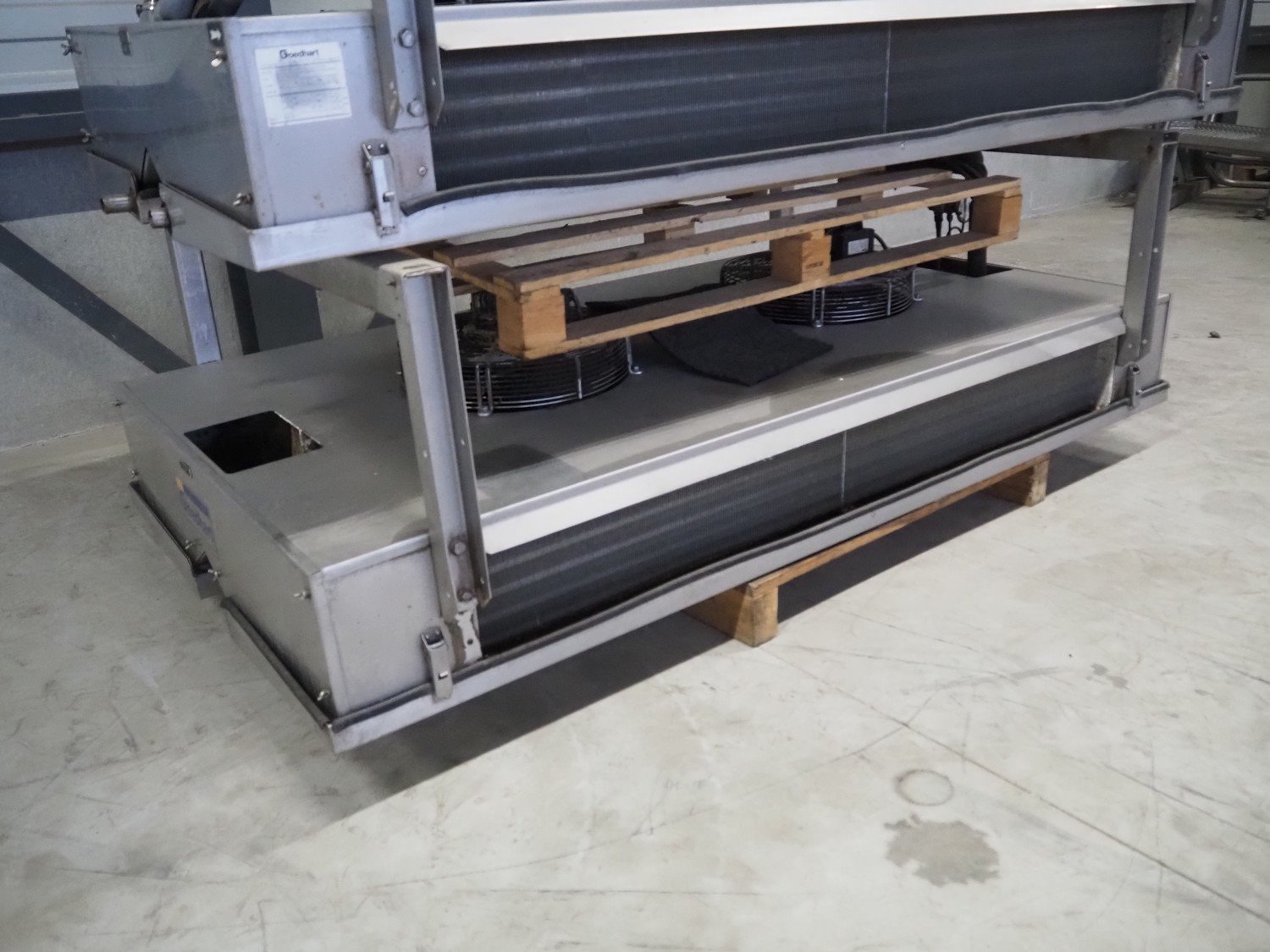 3 Goedhart s/s evaporators, type: PACi 402/4/230, year of construction: 2006, refrigerant: R22, 2 fans, dimensions: (3x) 2100 mm x 1150 mm x 780 mm. Kavel locatie: Looyenbeemd 11, 5652 BH Eindhoven, Nederland