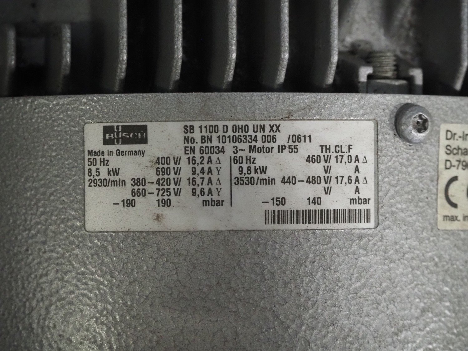 Busch side channel pressure/vacuum pump, model: SB 1100 D 0H0 UN XX, number: BN 10106334 006 /0611, 400-460 V, 3 Ph, 50-60 Hz, 16.2-17.0 A, 8.5-98 kW, dimensions: 1150 mm x 600 mm x 900 mm. Kavel locatie: Looyenbeemd 11, 5652 BH Eindhoven, Nederland