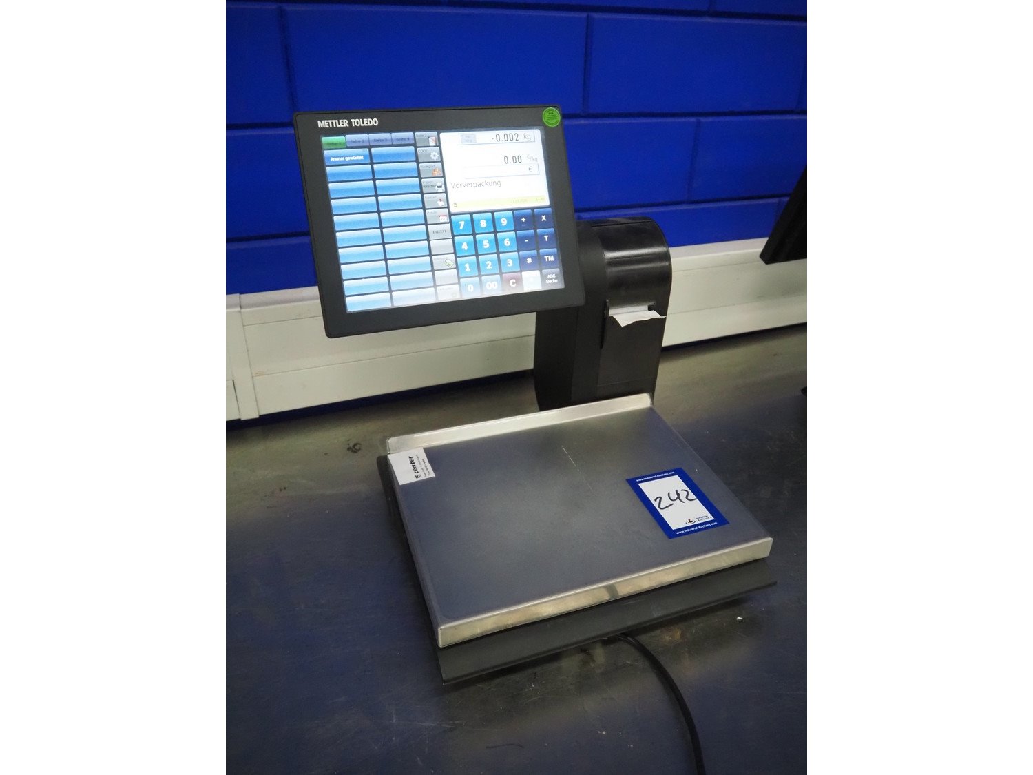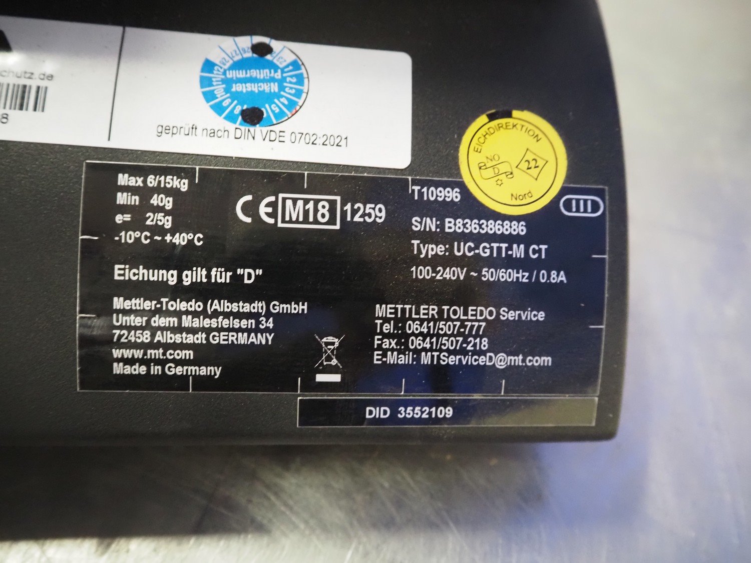 Mettler Toledo weighing scale with label printer, type: UC-GTT-M CT, serial number: B836386886, maximum: 6/15 kg, minimum: 40 gram, e= 2/5 gram, dimensions scale: 360 mm x 270 mm, total dimensions: 430 mm x 400 mm x 470 mm. Kavel locatie: Looyenbeemd 11, 5652 BH Eindhoven, Nederland