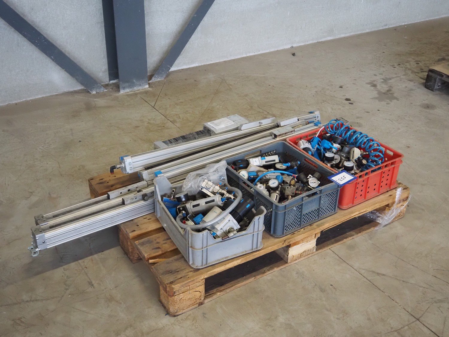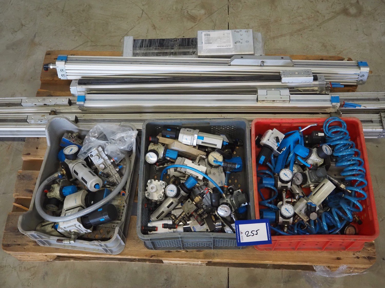 Pallet with Festo pneumatic cylinders and parts, dimensions: 1700 mm x 800 mm x 400 mm. Kavel locatie: Looyenbeemd 11, 5652 BH Eindhoven, Nederland