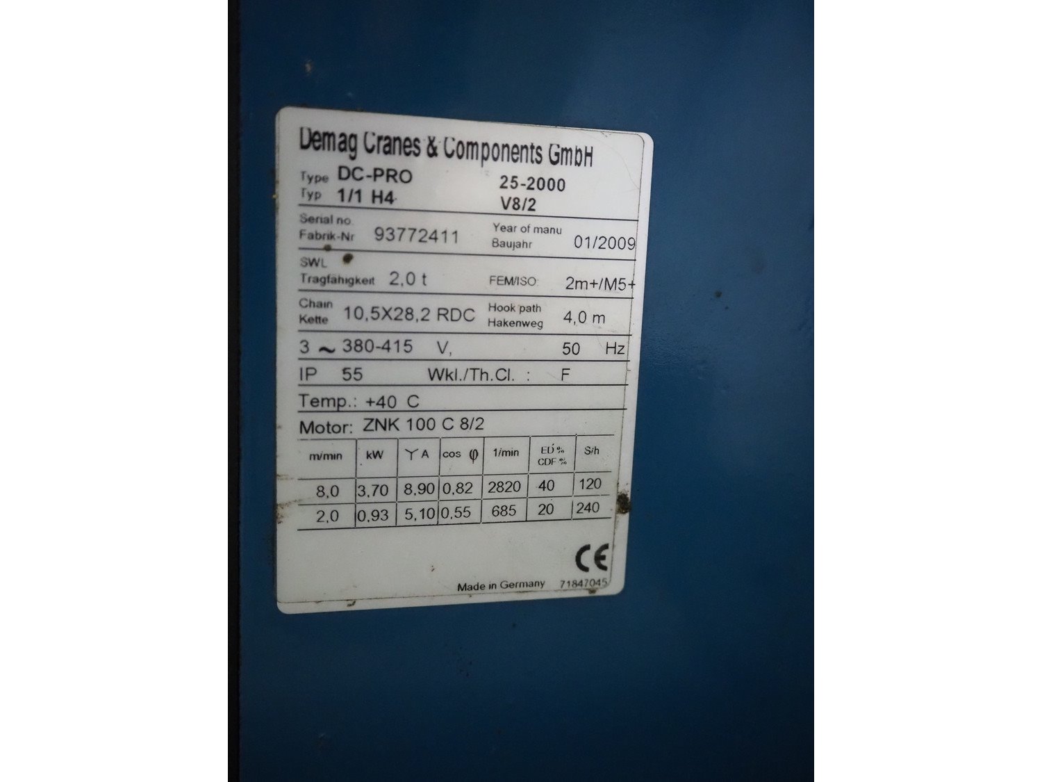 Demag overhead crane system, type: DC-PRO 1/1 H4, fabrication number: 93772411, year of construction: 01/2009, 380-415 V, 3 Ph, 50 Hz, capacity: 2000 kg, dimensions: 1200 mm x 1000 mm x 550 mm. Kavel locatie: Looyenbeemd 11, 5652 BH Eindhoven, Nederland