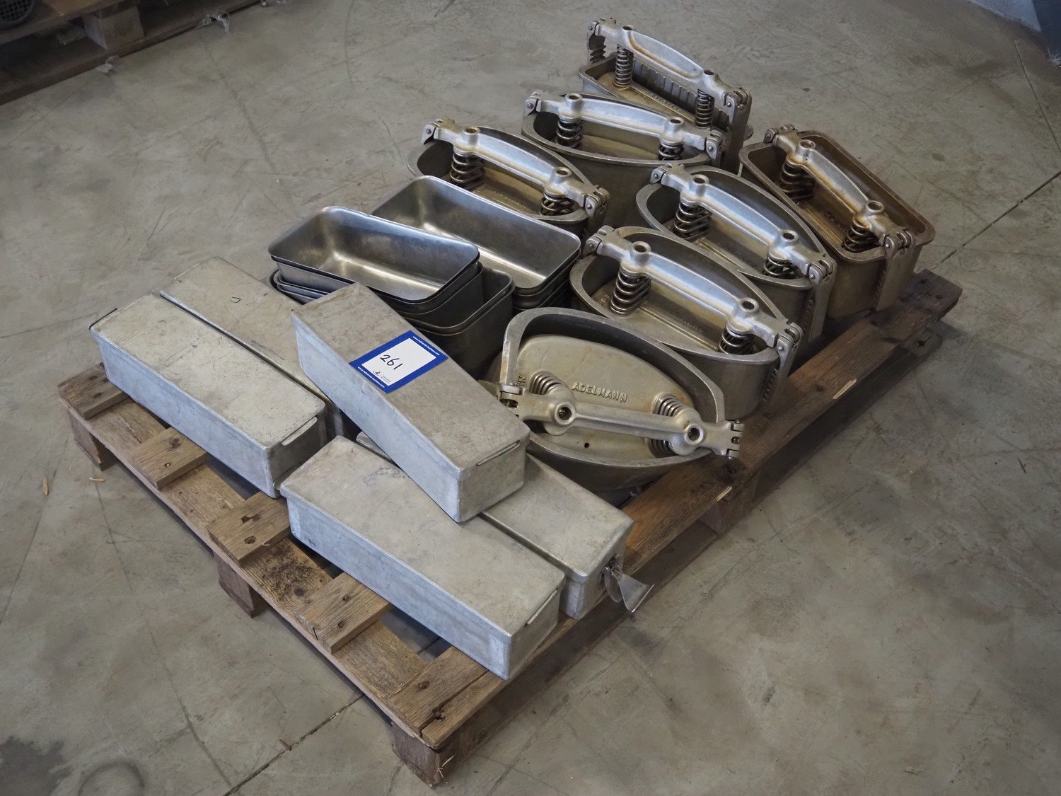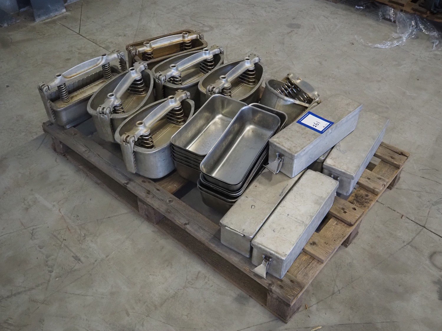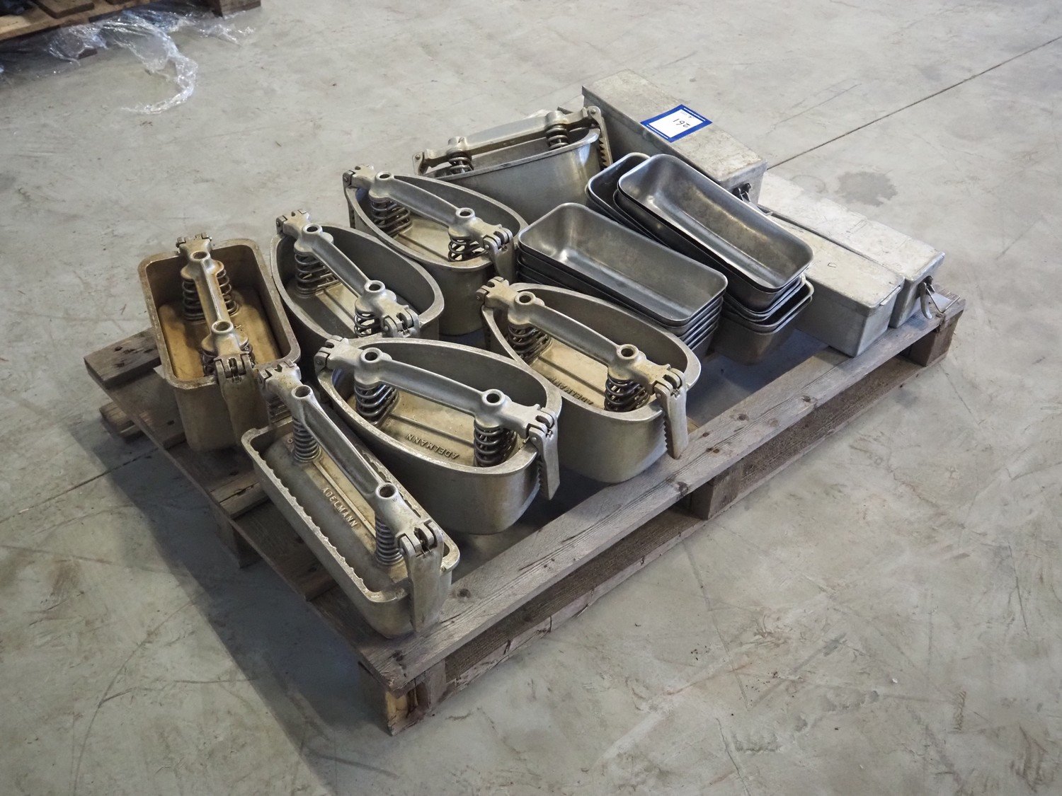 Pallet with various Adelmann ham moulds, dimensions moulds: 310 mm x 150 mm x 100 mm, 330 mm x 220 mm x 150 mm and 330 mm x 180 mm x 170 mm, total dimensions pallet: 1200 mm x 800 mm x 300 mm. Kavel locatie: Looyenbeemd 11, 5652 BH Eindhoven, Nederland