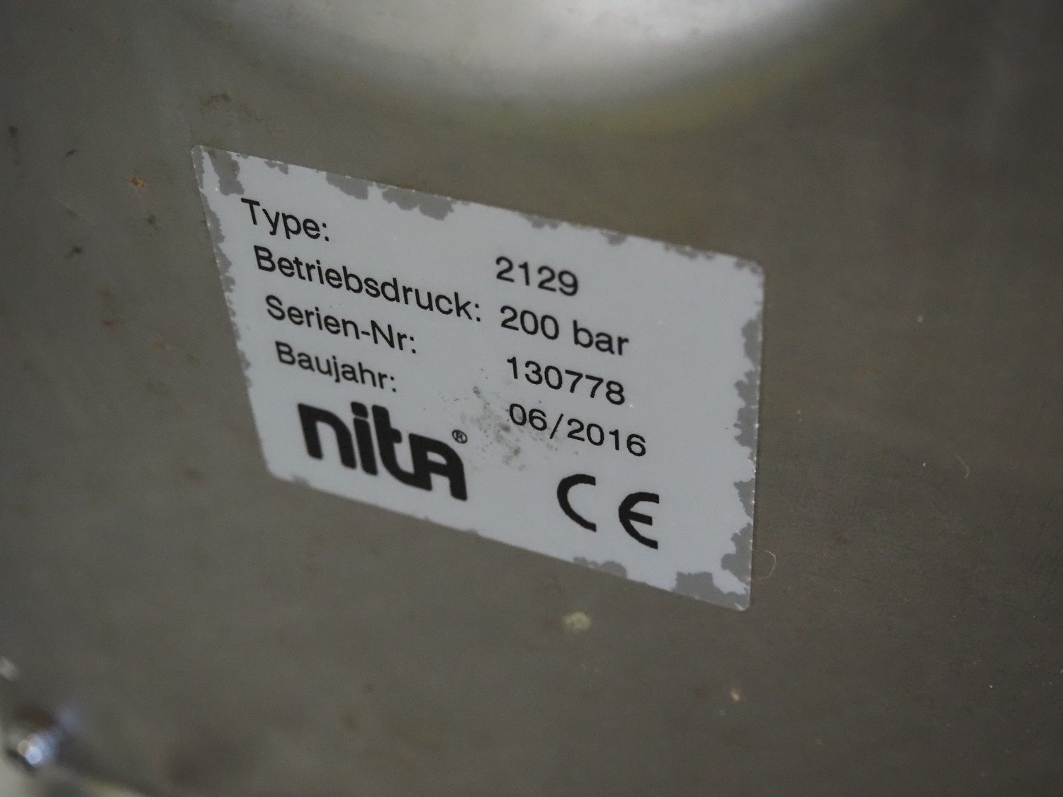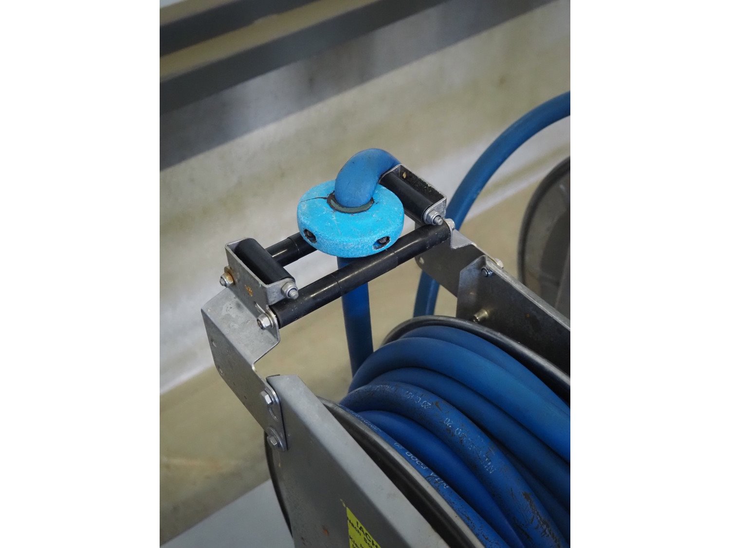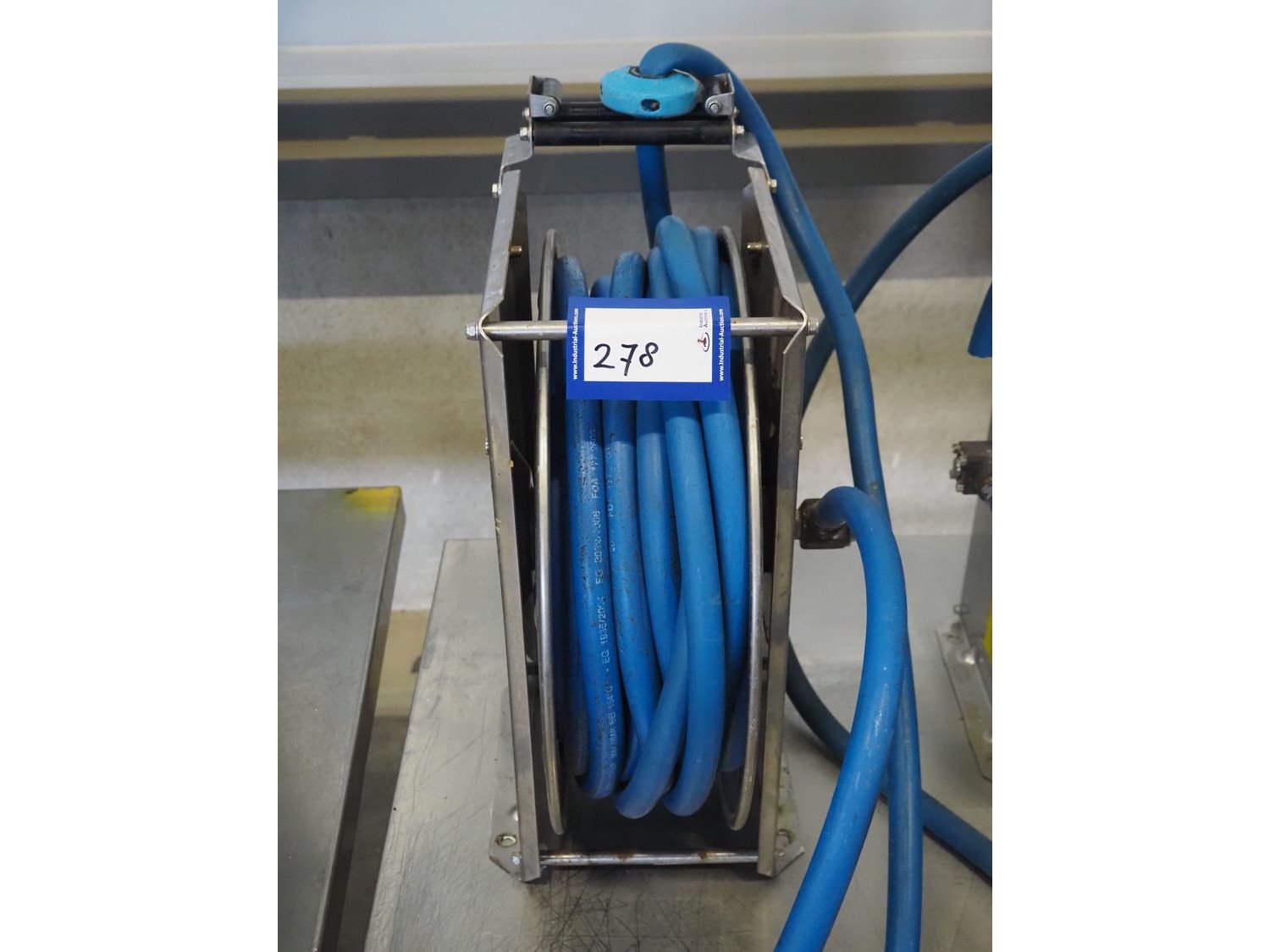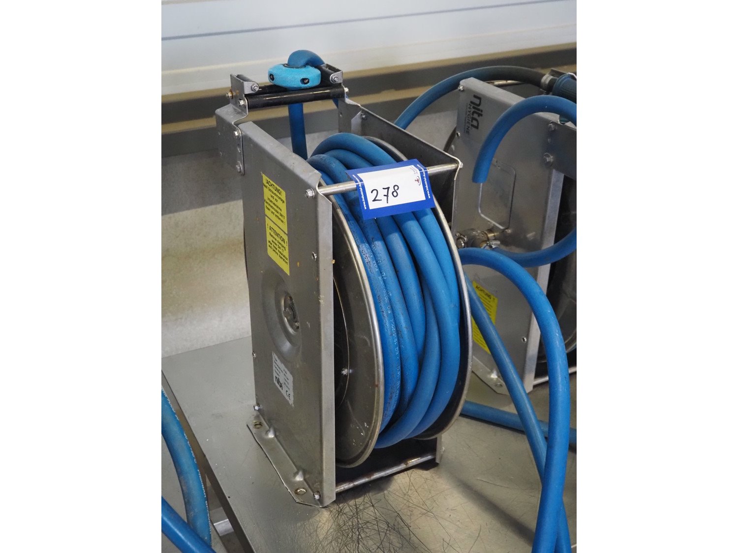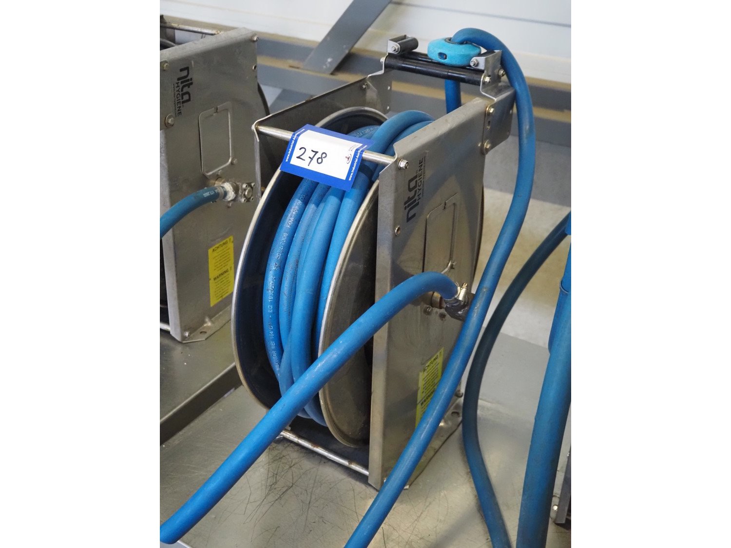 Nita Hygiene s/s hose reel with hose and pistol, type: 2129, year of construction: 2015, working pressure: 200 bar, dimensions: 550 mm x 220 mm x 460 mm. Kavel locatie: Looyenbeemd 11, 5652 BH Eindhoven, Nederland
