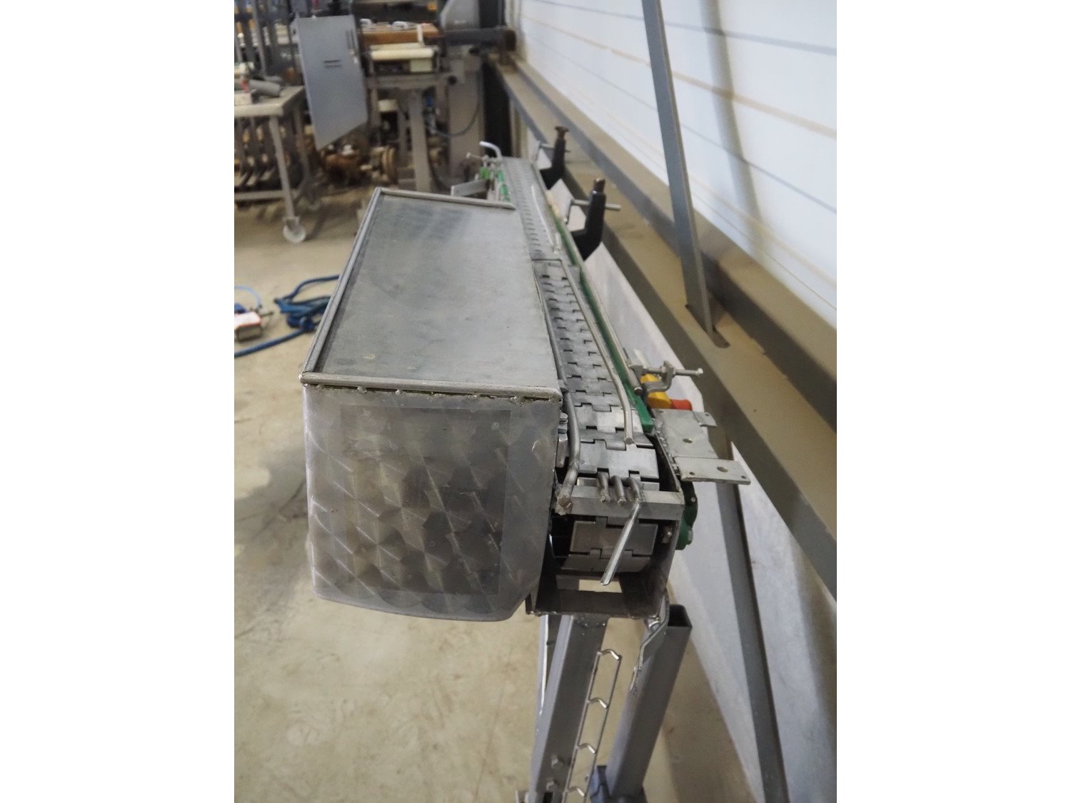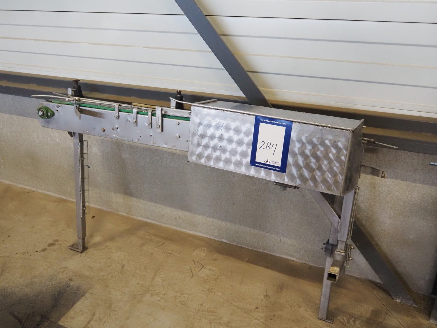 Transport belt, s/s frame, s/s belt, belt width: 80 mm, total dimensions: 1950 mm x 450 mm x 1000 mm. Kavel locatie: Looyenbeemd 11, 5652 BH Eindhoven, Nederland