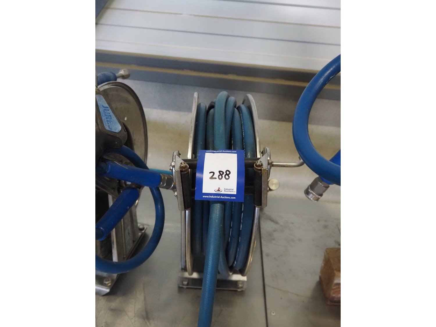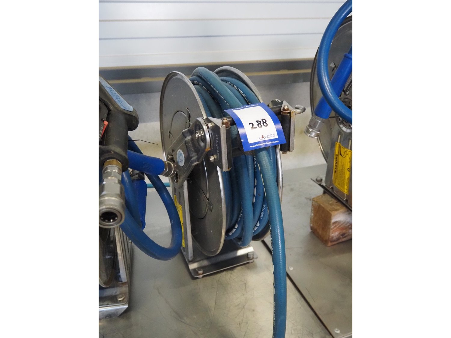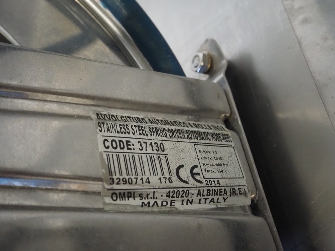 OMPI s/s hose reel with hose and spray pistol, dimensions: 460 mm x 230 mm x 480 mm. Kavel locatie: Looyenbeemd 11, 5652 BH Eindhoven, Nederland