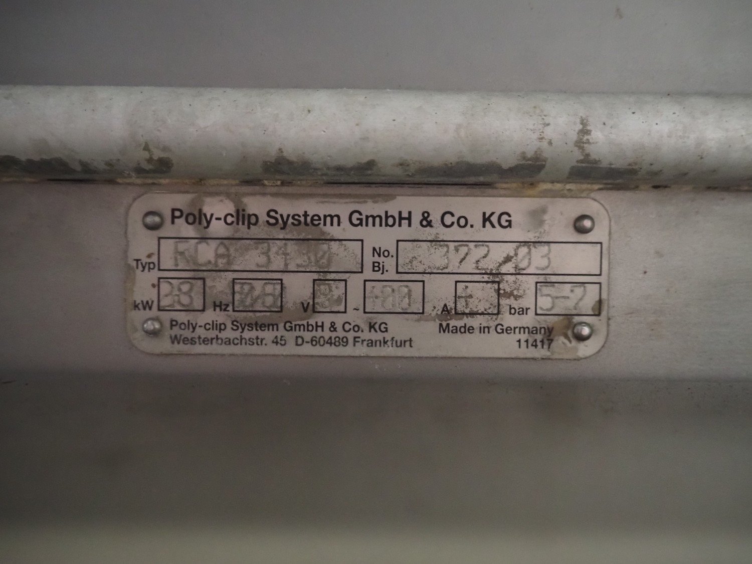 Poly-clip System GmbH & Co. KG mobile automatic double clipper, type: RCA 3430, number: 372, year of construction: 2003, 400 V, 3 Ph, 4 A, 3.8 kW, dimensions: 1300 mm x 1400 mm x 1860 mm. Kavel locatie: Looyenbeemd 11, 5652 BH Eindhoven, Nederland