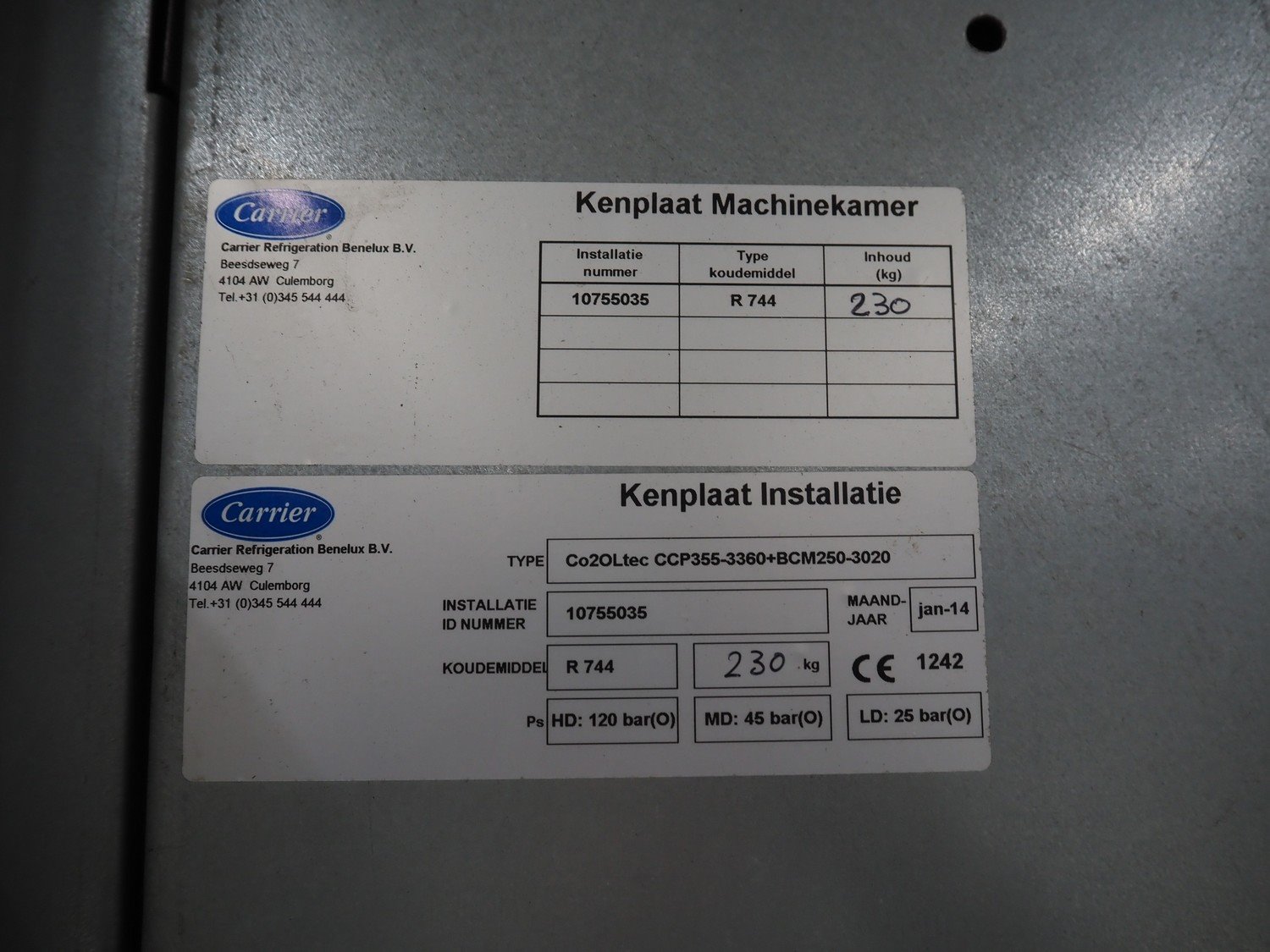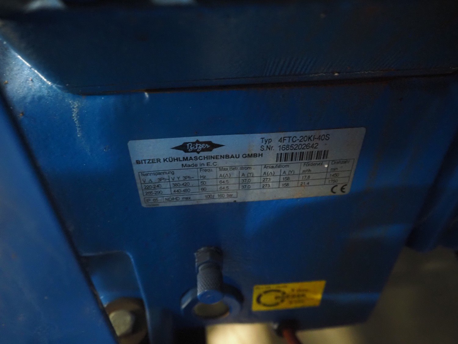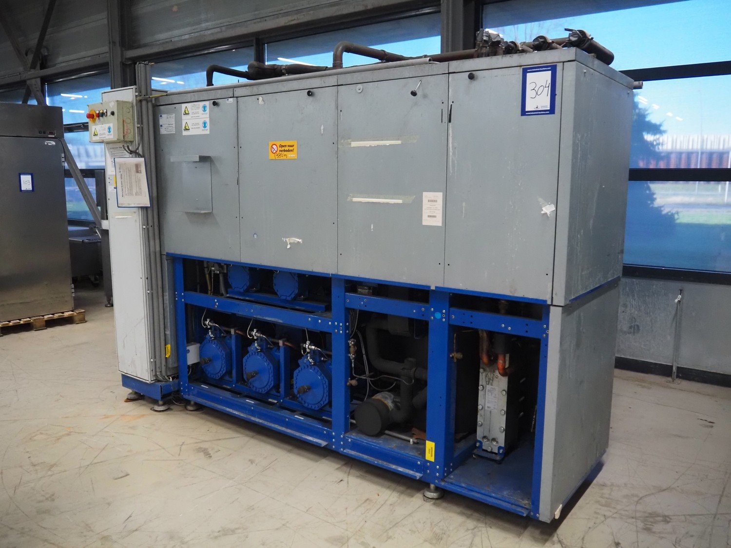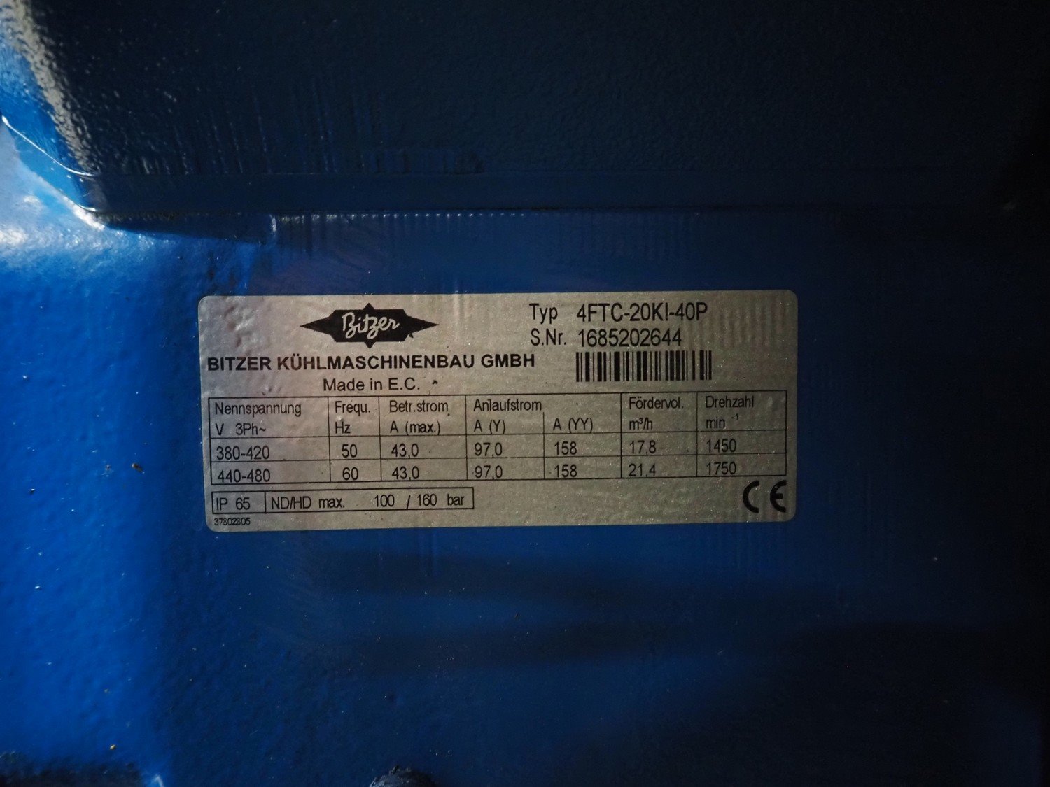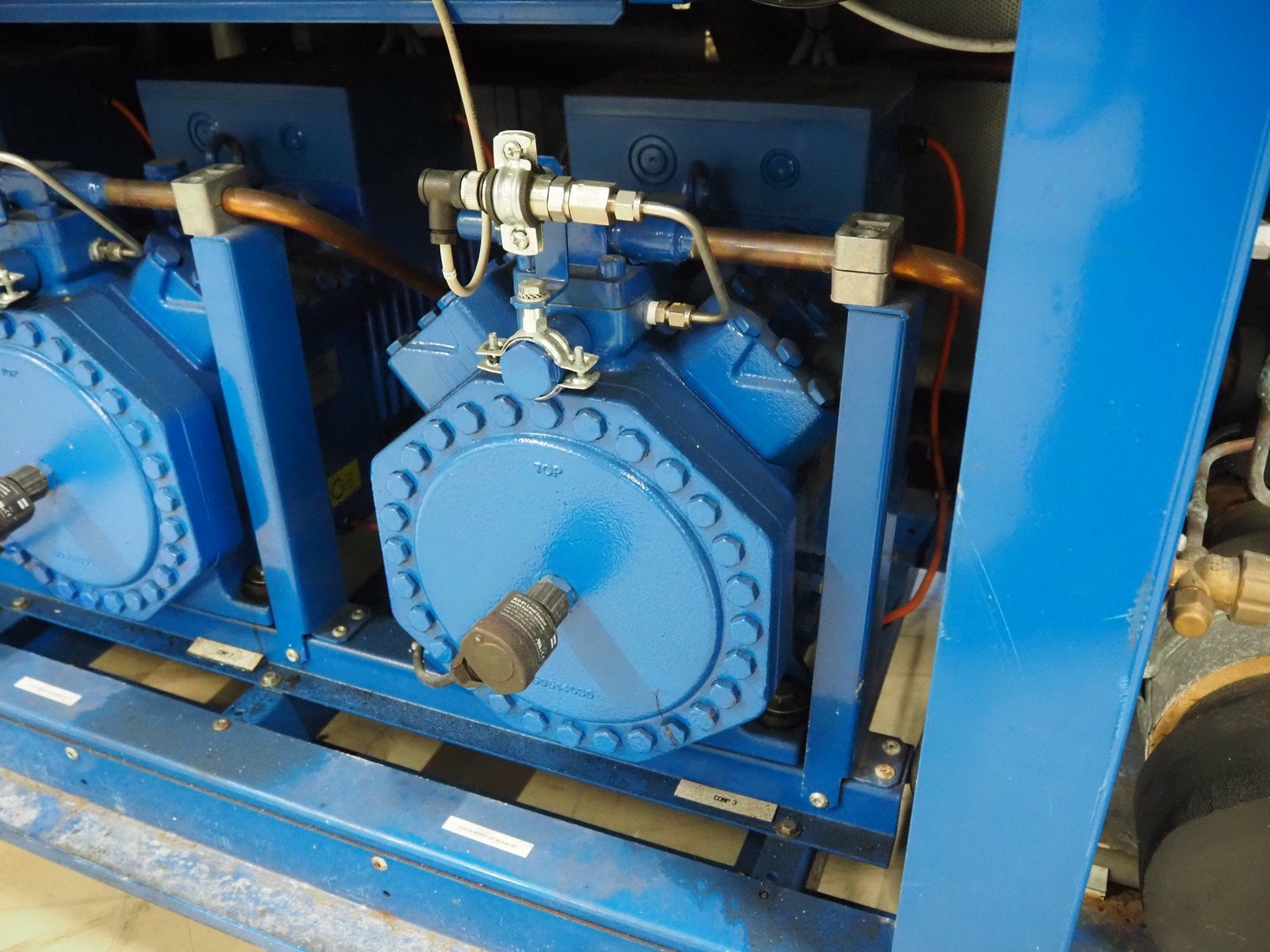 Bitzer Kühlmaschinenbau GmbH compressor rack in cabinet with 5 Bitzer Kühlmaschinenbau GmbH cooling compressors, type: (3x) 4FTC-20KC-40S, capacity: 17.8/21.5 m³ per hour and type: (2x) 4KHC-05KB-40S, capacity: 2.71/3.25 m³ per hour dimensions: 3200 mm x 1200 mm x 2400 mm. Kavel locatie: Looyenbeemd 11, 5652 BH Eindhoven, Nederland