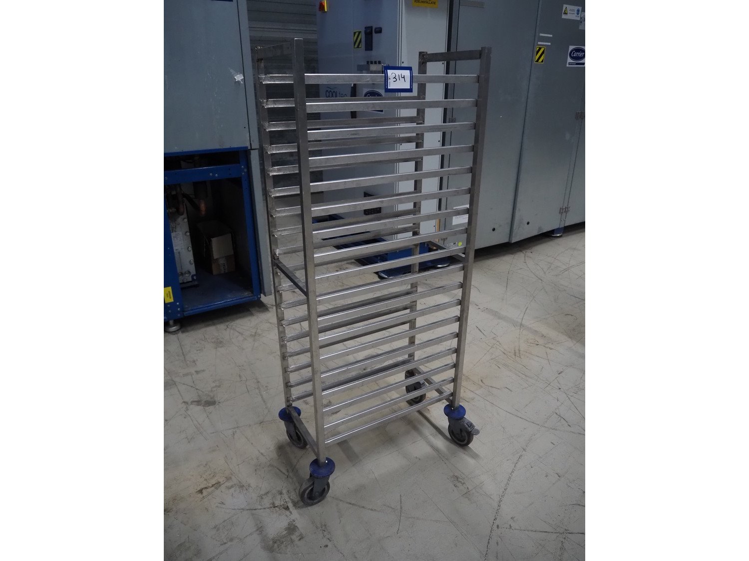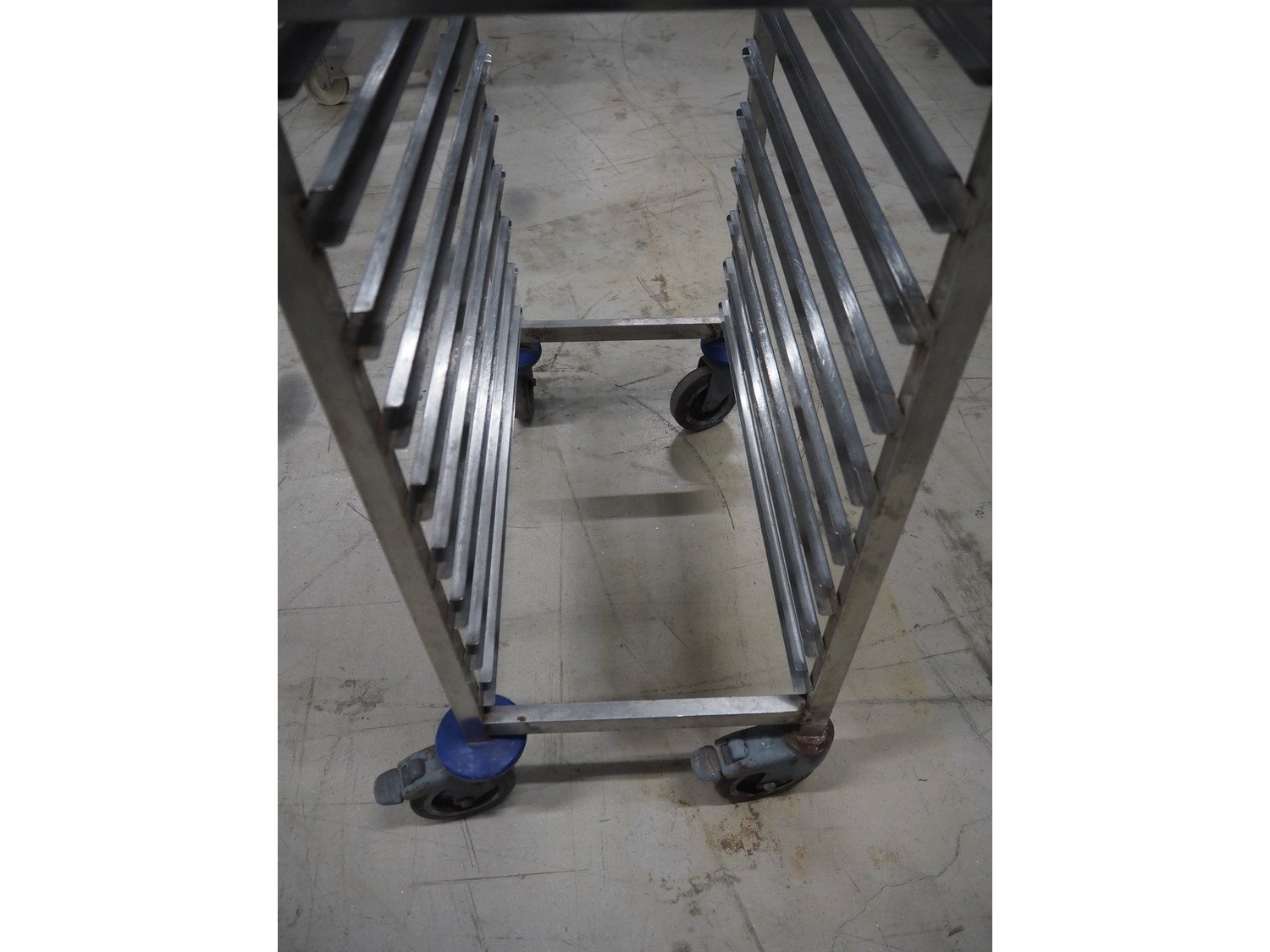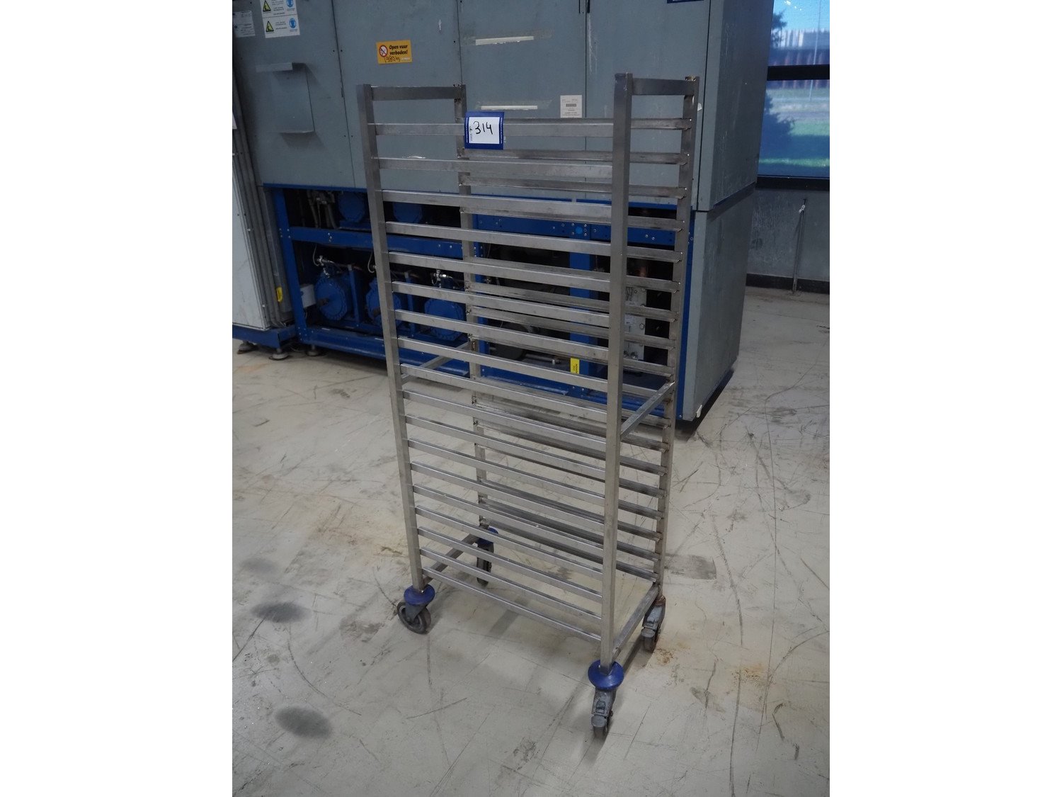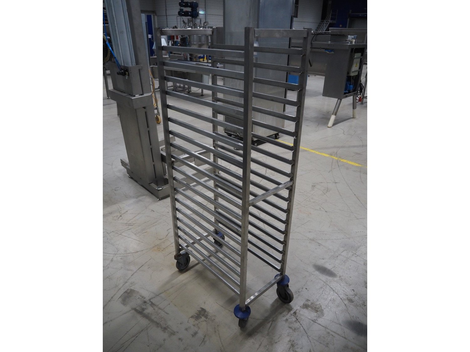Mobile s/s rack, 18 floors, dimensions floors: (18x) 650 mm x 330 mm, total dimensions: 750 mm x 450 mm x 1635 mm. Kavel locatie: Looyenbeemd 11, 5652 BH Eindhoven, Nederland
