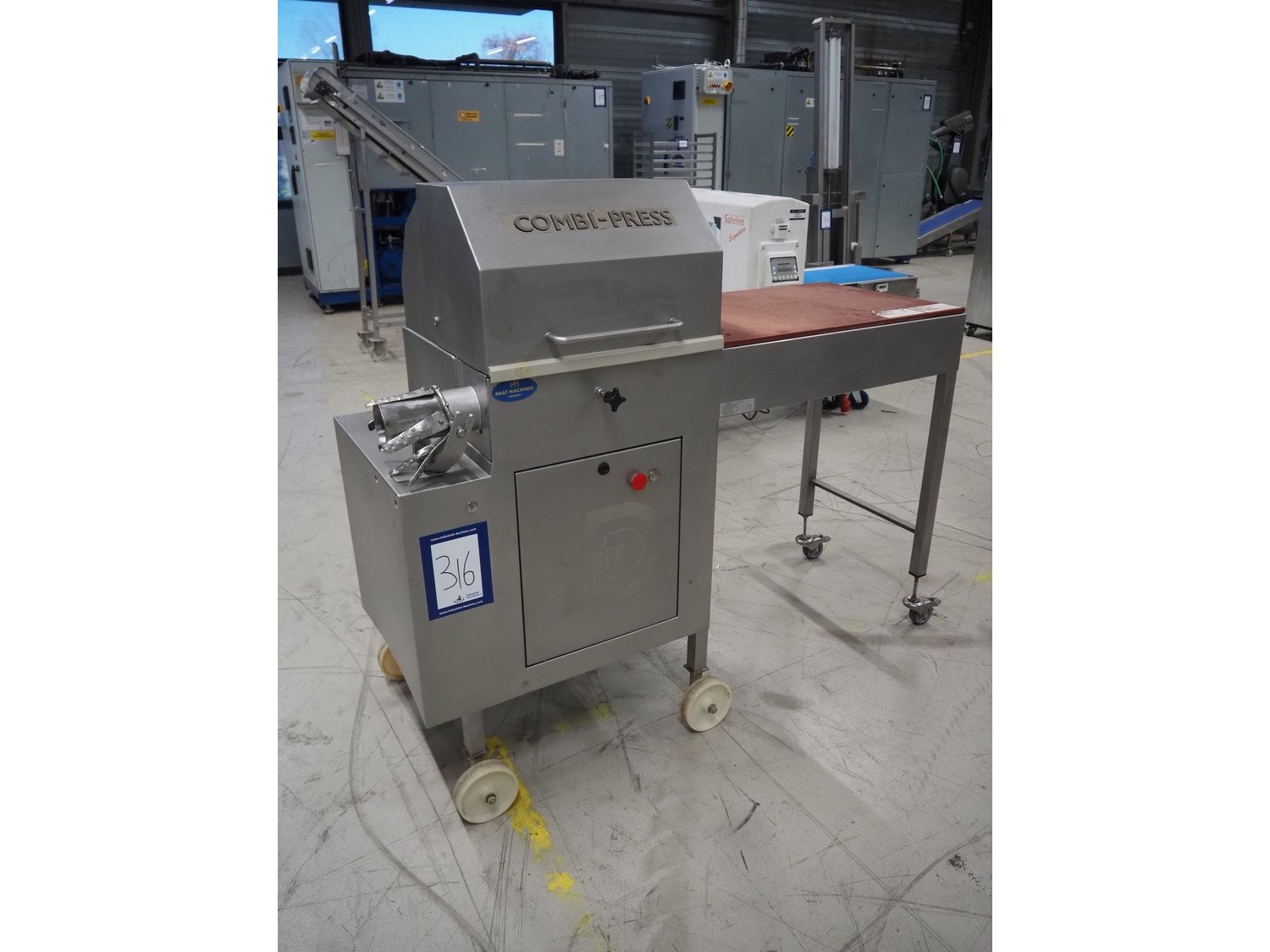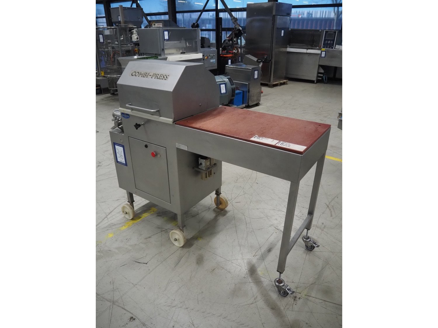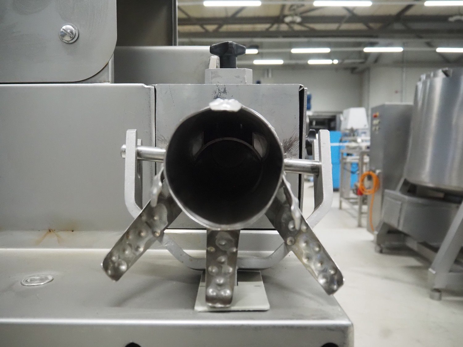 Dorit mobile meat press, type: Combi-press, clearance: Ø 100 mm x 495 mm, total dimensions: 1800 mm x 700 mm x 1420 mm. Including 2 extra outfeed pipes, dimensions outfeed pipes: (1x) 90 mm and (1x) 120 mm. Kavel locatie: Looyenbeemd 11, 5652 BH Eindhoven, Nederland
