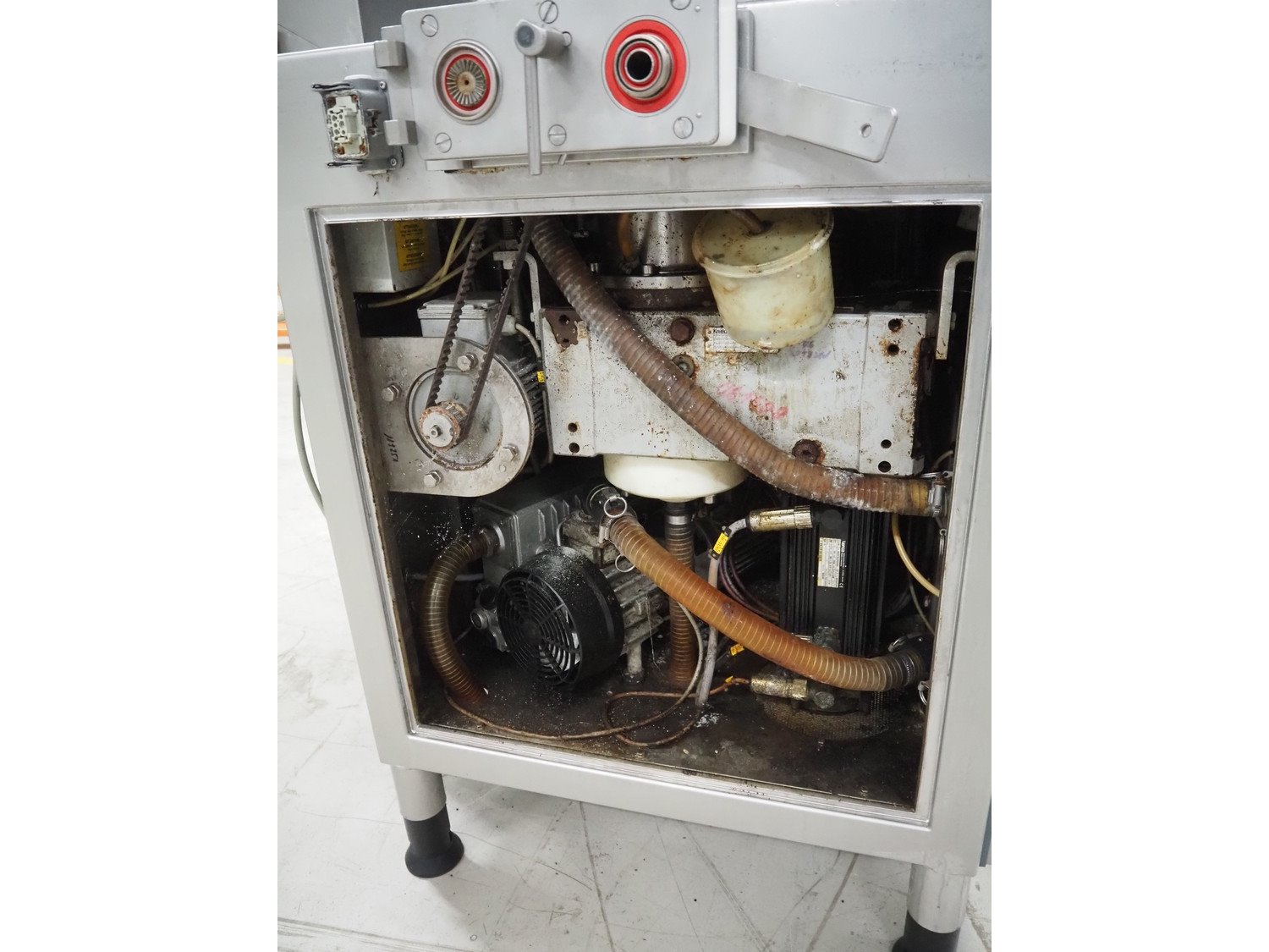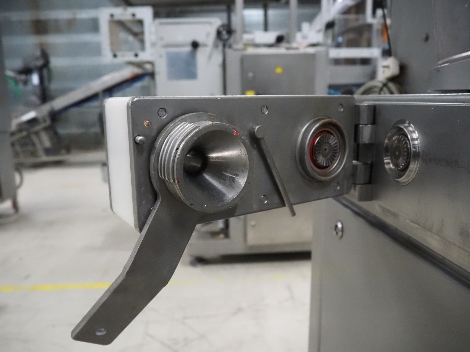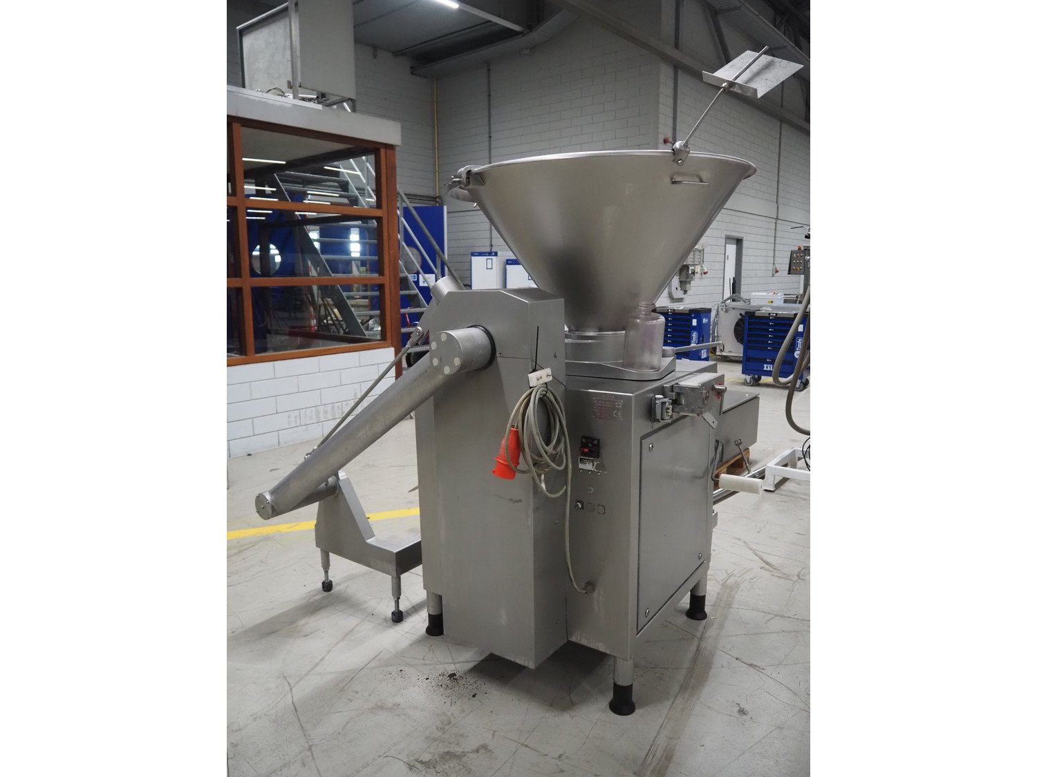Karl Schnell GmbH & Co. vacuum filling machine with lifter for 200 litre meat bins, type: 595, machine number: 21632, year of construction: 2002, 400 V, 3 Ph, 50 Hz, 18.2 A, dimensions: 1750 mm x 1950 mm x 2070 mm. Including plastic crate with extra parts. Kavel locatie: Looyenbeemd 11, 5652 BH Eindhoven, Nederland