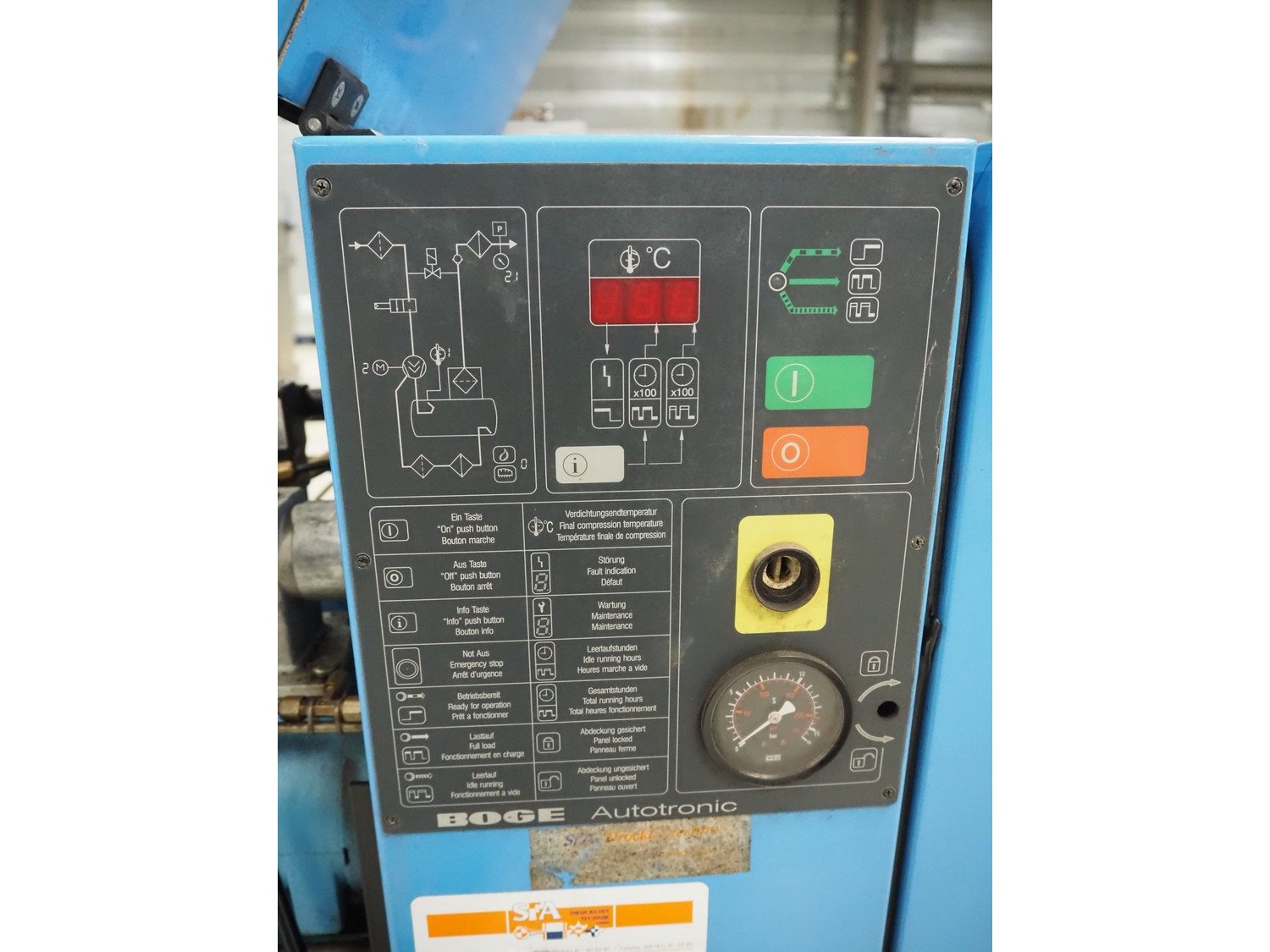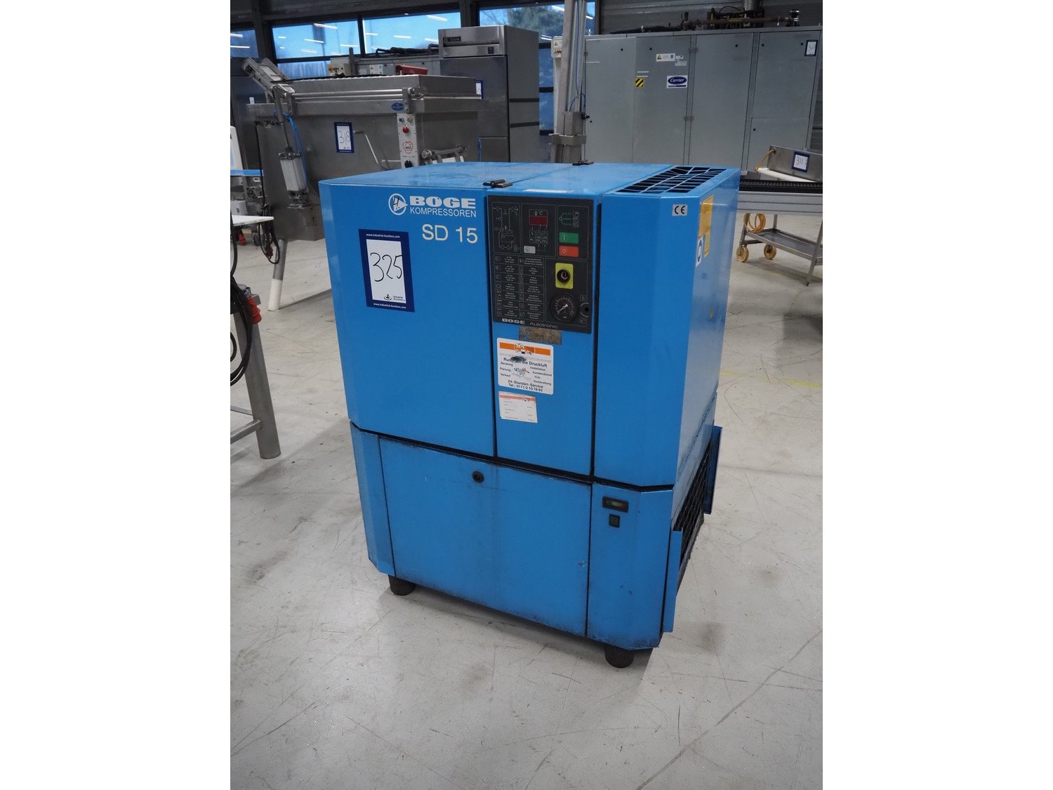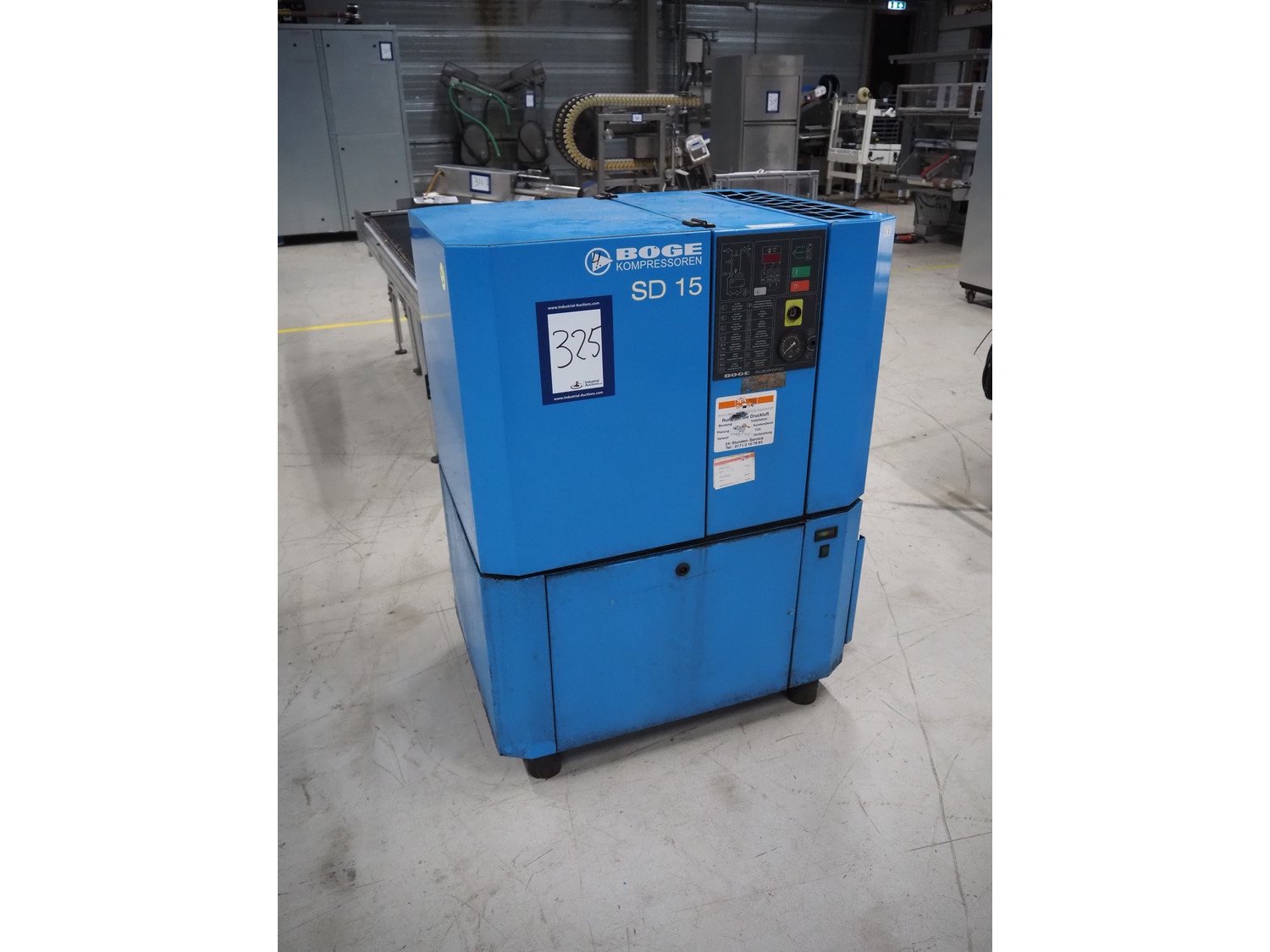 Boge piston air compressor, type: SD 15, machine number: 37330, year of construction: 2000, capacity: 1.65 m³ per minute, maximum pressure: 10 bar, dimensions: 970 mm x 700 mm x 1280 mm. Kavel locatie: Looyenbeemd 11, 5652 BH Eindhoven, Nederland