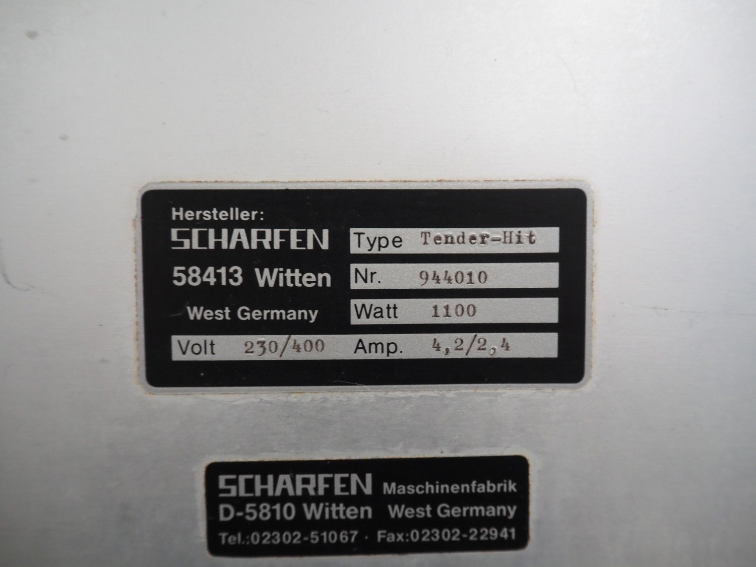 SCHARFEN tenderizer, type: Tender-Hit, number: 944010, 230/400 V, 4.2/2.4 A, 1100 W, dimensions: 750 mm x 700 m x 1630 mm. Kavel locatie: Looyenbeemd 11, 5652 BH Eindhoven, Nederland