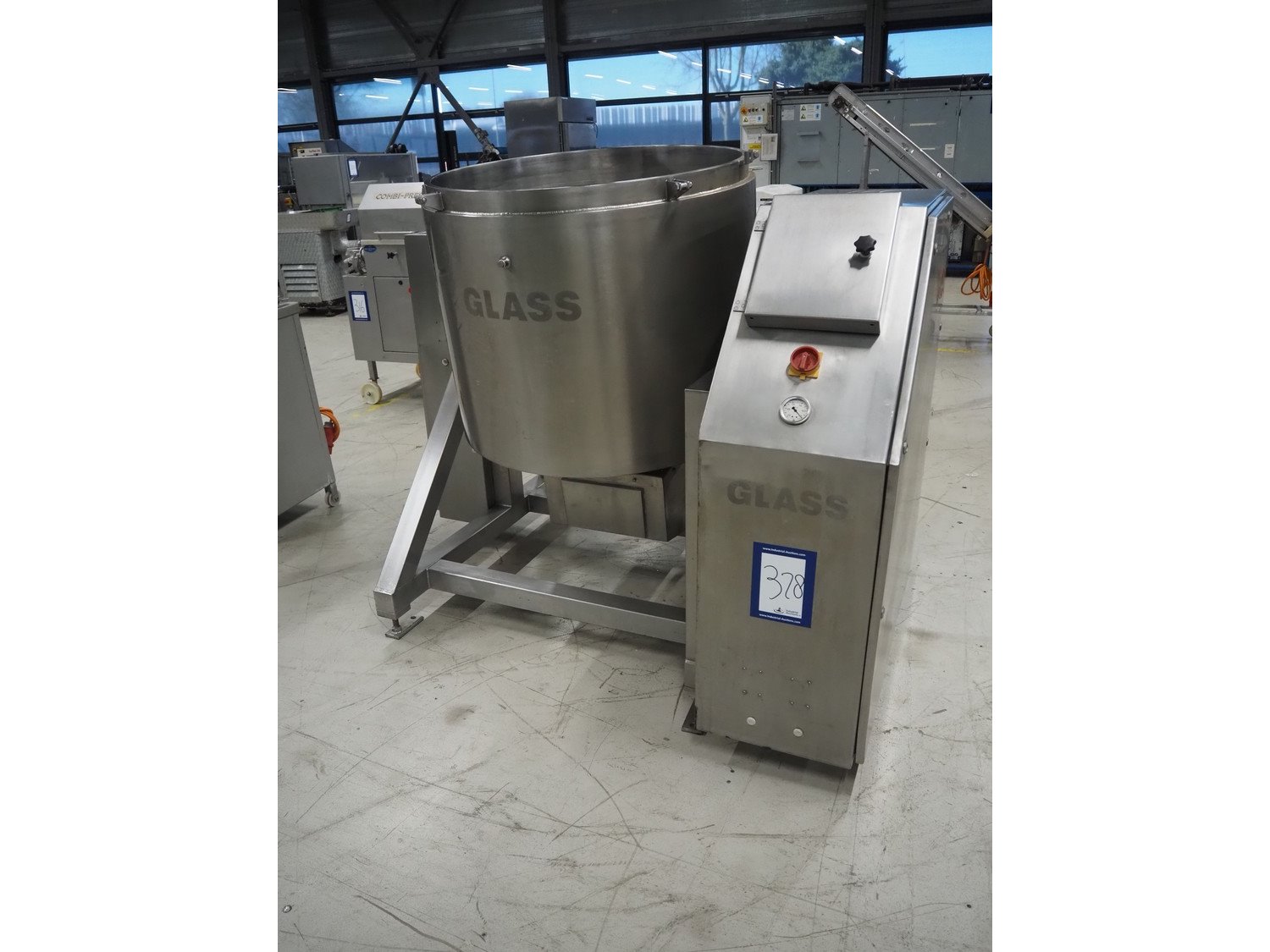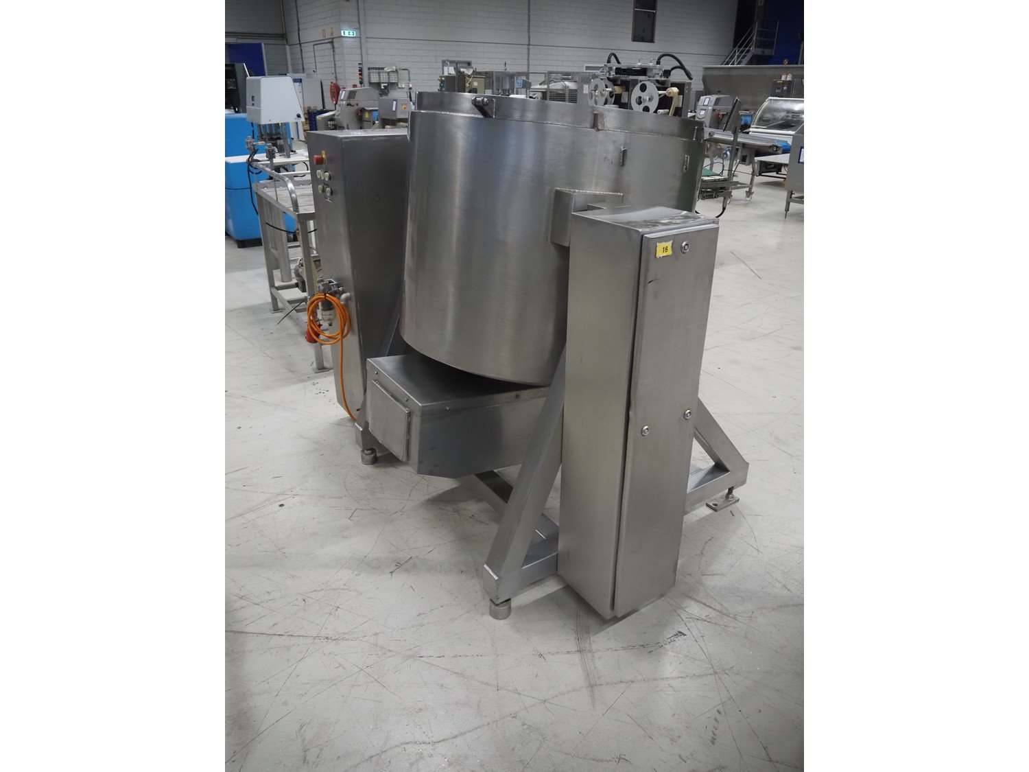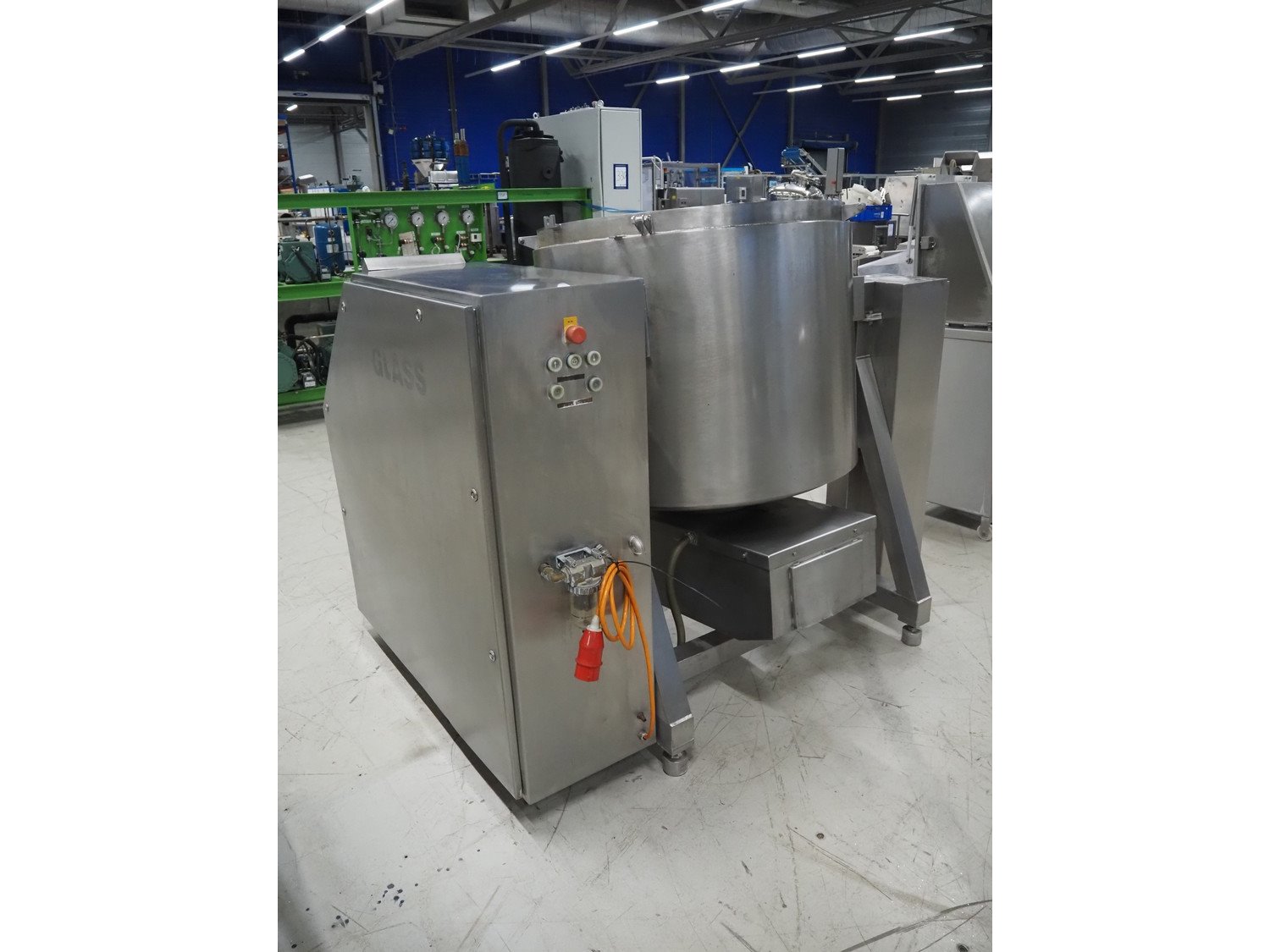 Glass tiltable mixer, type: VSM 600 K, machine number: 2164, year of construction: 1997, 400 V, 50 Hz, 12.6 A, 4.05 kW, volume: 600 litres, dimensions: 1650 mm x 650 mm x 2400 mm. Incomplete, without lid. Kavel locatie: Looyenbeemd 11, 5652 BH Eindhoven, Nederland