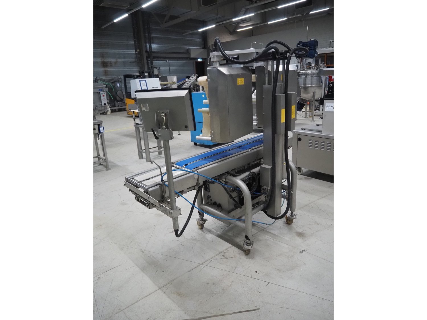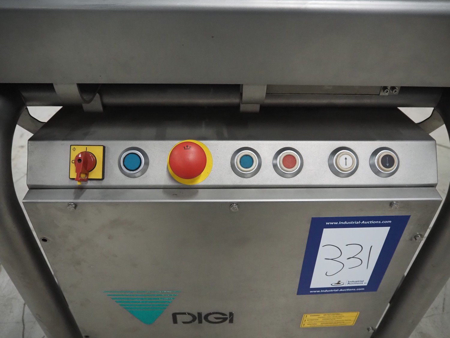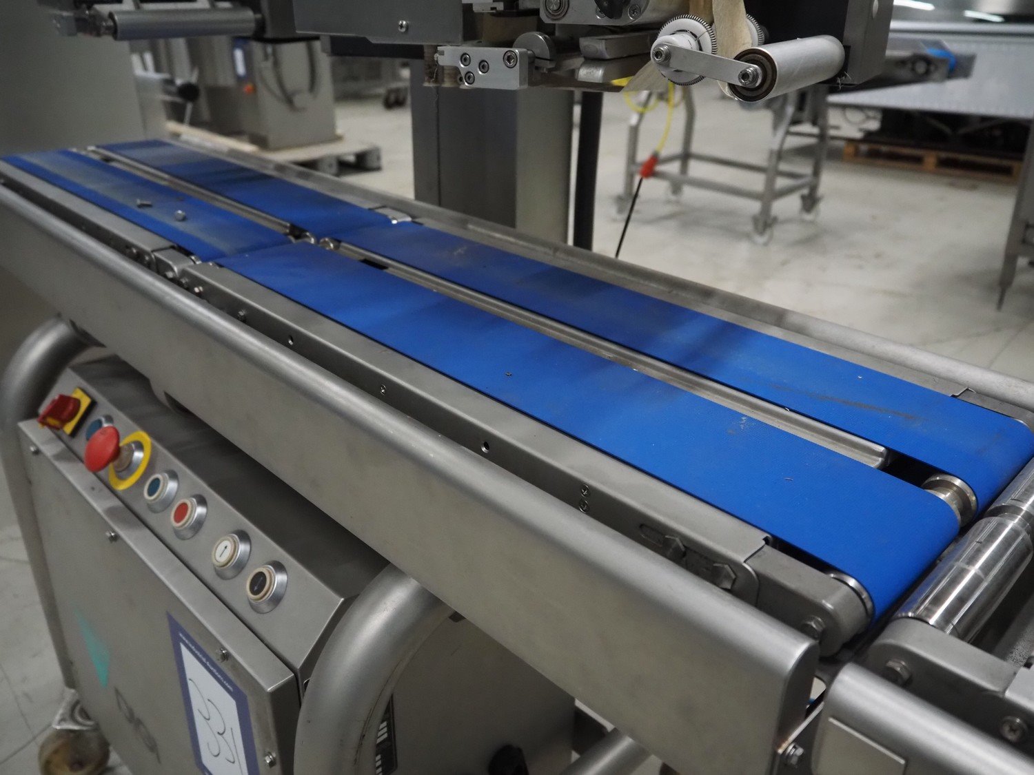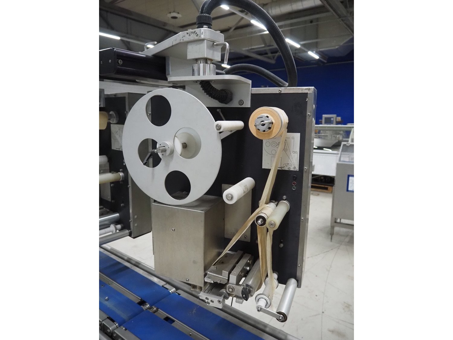 Digi Europe LTD mobile double heads labelling machine, model: HC-700, serial number: 100654003, 230 V, 50 Hz, 1.15 / 0.4 A, maximum speed: 285 packages per minute, plastic belt, belt width: (2x) 100 mm, total dimensions: 1800 mm x 800 mm x 1800 mm. Kavel locatie: Looyenbeemd 11, 5652 BH Eindhoven, Nederland