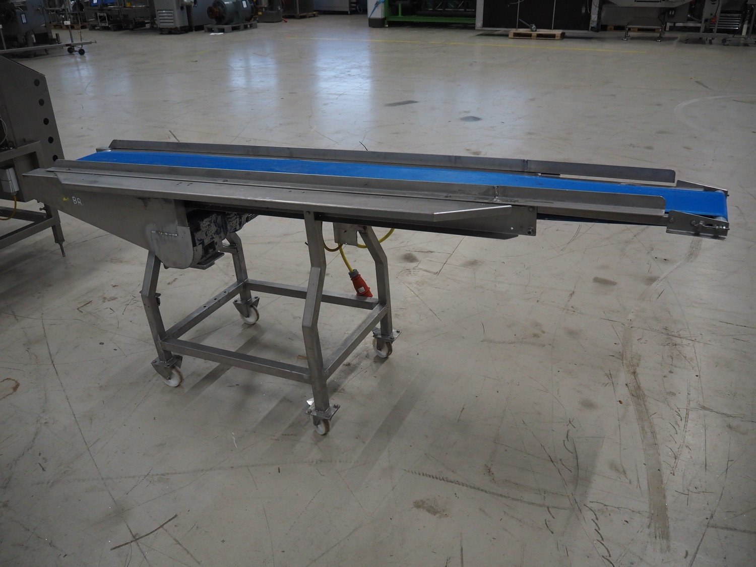 Mobile transport belt, s/s frame, plastic belt, belt width: 220 mm, total dimensions: 2600 mm x 600 mm x 1010 mm. Kavel locatie: Looyenbeemd 11, 5652 BH Eindhoven, Nederland