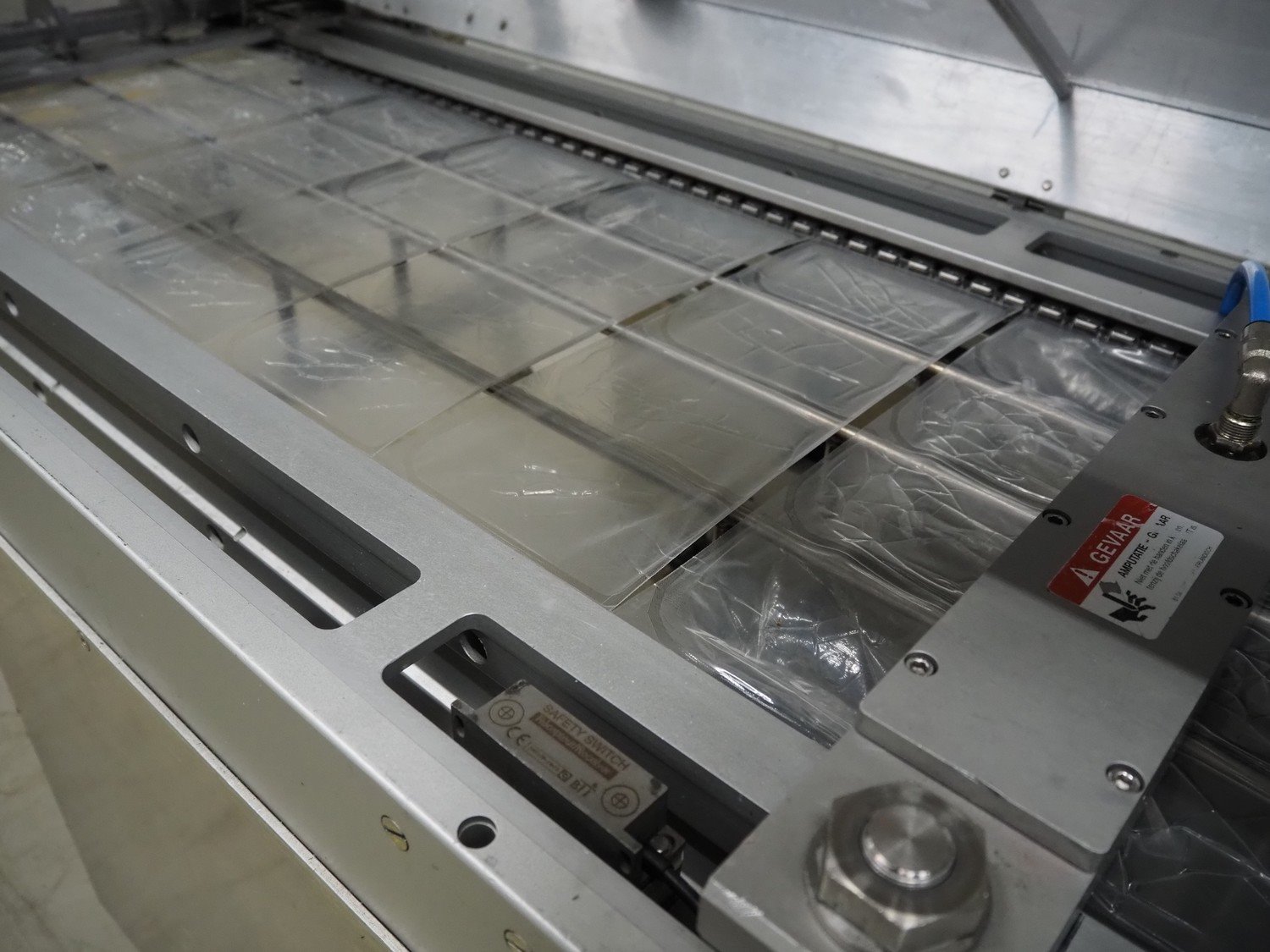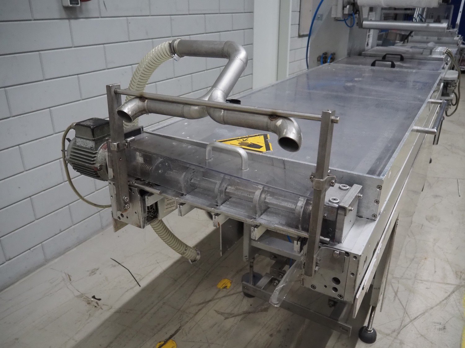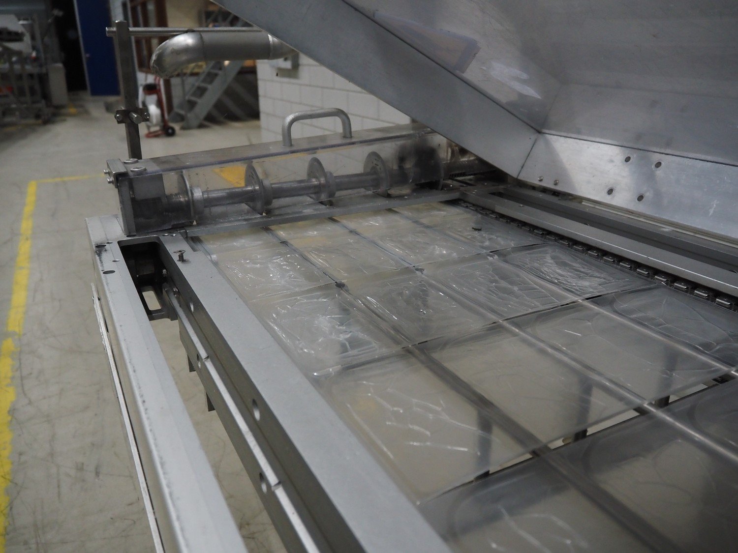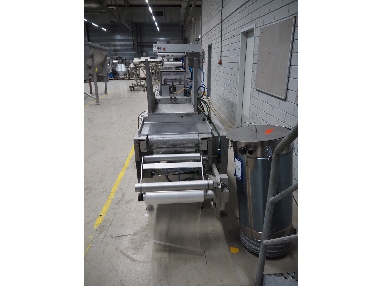 Multivac thermoformer, type: R7000 PC, machine number: 10192/33, year of construction: 1991, 380 V, 3 Ph, 50 Hz, 48 A, 18 kW, film width: 455 mm, dye: (12x) 85 mm x 150 mm, total dimensions: 7350 mm x 1100 mm x 1950 mm. Including suction device for rest film, dimensions: 530 mm x 530 mm x 1060 mm. Kavel locatie: Looyenbeemd 11, 5652 BH Eindhoven, Nederland