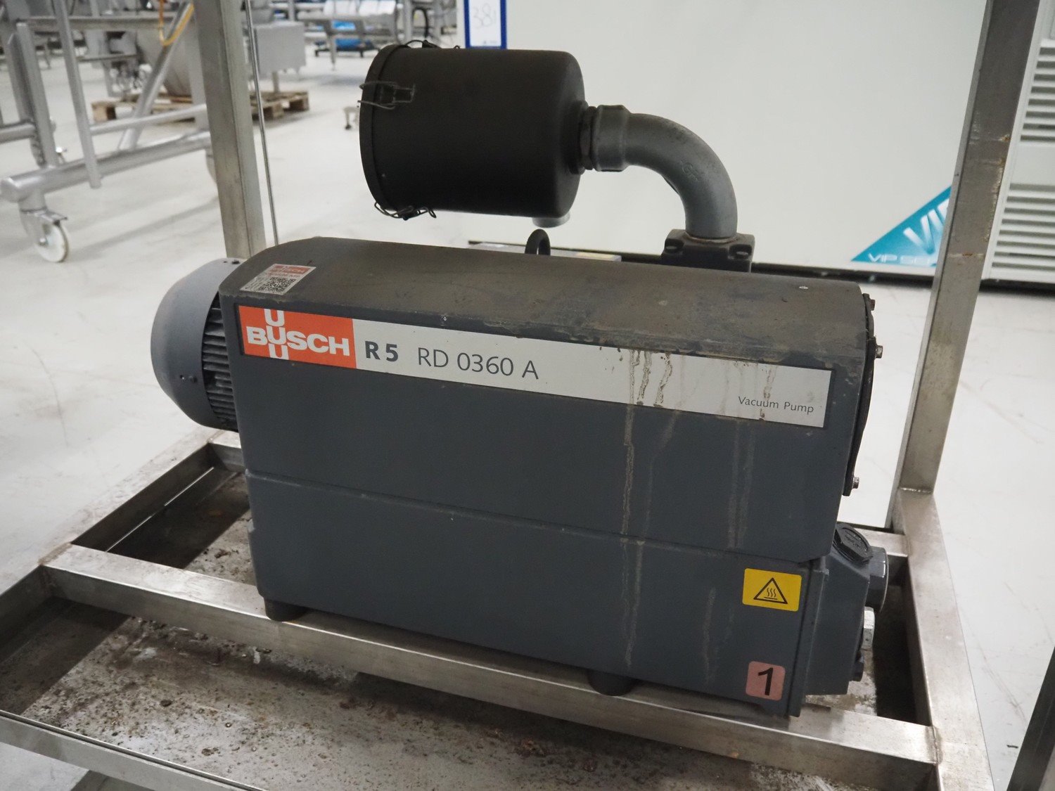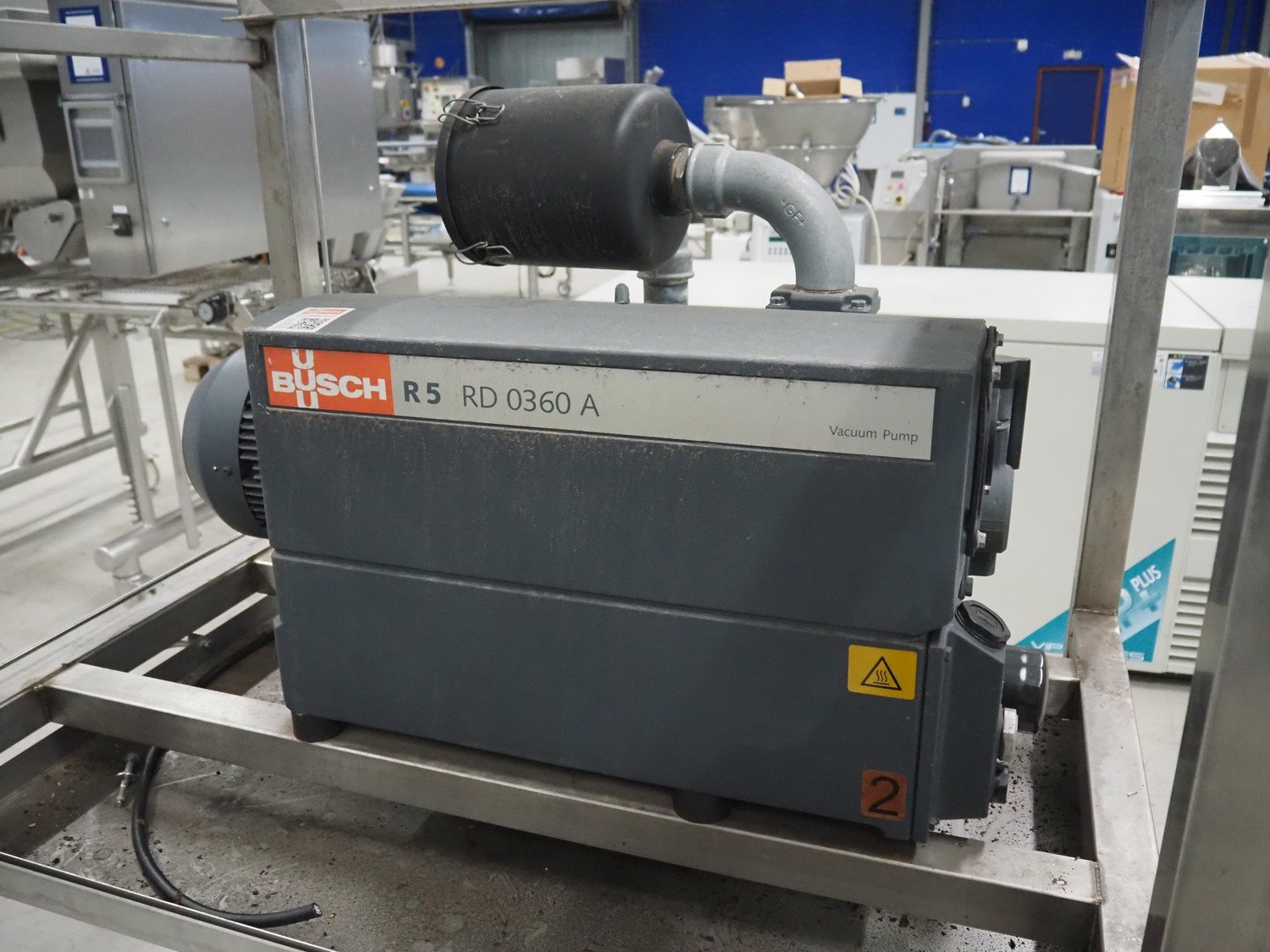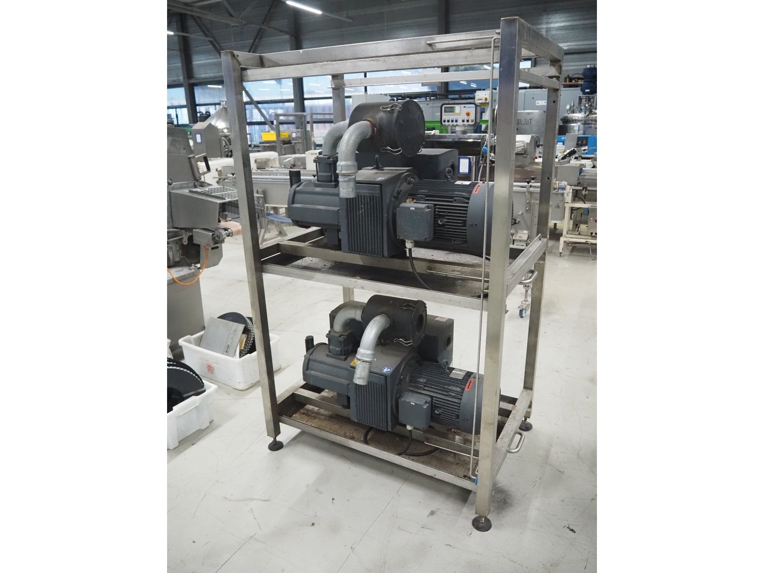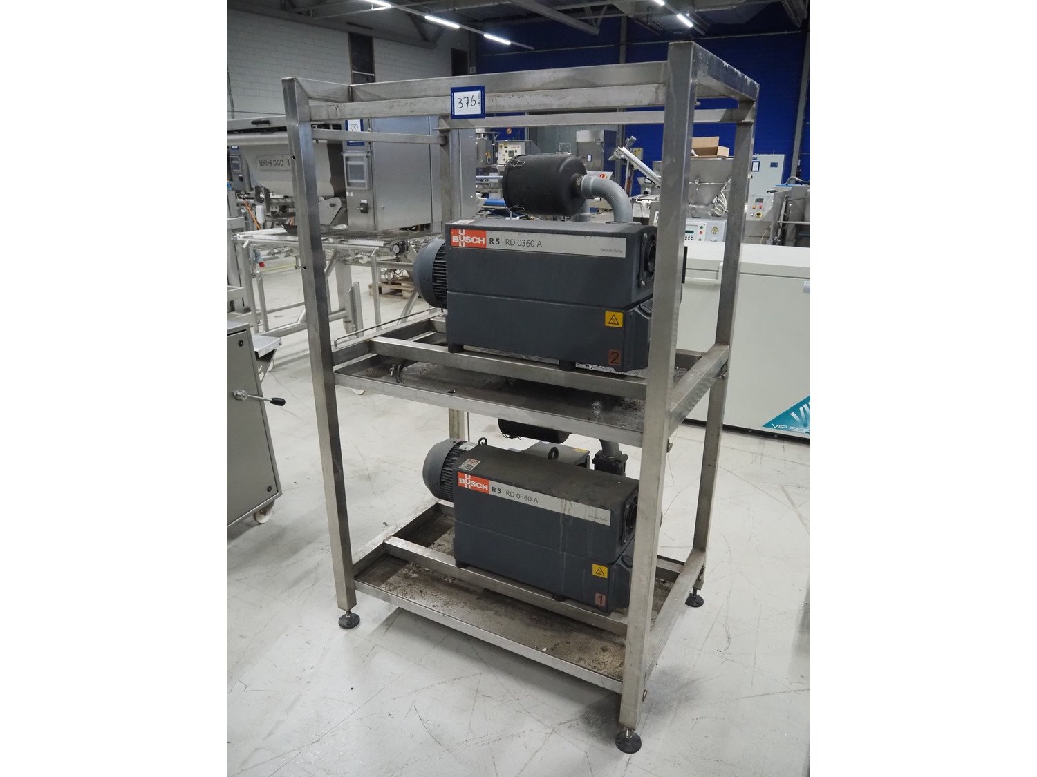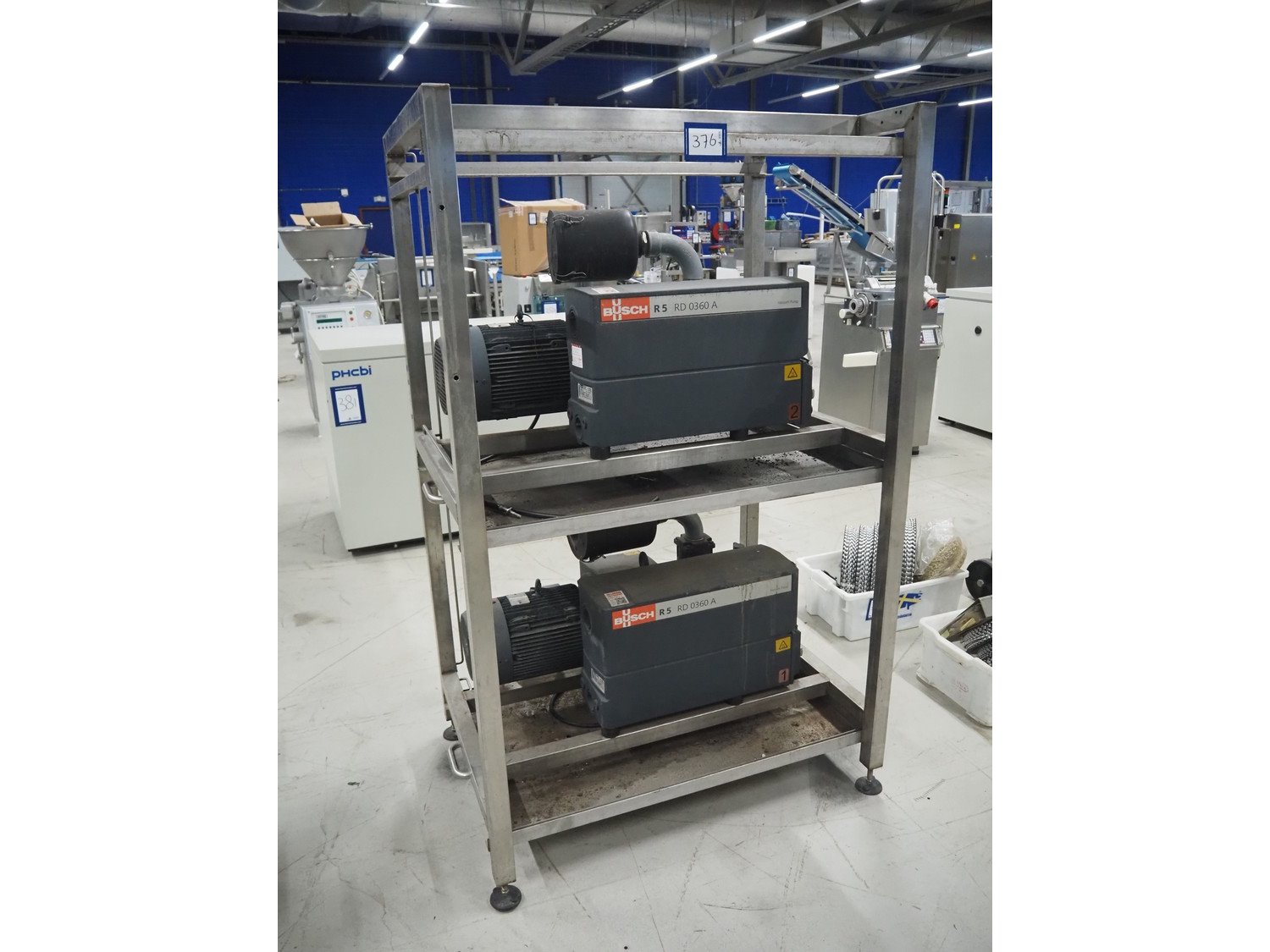 S/s rack with 2 Busch vacuum pumps, type: (2x) RD 0360 A 503, serial number: CHM120330107 / CHM120330110, year of construction: 2020, capacity: (2x) 300 m³ per hour, total dimensions: 1150 mm x 800 mm x 1850 mm. Kavel locatie: Looyenbeemd 11, 5652 BH Eindhoven, Nederland