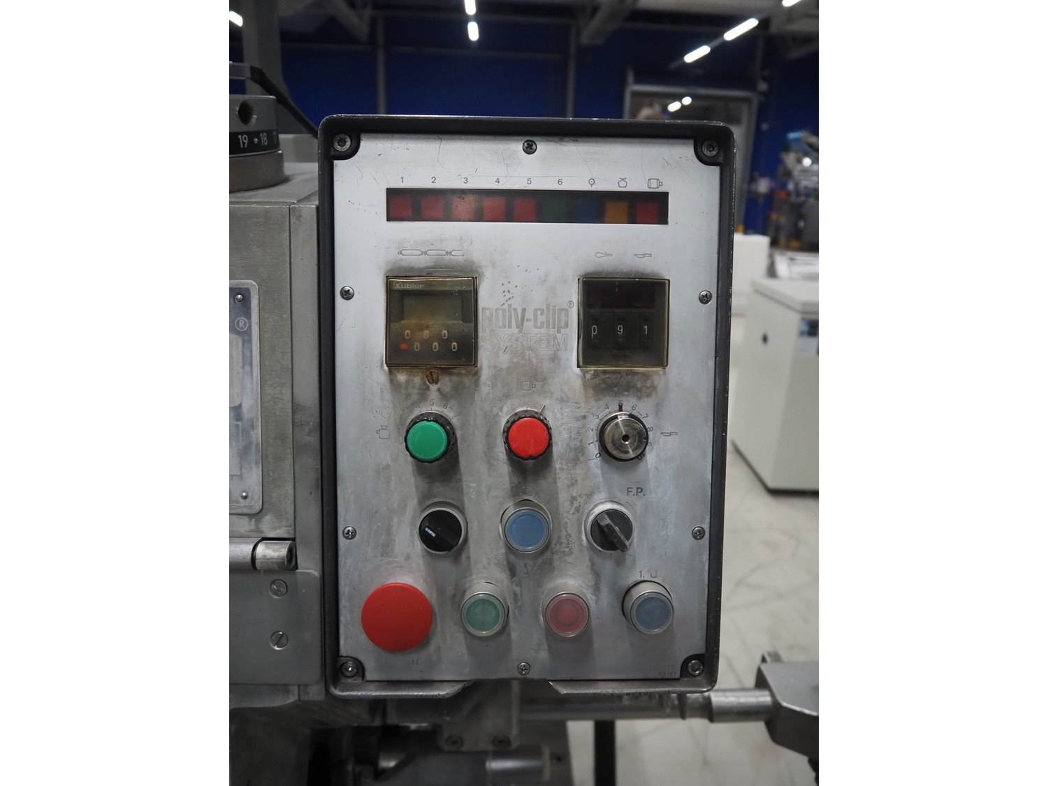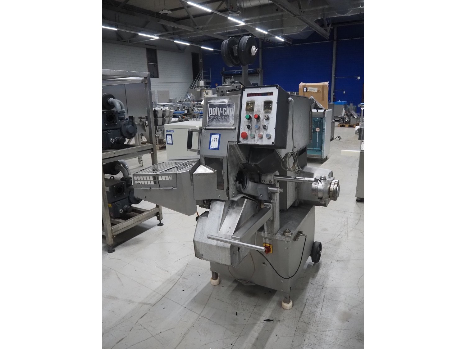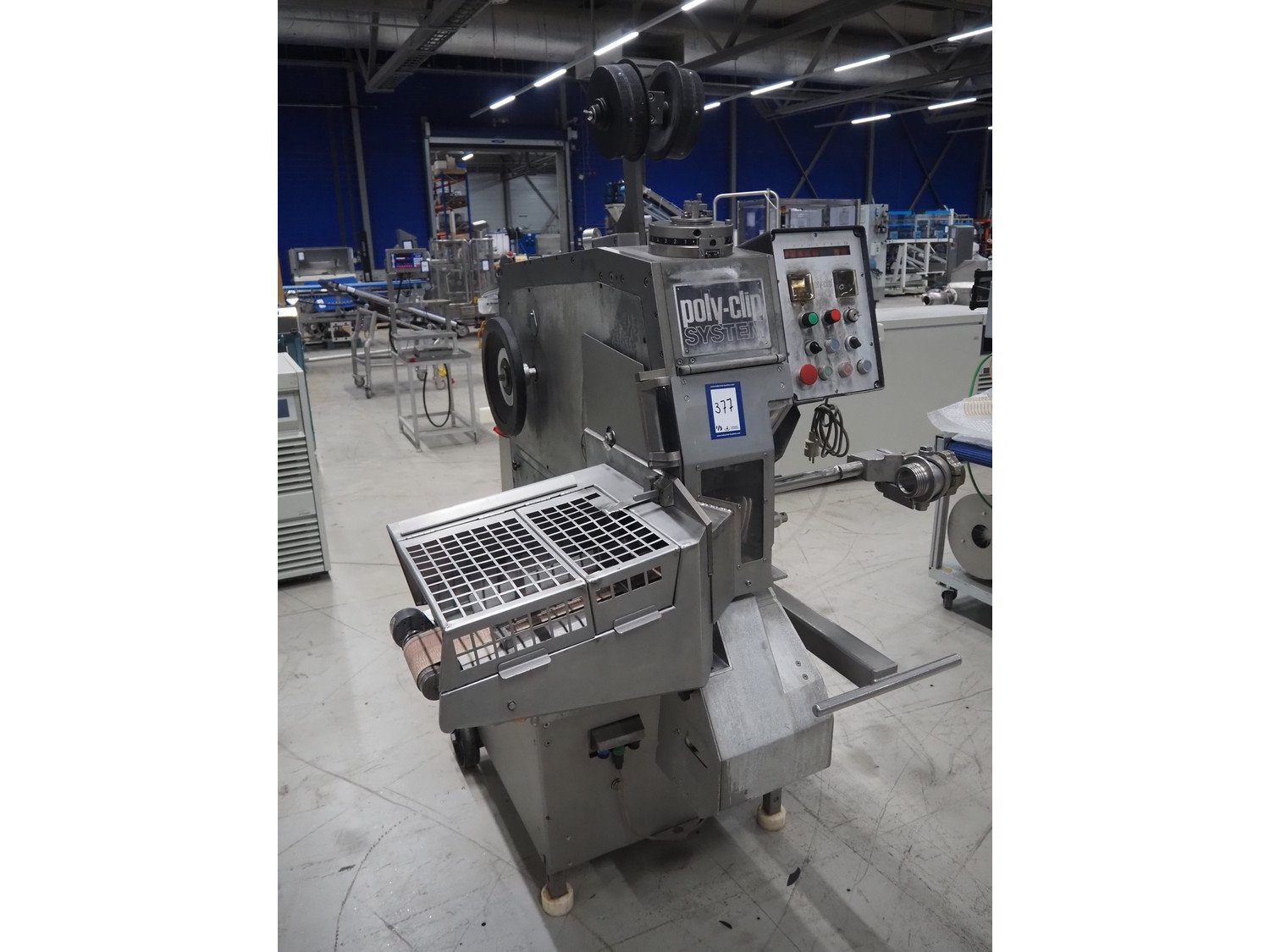 Poly-clip System GmbH mobile double clipper, type: FCA 3461, plastic outfeed belt, belt width: 300 mm, total dimensions: 1350 mm x 1300 mm x 1950 mm. Including 2 crates with clips. Kavel locatie: Looyenbeemd 11, 5652 BH Eindhoven, Nederland