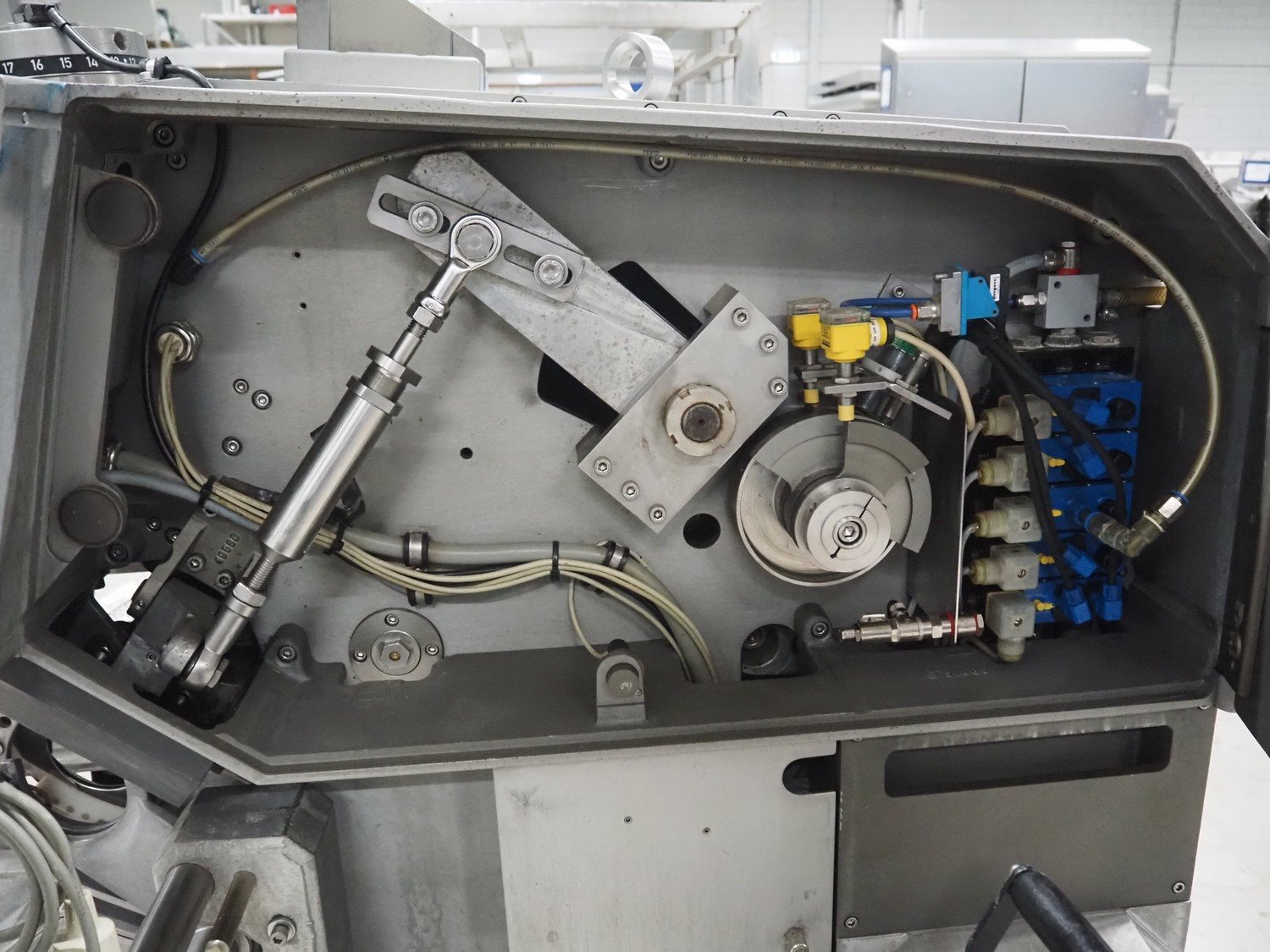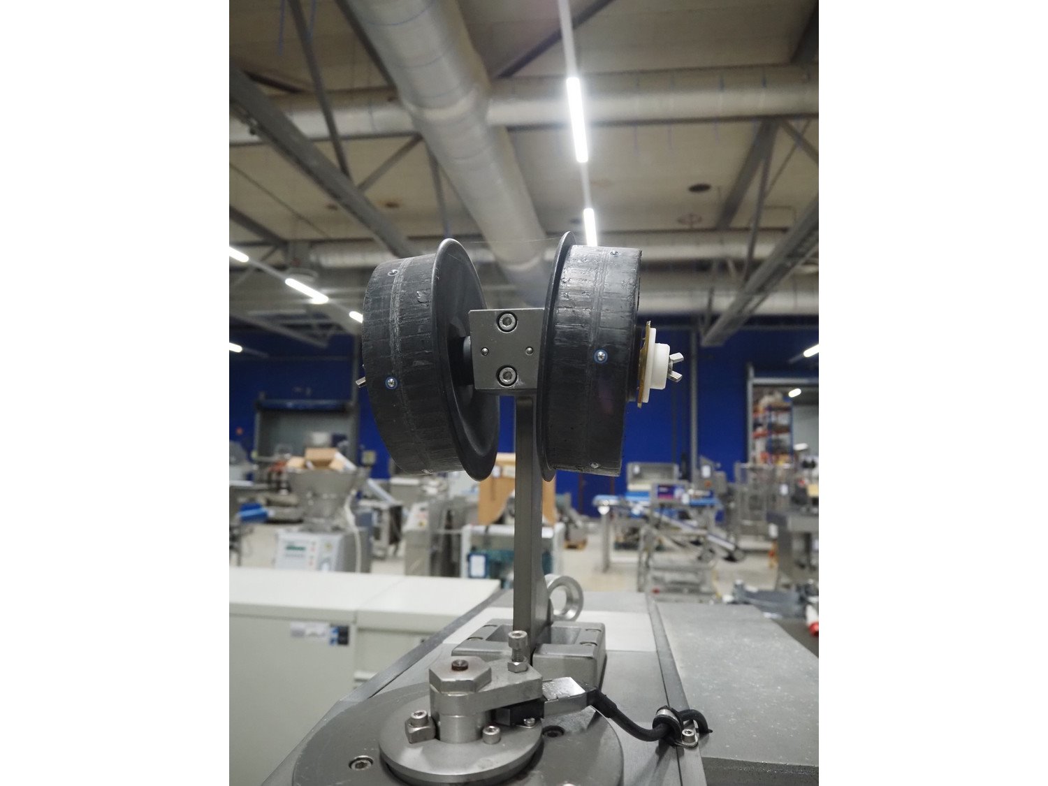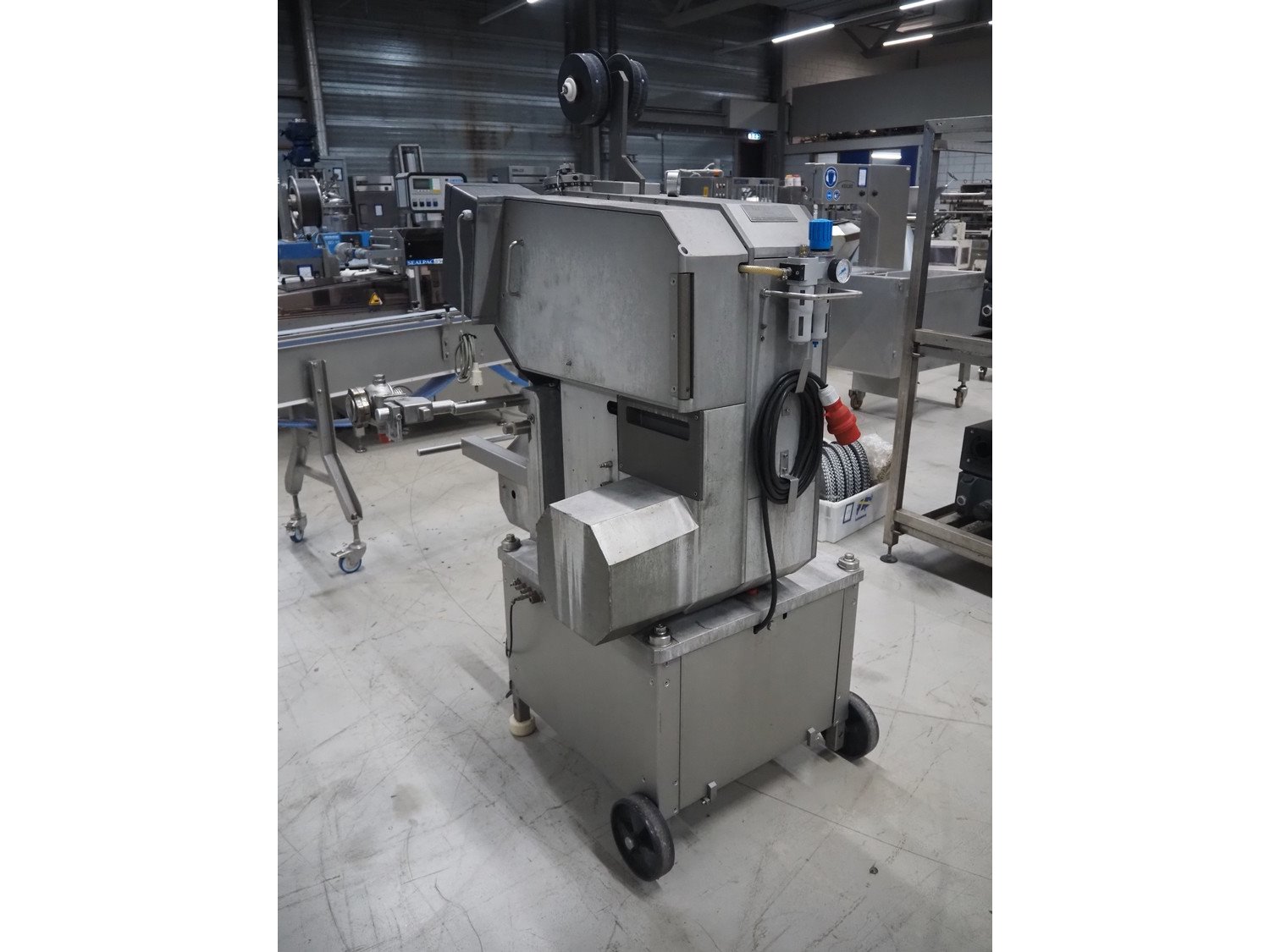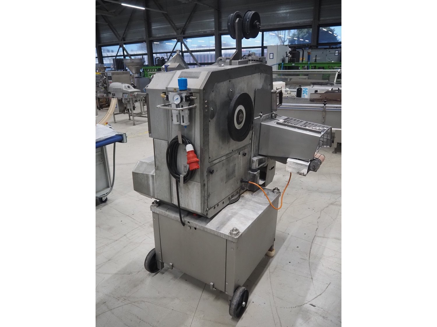 Poly-clip System GmbH mobile double clipper, type: FCA 3461, plastic outfeed belt, belt width: 300 mm, total dimensions: 1350 mm x 1300 mm x 1950 mm. Including 2 crates with clips. Kavel locatie: Looyenbeemd 11, 5652 BH Eindhoven, Nederland