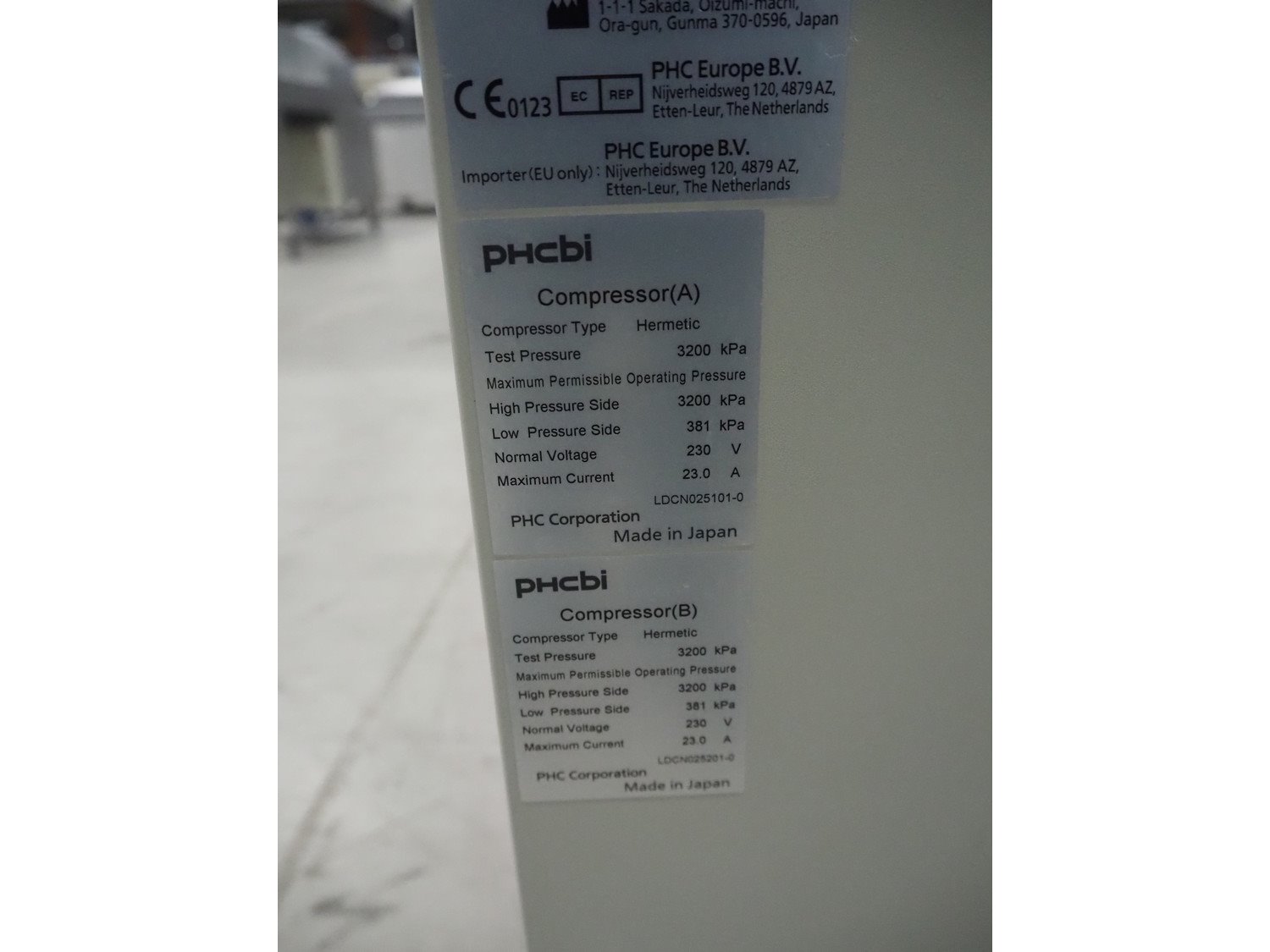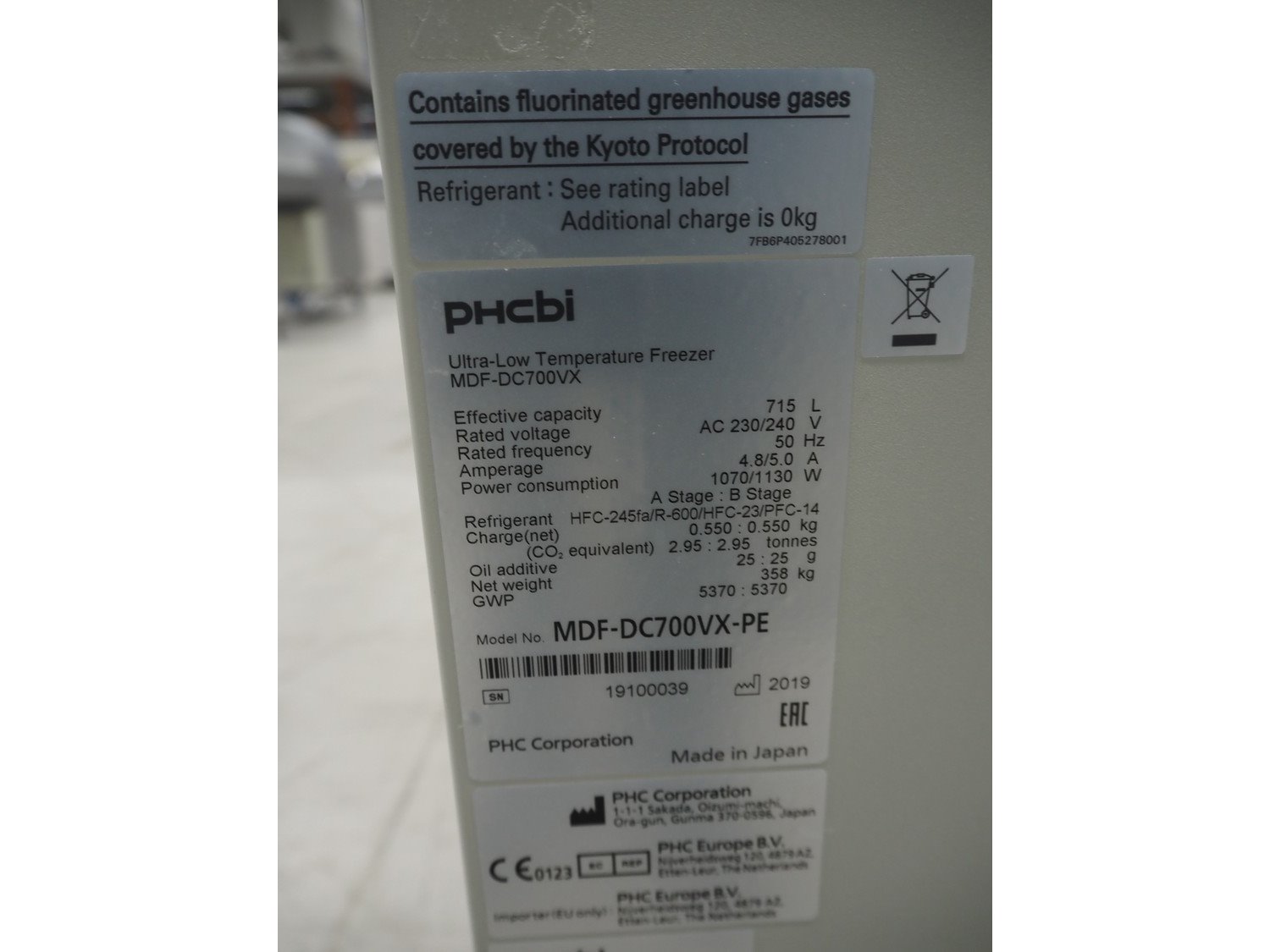 PHCBI ultra-low temperature freezer, model: MDF-DC700VX-PE, serial number: 19100039, year of construction: 2019, 230/240 V, 50 Hz, 4.8/5.0 A, 1070/1130 W, refrigerant: HFC-245fa/R-600/HFC-23/PFC-14, 0.550 kg, volume: 715 liter, dimensions: 2300 mm x 960 mm x 1070 mm. Kavel locatie: Looyenbeemd 11, 5652 BH Eindhoven, Nederland