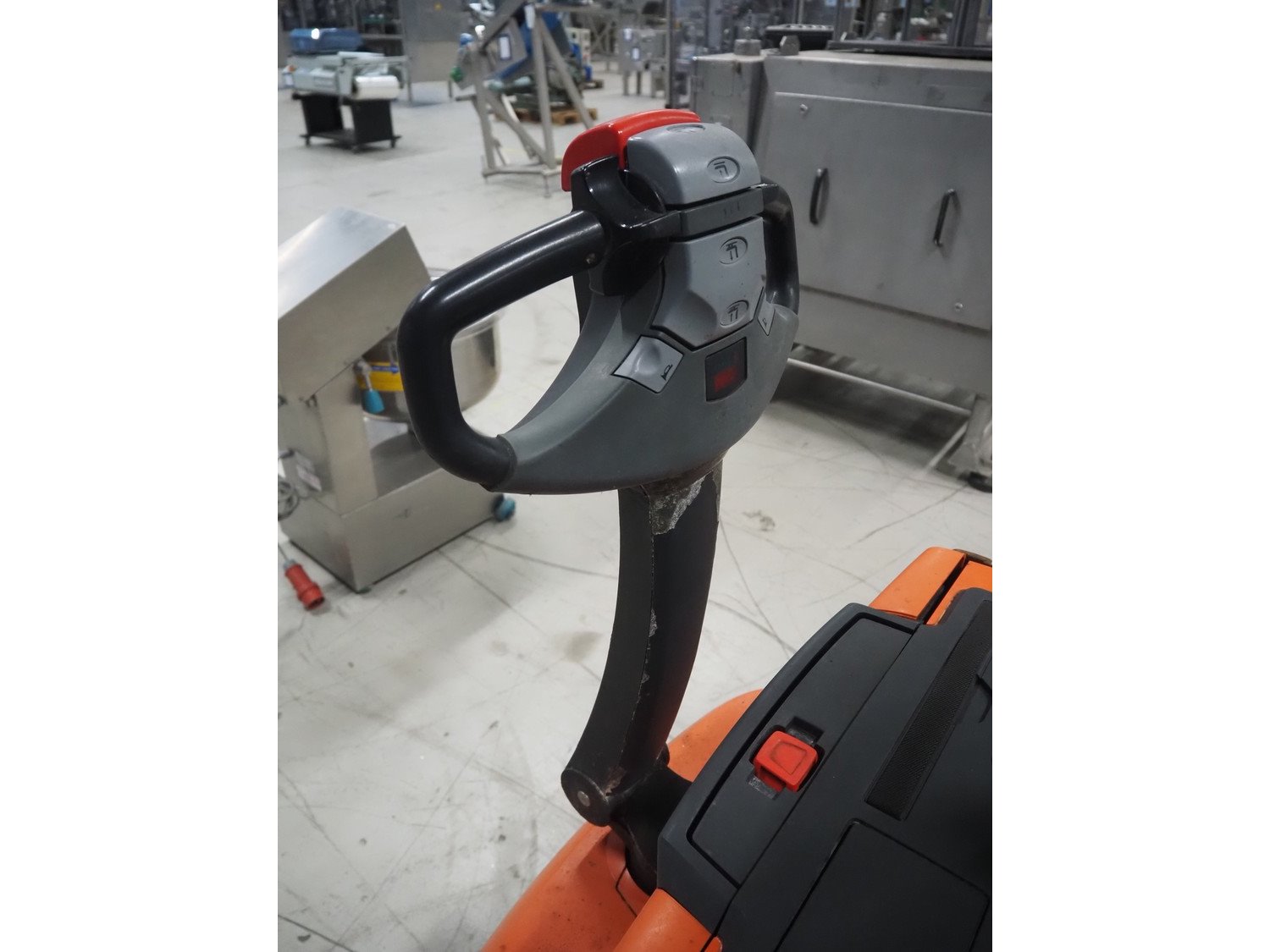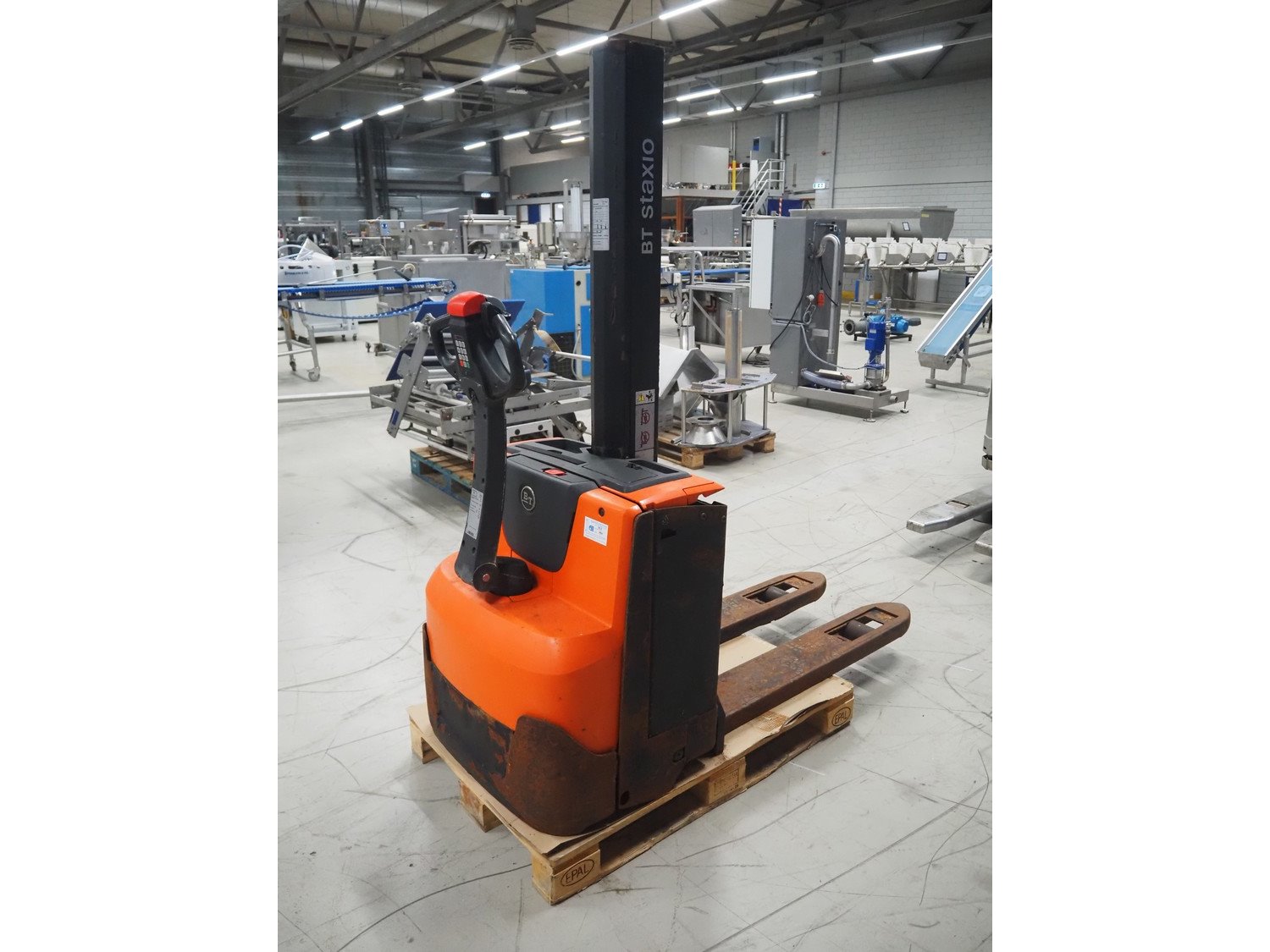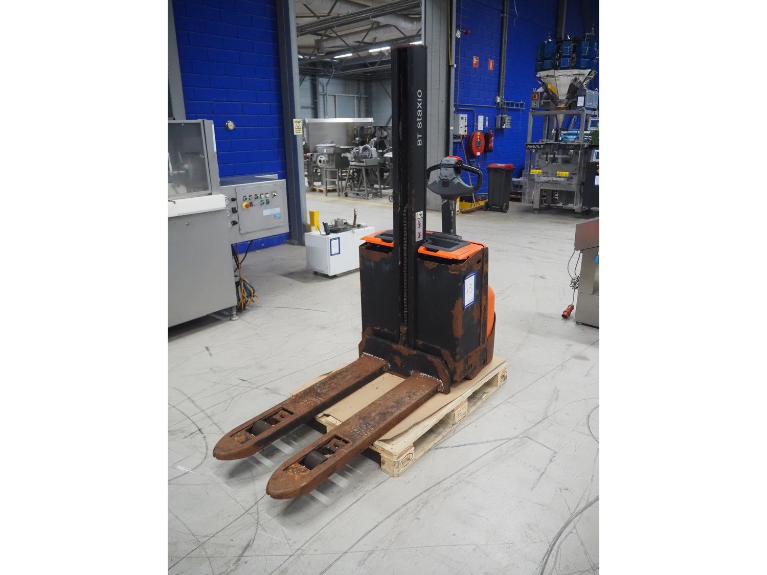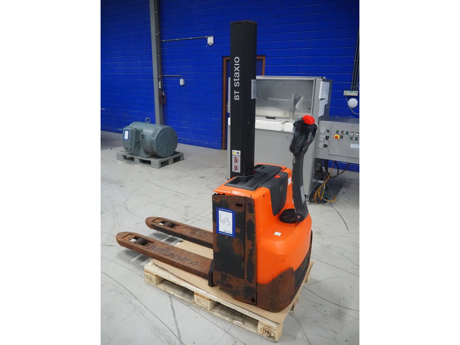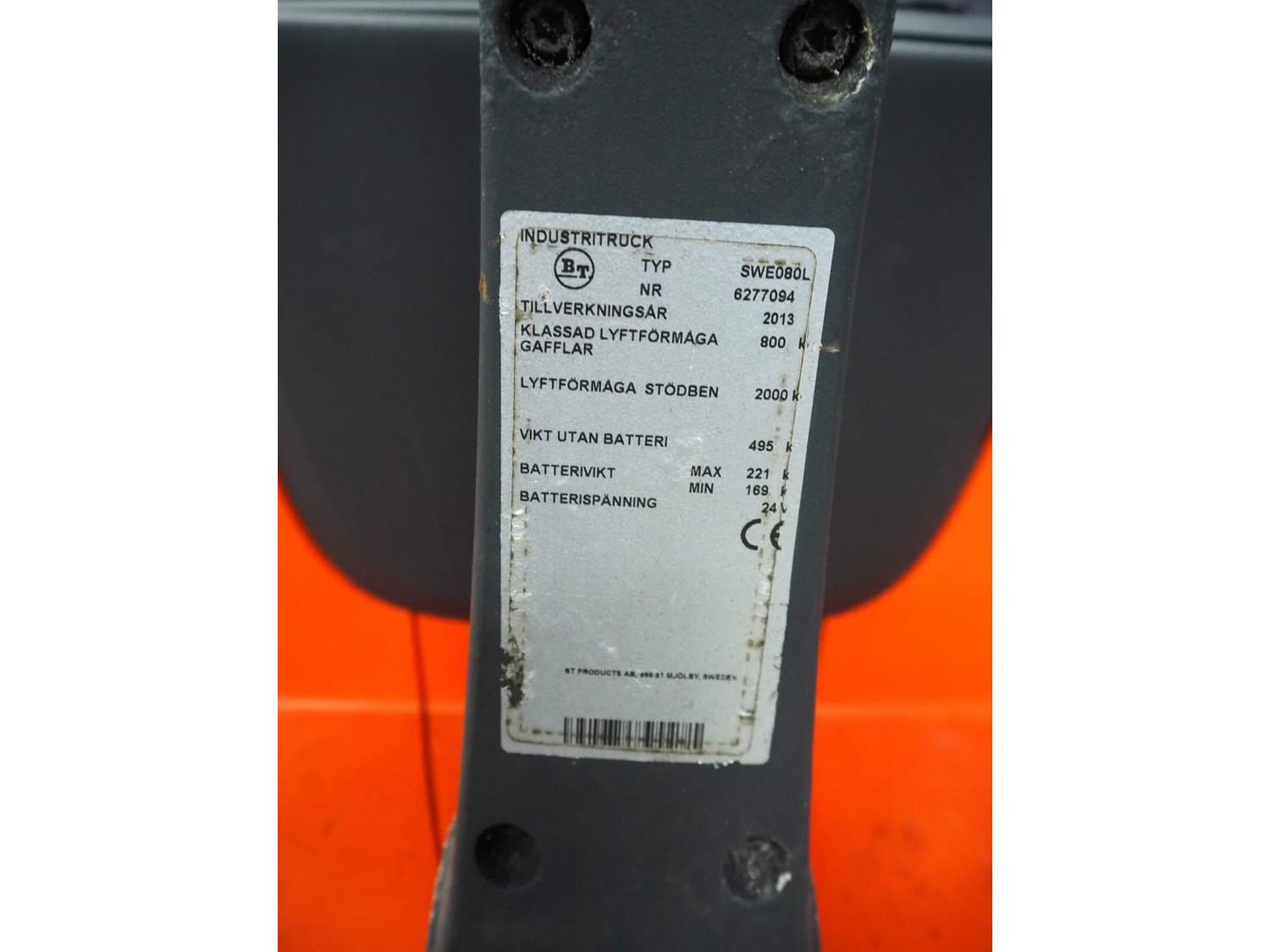 BT electric pallet lifter, type: SWE080L, number: 6277094, year of construction: 2013, capacity: 2000 kg, fork length: 1150 mm, total dimensions: 1800 mm x 750 mm x 1840 mm. Kavel locatie: Looyenbeemd 11, 5652 BH Eindhoven, Nederland