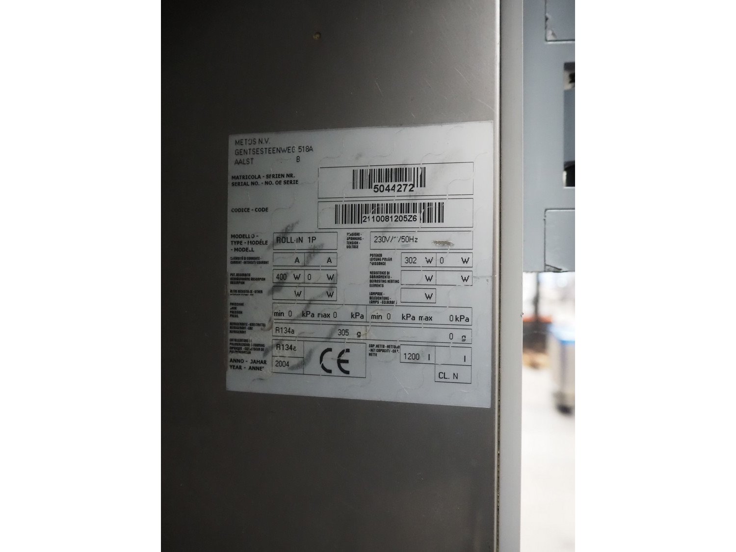 METOS N.V. drive-in refrigerator, model: ROLL-IN 1P, serial number: 5044272, year of construction: 2004, 230 V, 50 Hz, refrigerant: R134a/305 g, dimensions: 1050 mm x 870 mm x 1250 mm. Kavel locatie: Looyenbeemd 11, 5652 BH Eindhoven, Nederland