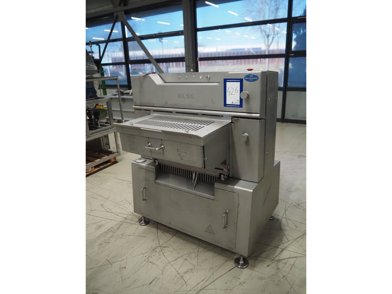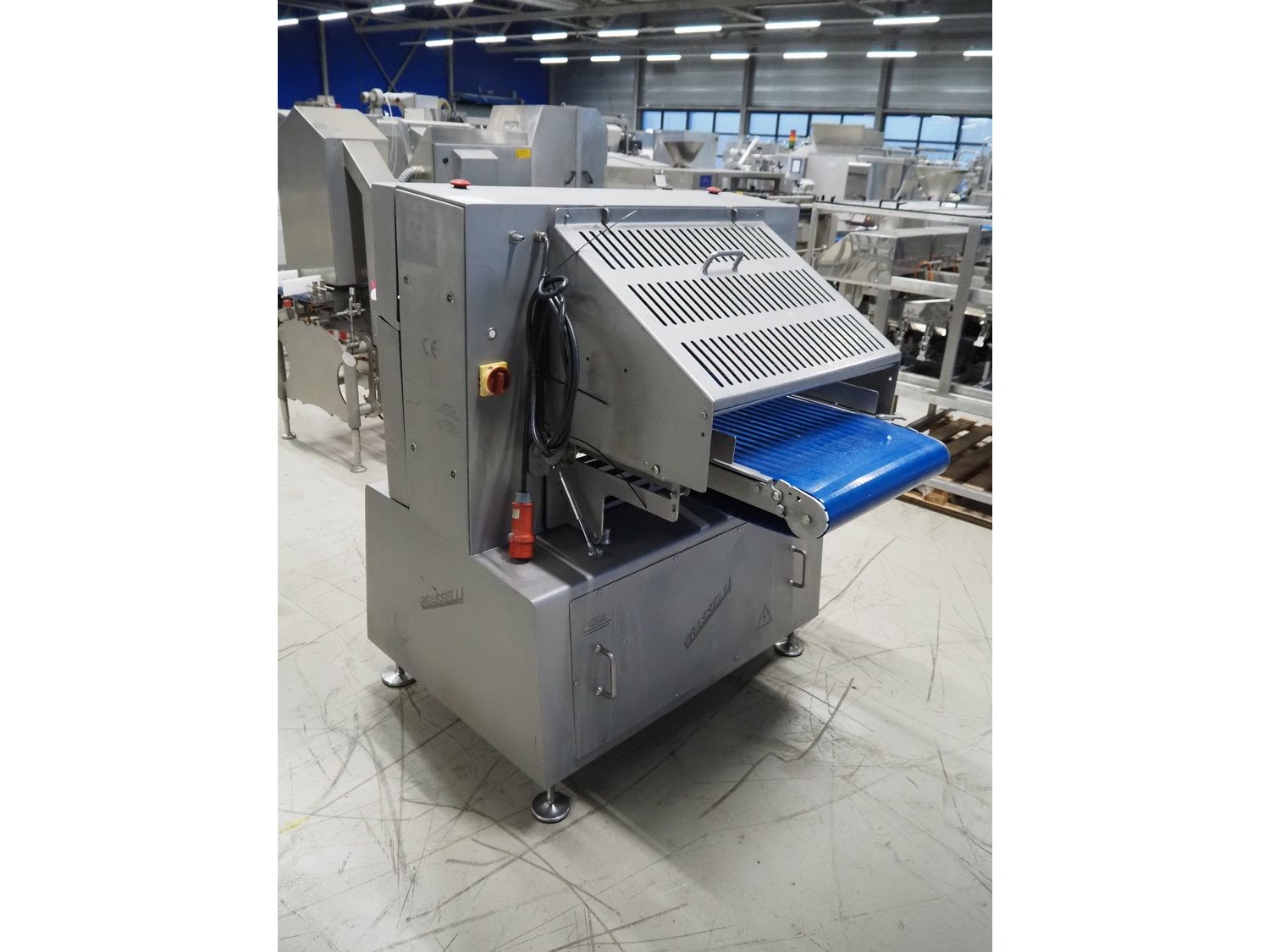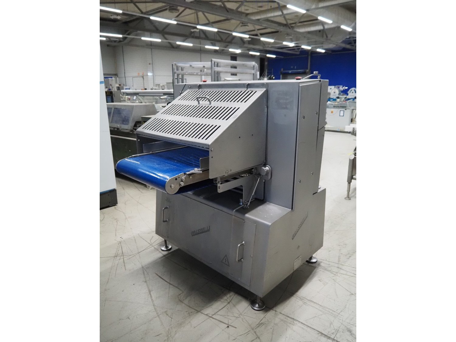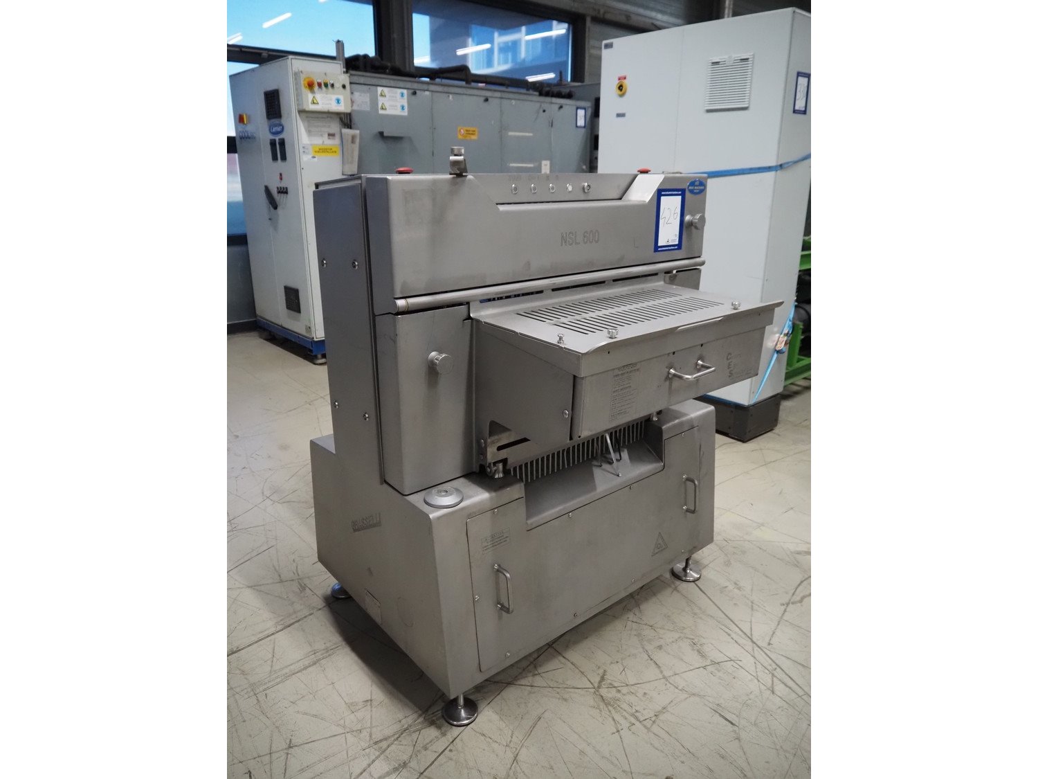 Grasselli SpA slicer, model: NSL 600, serial number: Y13003/839, year of construction: 2008, 400 V, 3 Ph, 50 Hz, 4 kW, working width: 610 mm, distance between knives: 20 mm, plastic belt, belt width: 540 mm, total dimensions: 1500 mm x 1200 mm x 1500 mm. Some knives are broken. Kavel locatie: Looyenbeemd 11, 5652 BH Eindhoven, Nederland
