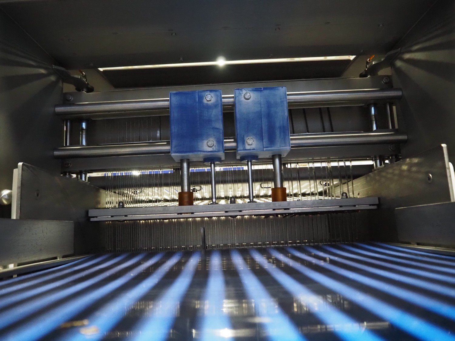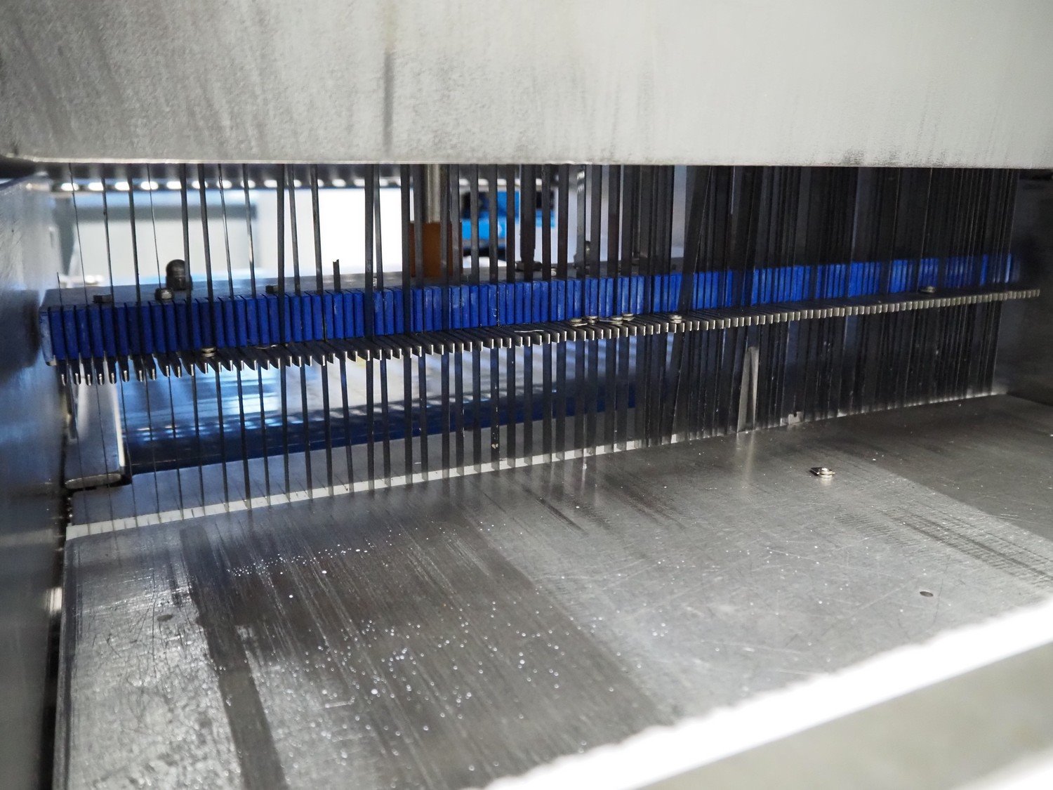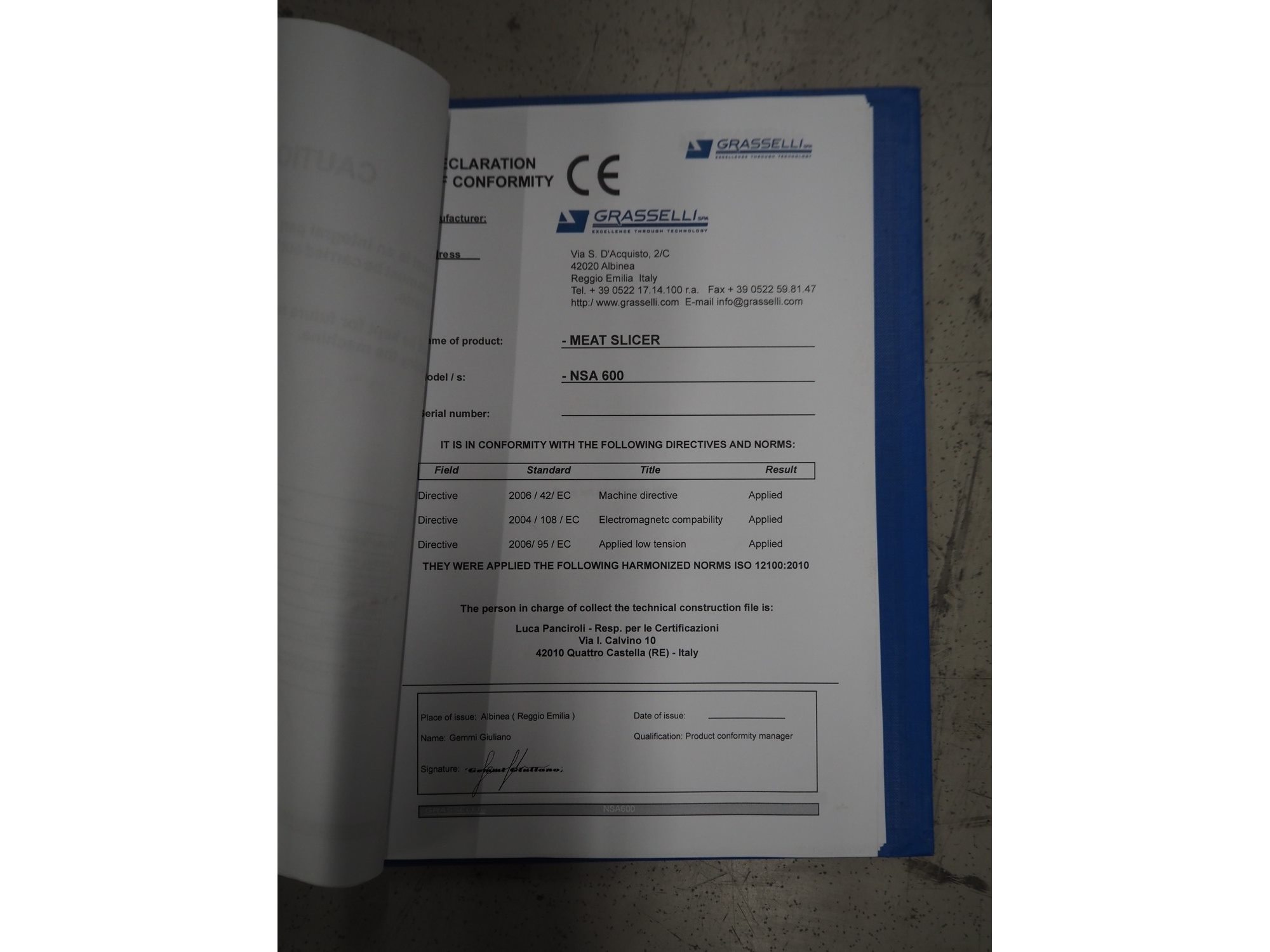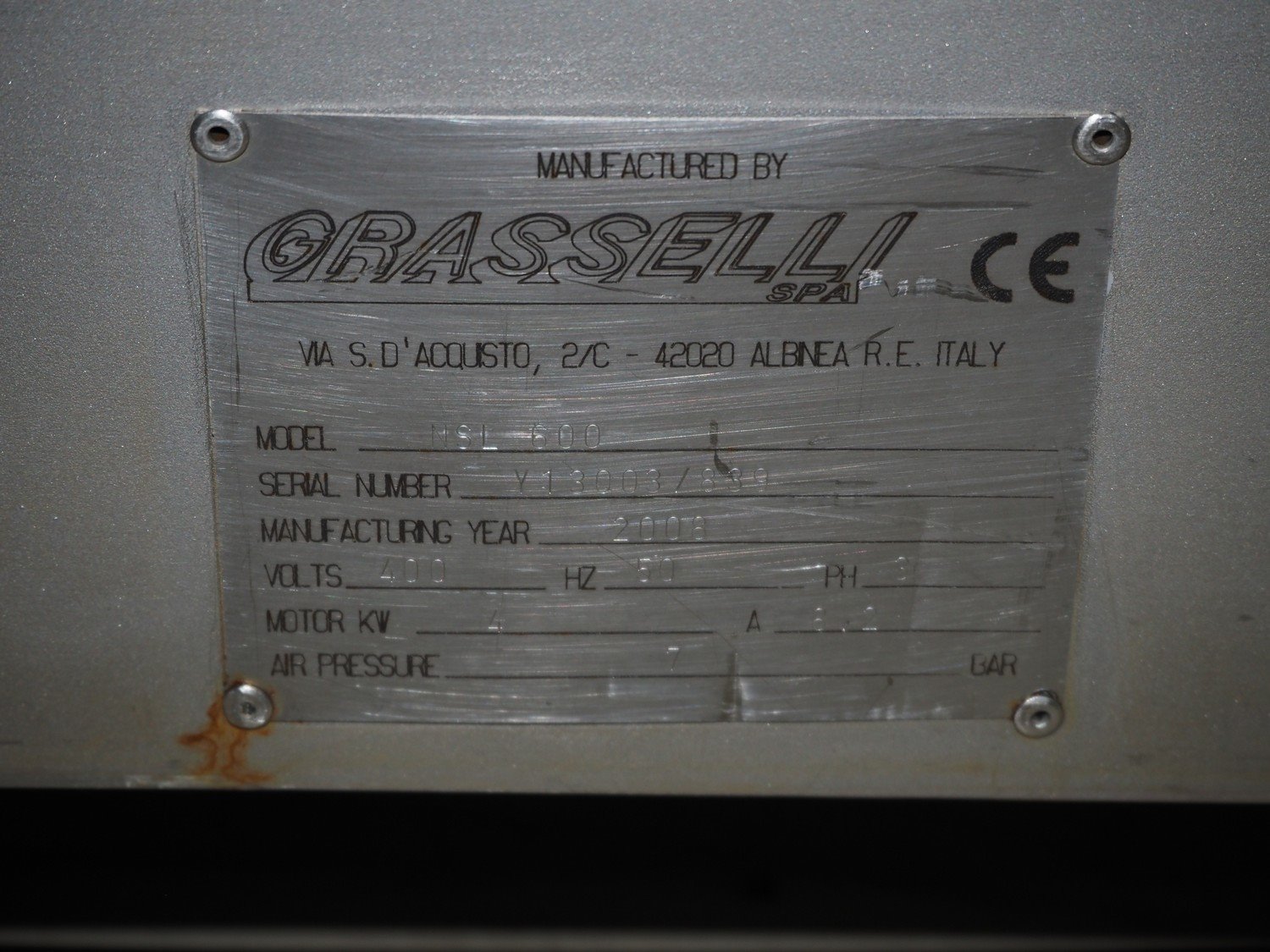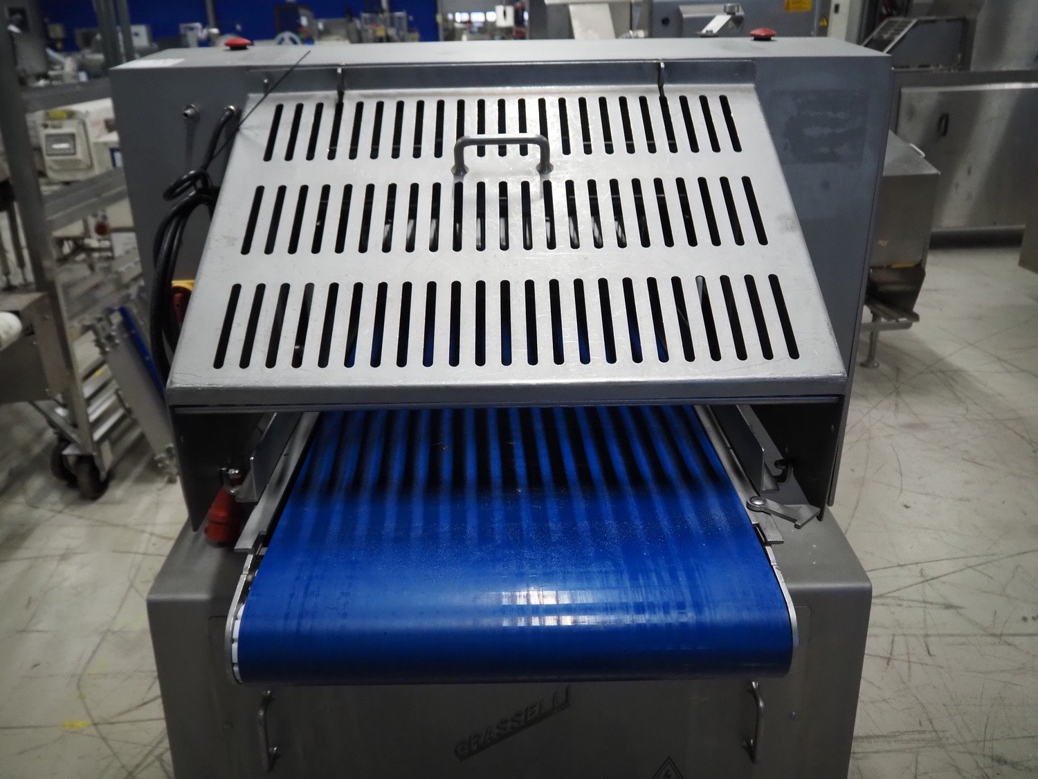 Grasselli SpA slicer, model: NSL 600, serial number: Y13003/839, year of construction: 2008, 400 V, 3 Ph, 50 Hz, 4 kW, working width: 610 mm, distance between knives: 20 mm, plastic belt, belt width: 540 mm, total dimensions: 1500 mm x 1200 mm x 1500 mm. Some knives are broken. Kavel locatie: Looyenbeemd 11, 5652 BH Eindhoven, Nederland