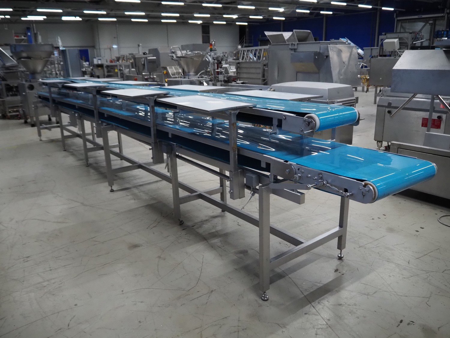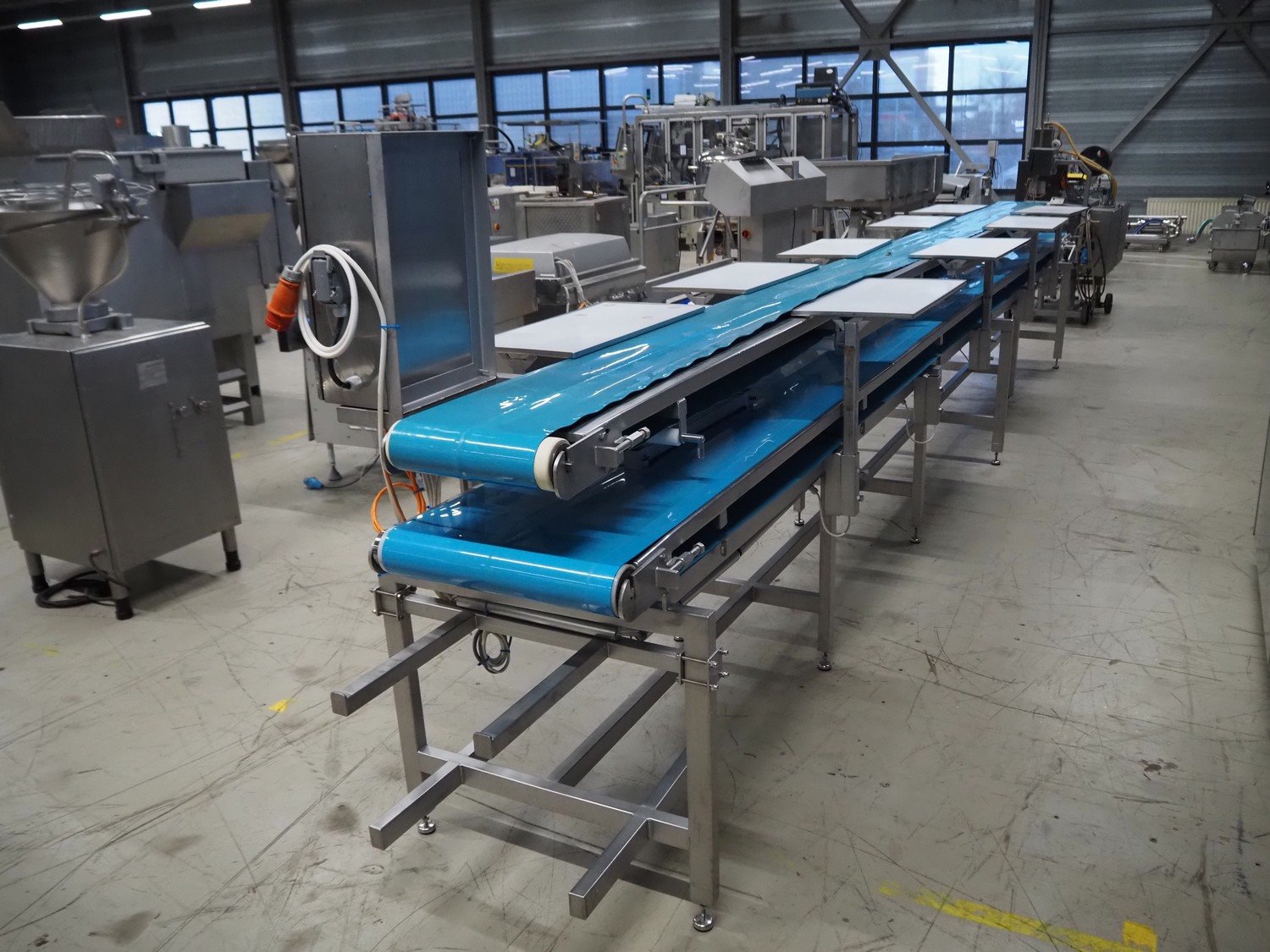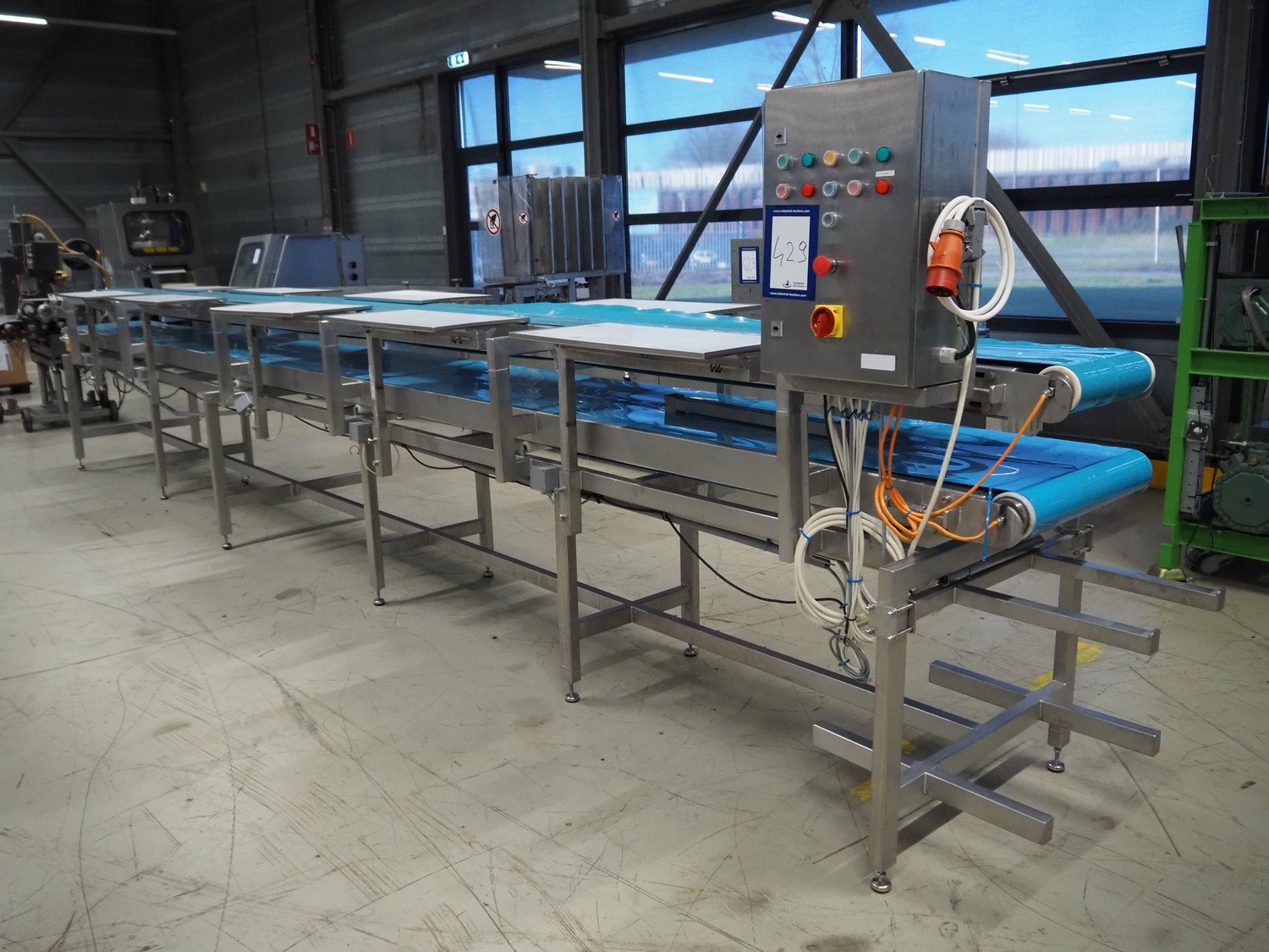 Sorting belt, s/s frame, plastic belts, belt width: 345 mm and 570 mm, total dimensions: 7800 mm x 1100 mm x 1820 mm. Kavel locatie: Looyenbeemd 11, 5652 BH Eindhoven, Nederland