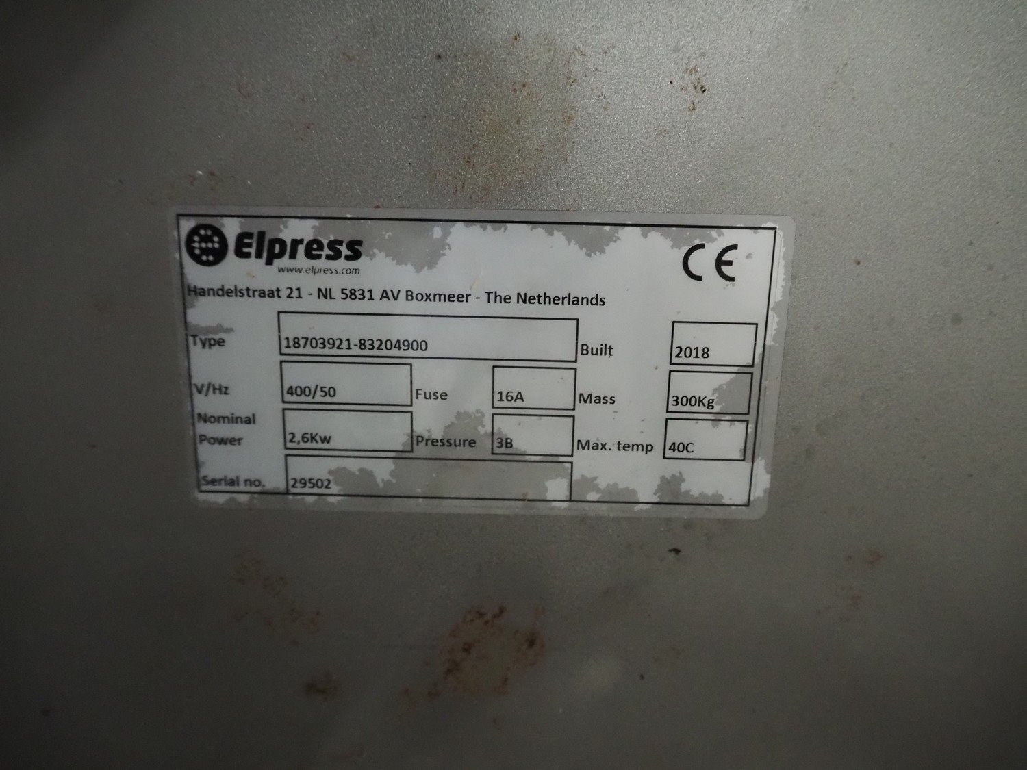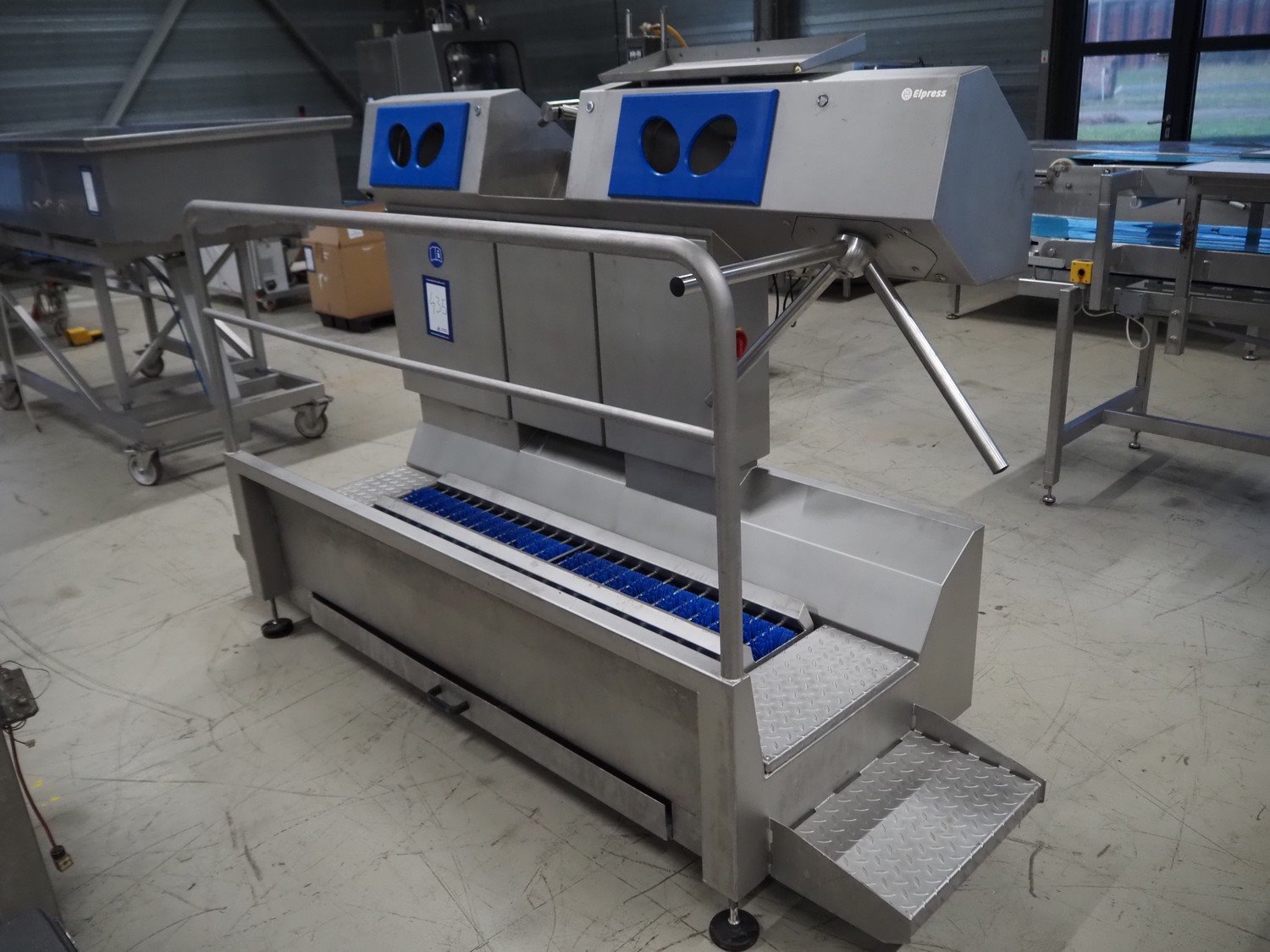 Elpress hygiene station, consisting of: soap dispenser, sink with faucet, hand disinfection unit, hand dryer, sole cleaner and tourniquet, type: 18703921-83204900, serial number: 29502, year of construction: 2018, 400 V, 50 Hz, 16 A, 2.6 kW, pressure: 3 bar, weight: 300 kg, brush length: (2x) 1450 mm, total dimensions: 2650 mm x 1050 mm x 1680 mm. Kavel locatie: Looyenbeemd 11, 5652 BH Eindhoven, Nederland