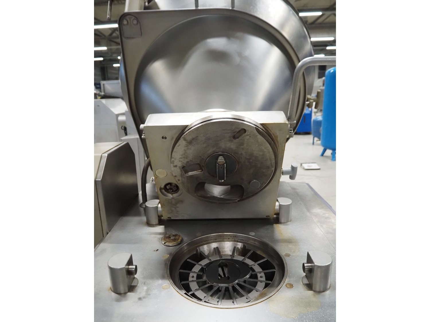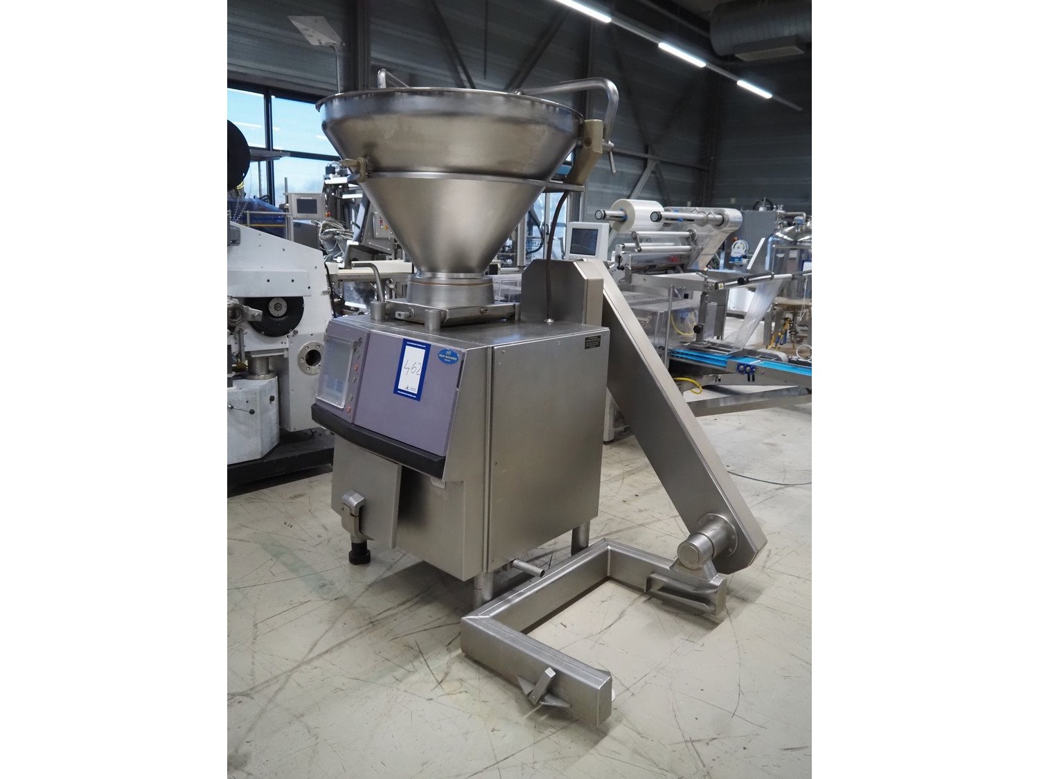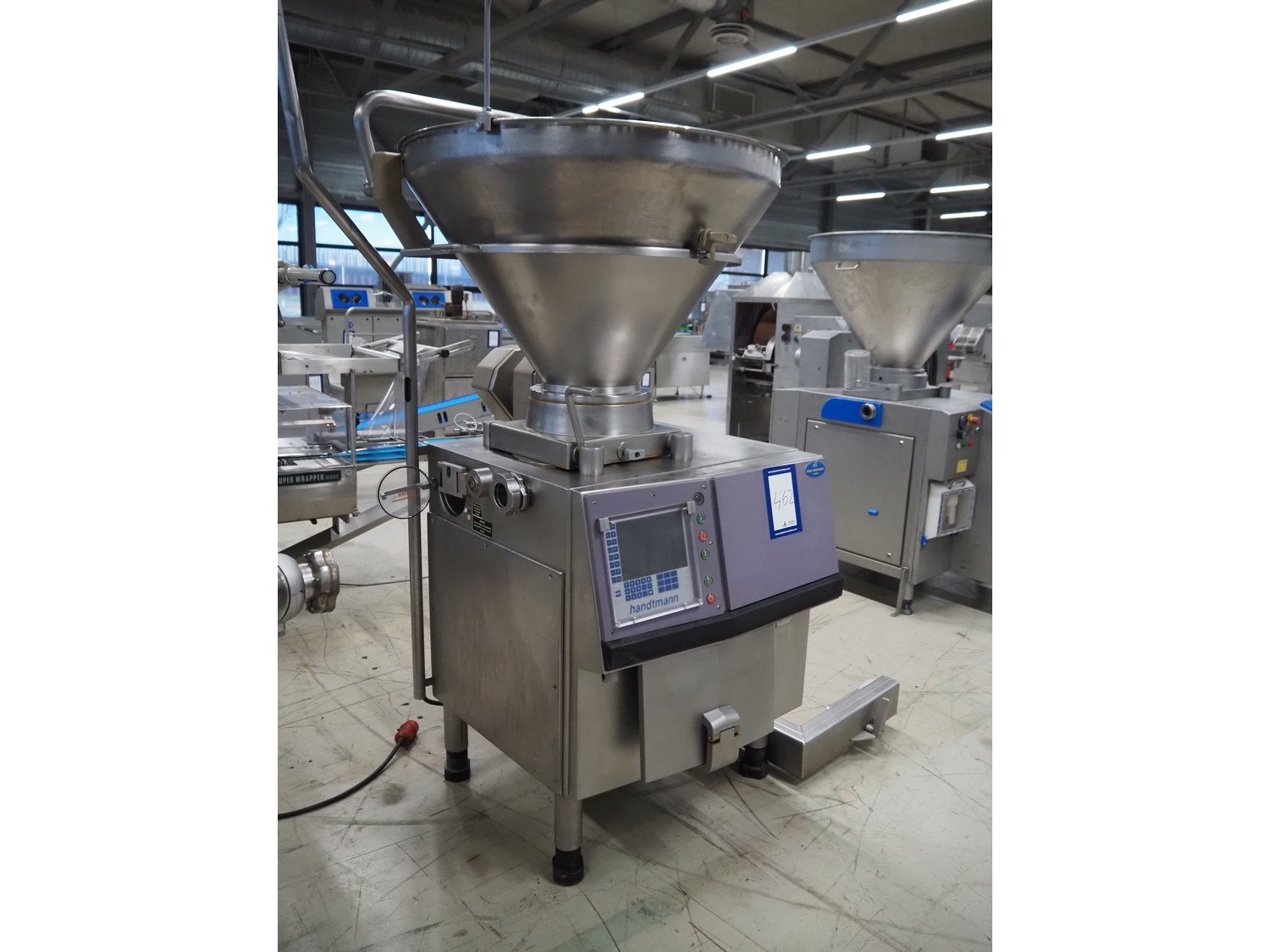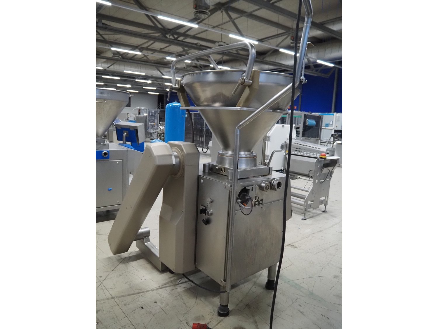 Handtmann vacuum filling machine with lifter for 200 liter meat bins, type: VF200B, number: 4517, year of construction: 1999, 400 V, 50 Hz, 17 A, 6.5 kW, Becker vacuum pump, type: U 1.16 SA-31, capacity: 16/19 m³ per hour, dimensions: 1900 mm x 1320 mm x 2300 mm. Kavel locatie: Looyenbeemd 11, 5652 BH Eindhoven, Nederland