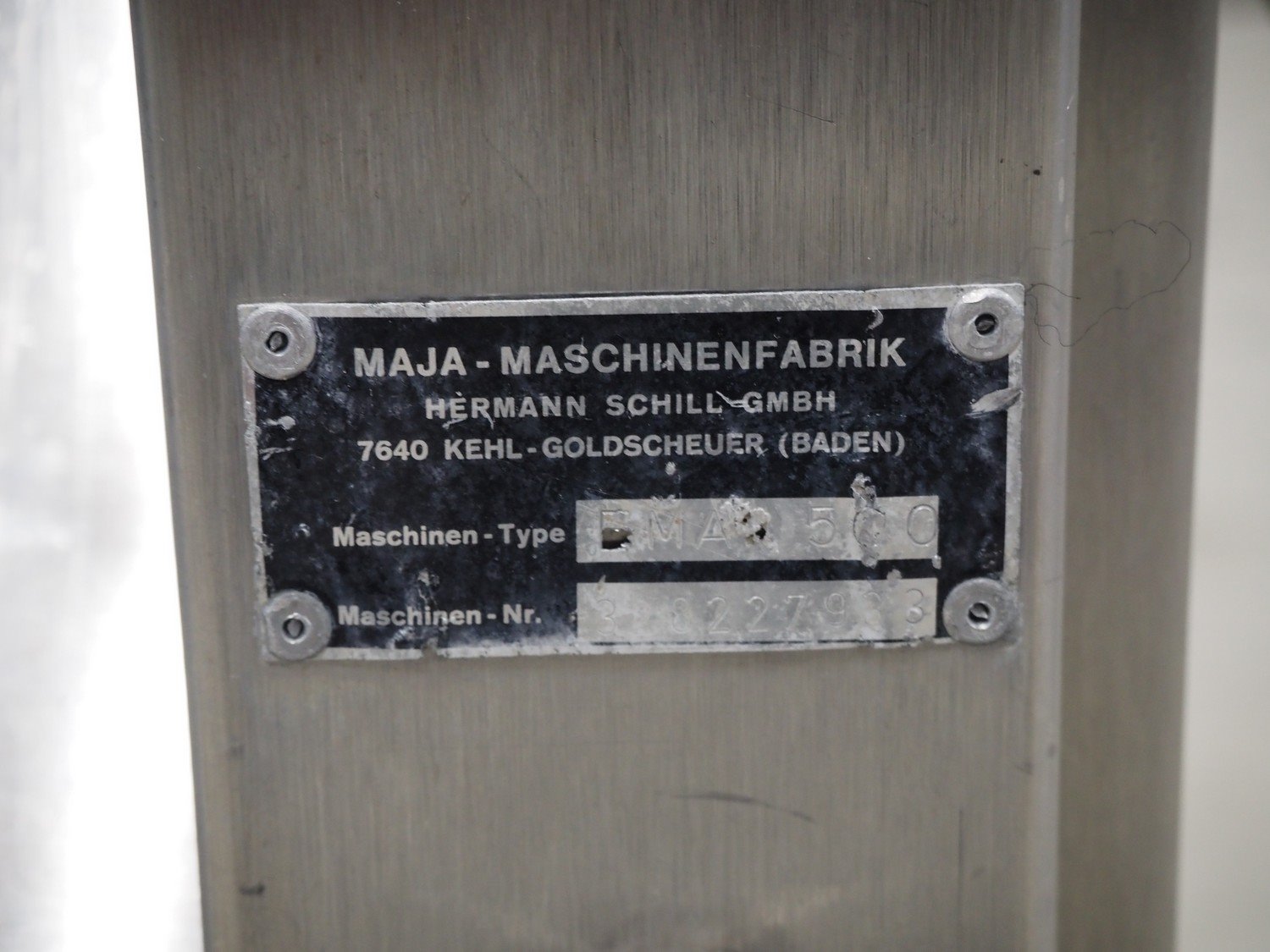Maja-Maschinenfabrik mobile skinning machine, type: EMA 500, machine number: 328227933, working width: 430 mm, total dimensions: 760 mm x 570 mm x 980 mm. Kavel locatie: Looyenbeemd 11, 5652 BH Eindhoven, Nederland