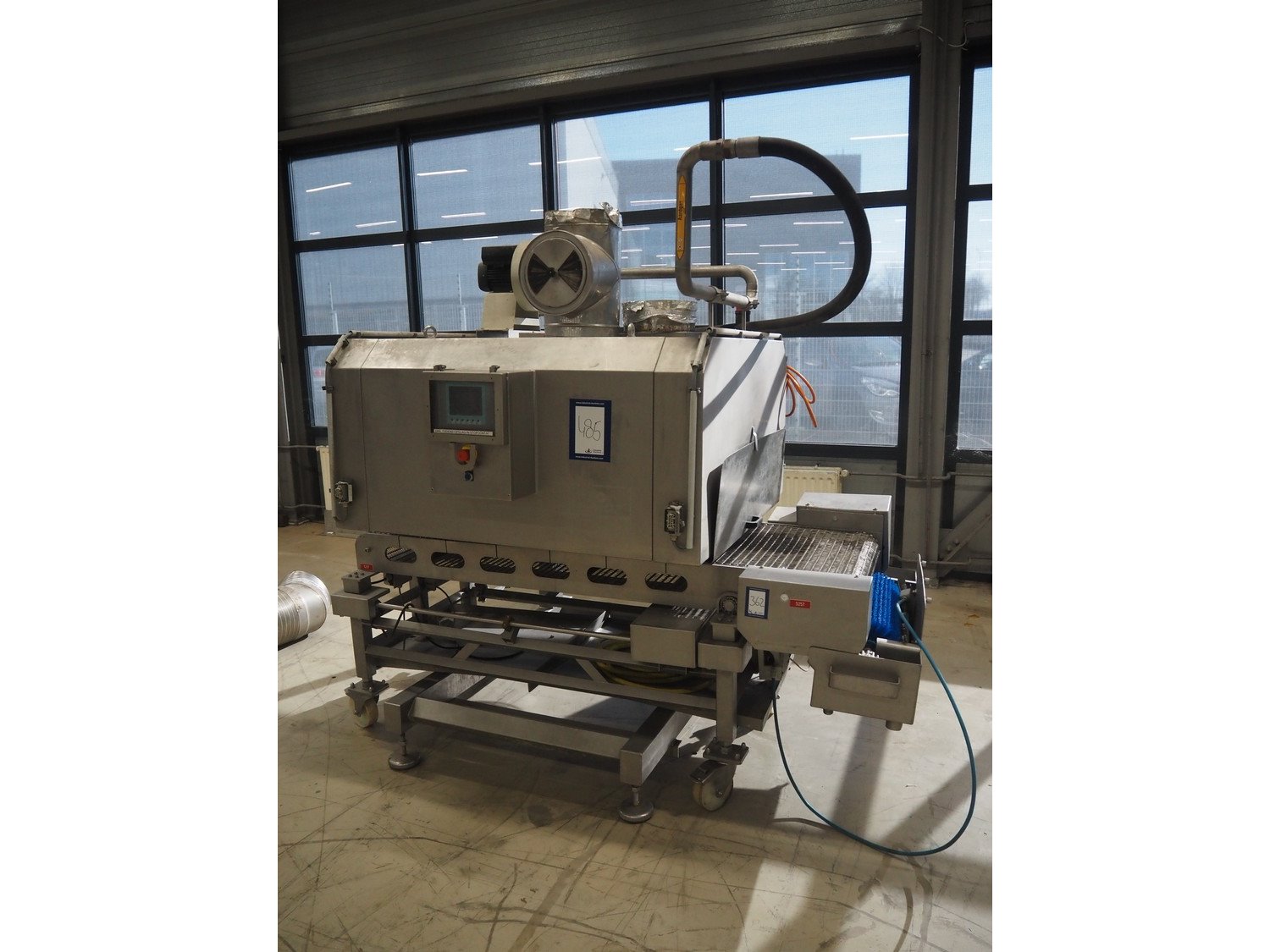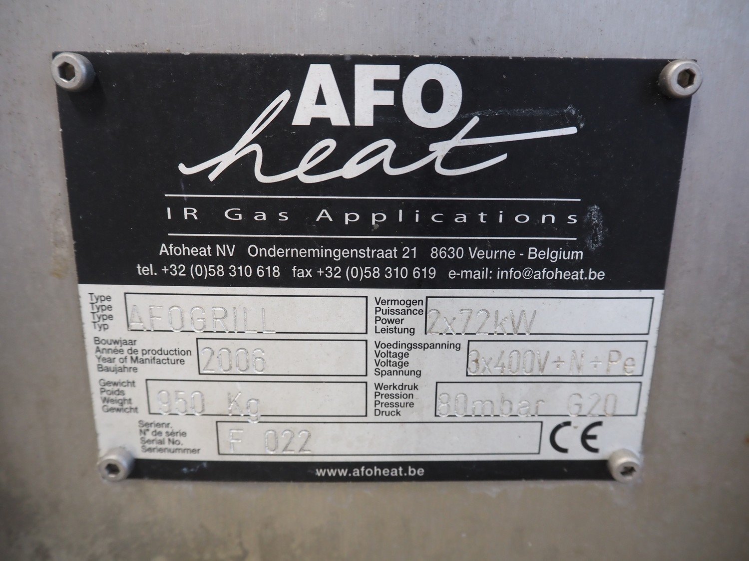 AFO Heat grill, type: AFOGRILL, serial number: F 022, year of construction: 2006, 400 V, 3 Ph, (2x) 72 kW, weight: 950 kg, s/s mesh belt, belt width: 630 mm, clearance: 700 mm x 220 mm, total dimensions: 2350 mm x 1800 mm x 2210 mm. Kavel locatie: Looyenbeemd 11, 5652 BH Eindhoven, Nederland