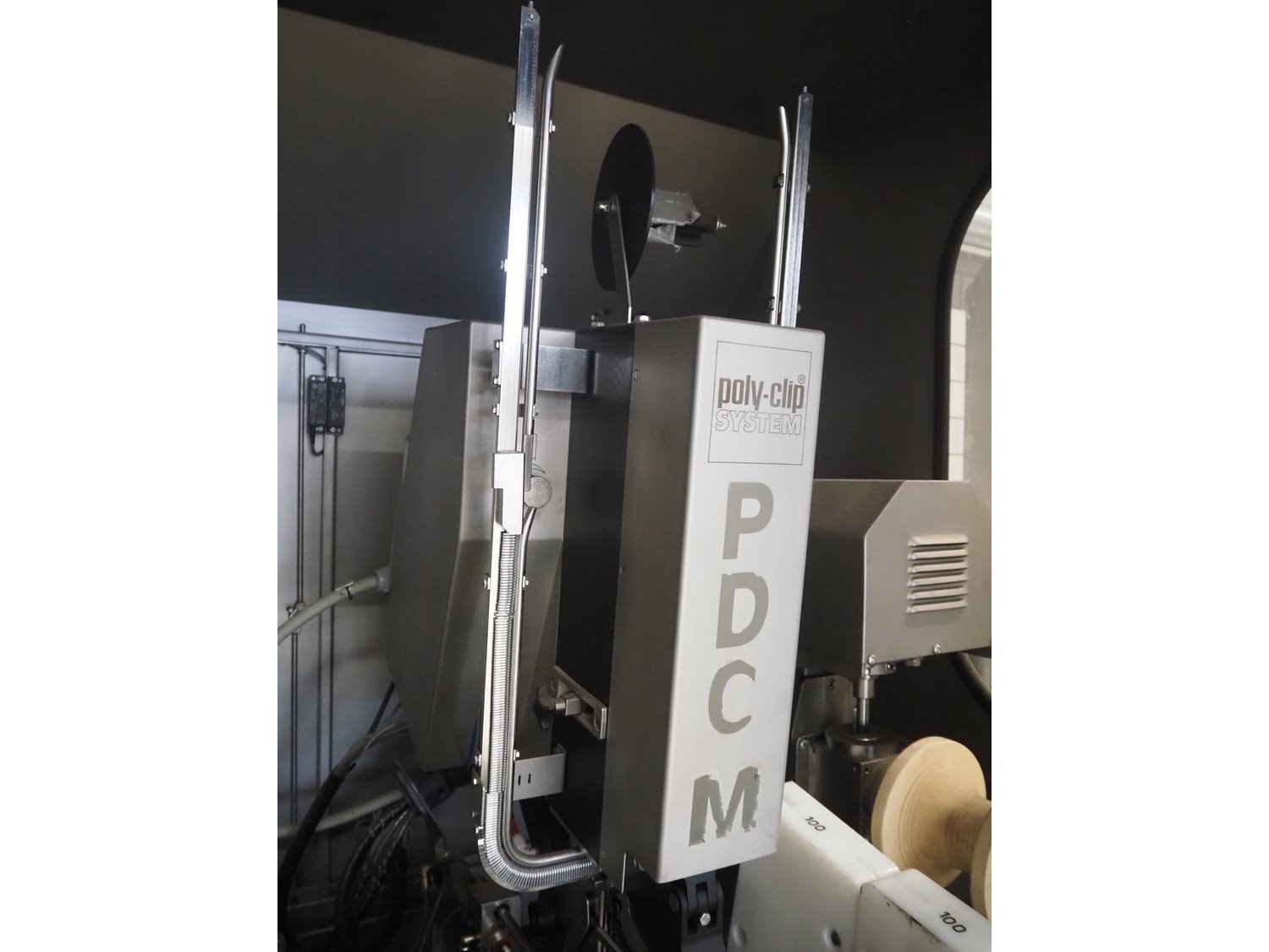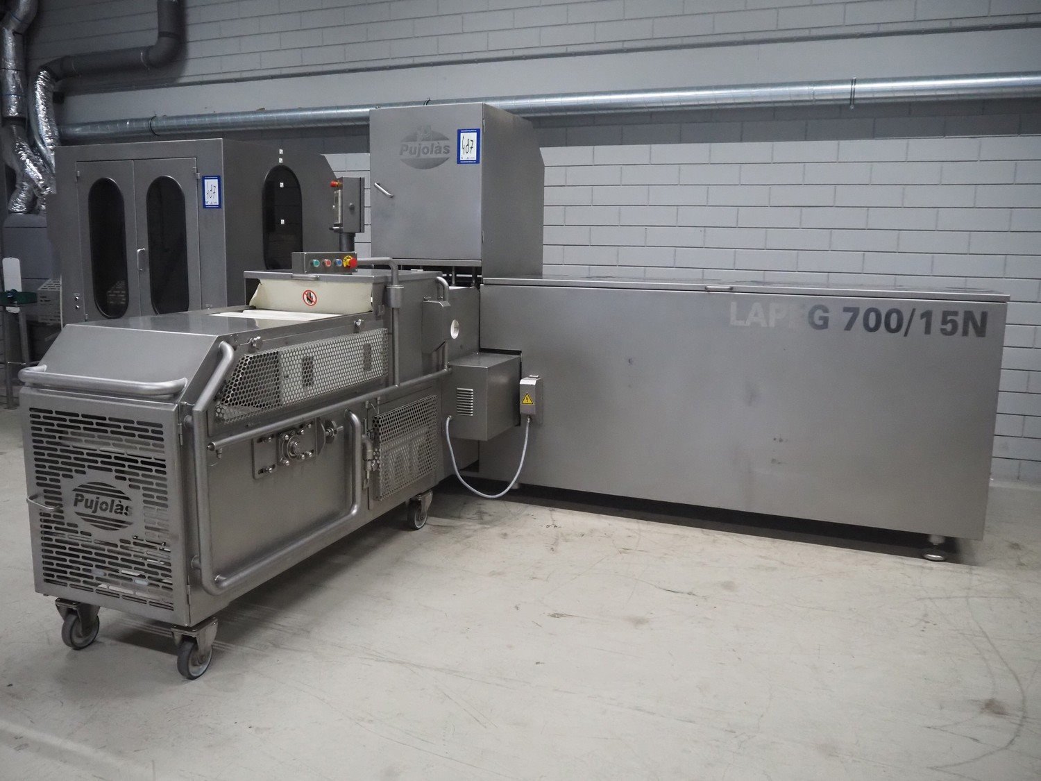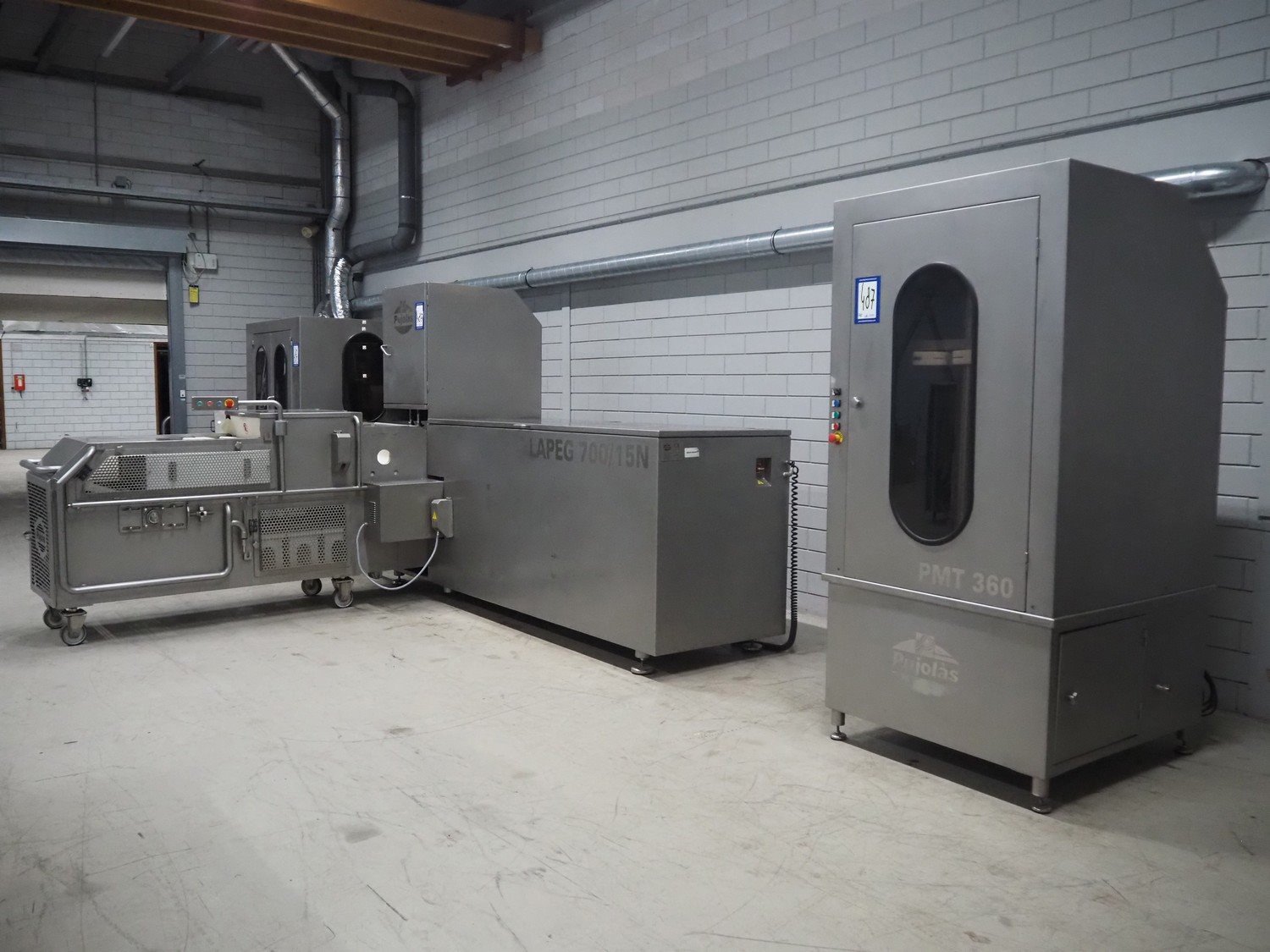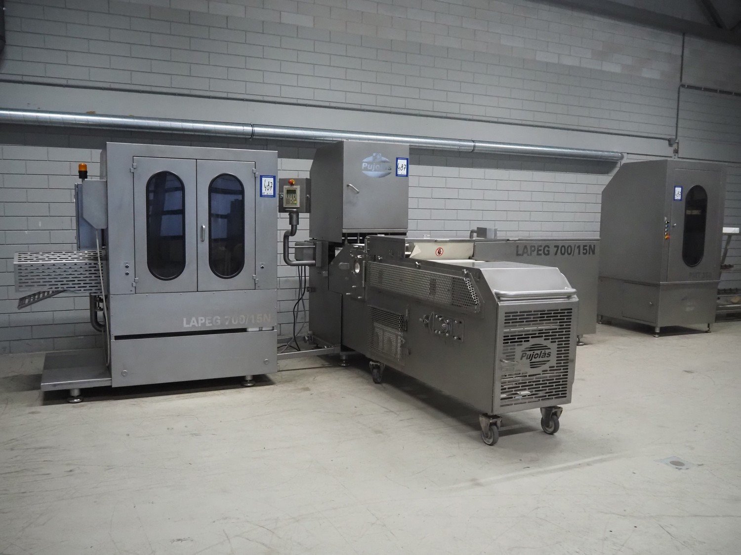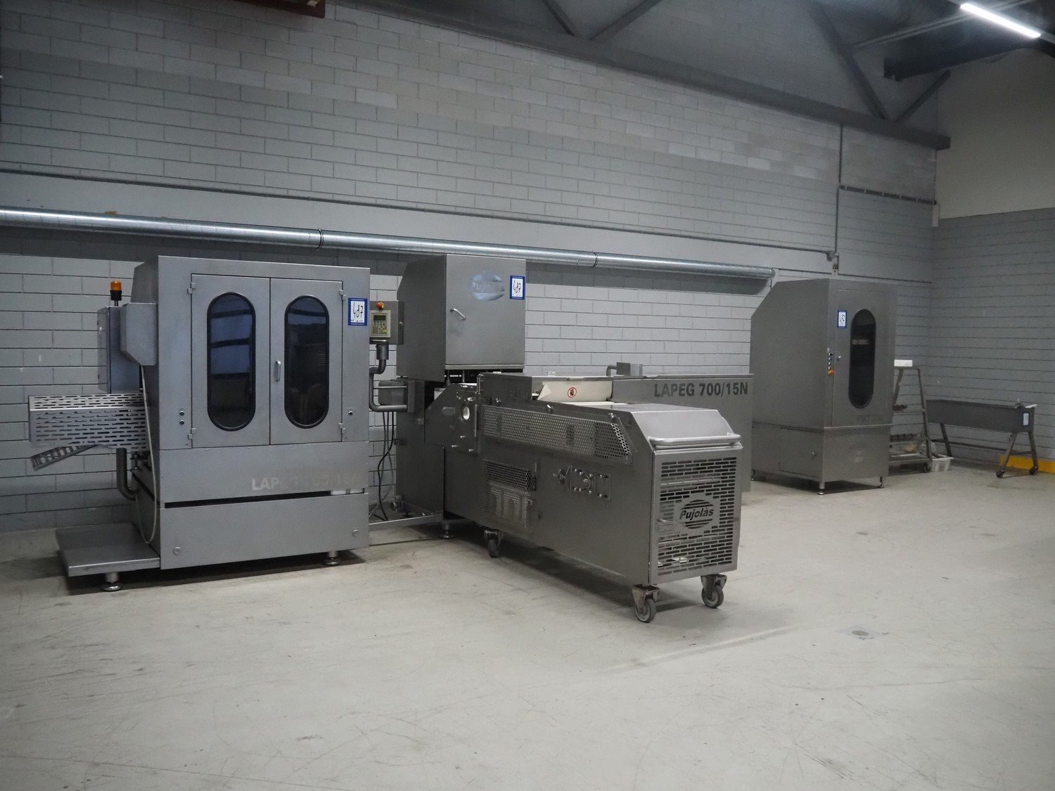 Pujolàs automatic filling and clipping machine, consisting of: Pujolàs automatic filling and clipping machine, model filling machine: LAPEG 700/15N, serial number: 051257, year of construction: 2012, 400 V, diameter filling pipe: 100 mm, plastic belt, belt width: 160 mm, including Poly-Clip Systems double clipper, type: PDC M 700, number: 011/12, 4-6 bar, total dimensions: 7500 mm x 3100 mm x 2320 mm and 2 s/s trolleys with parts, dimensions: 1430 mm x 750 mm x 900 mm and 900 mm x 800 mm x 1400 mm and Pujolàs automatic netting machine, model: PMT 360, serial number: 051222, year of construction: 2012, 220 V, weight: 270 kg, dimensions: 1160 mm x 1210 mm x 2380 mm. Kavel locatie: Looyenbeemd 11, 5652 BH Eindhoven, Nederland